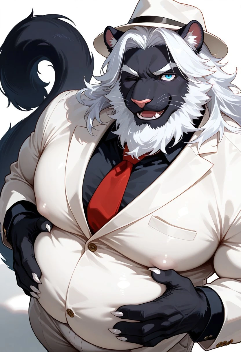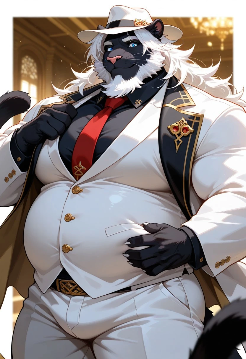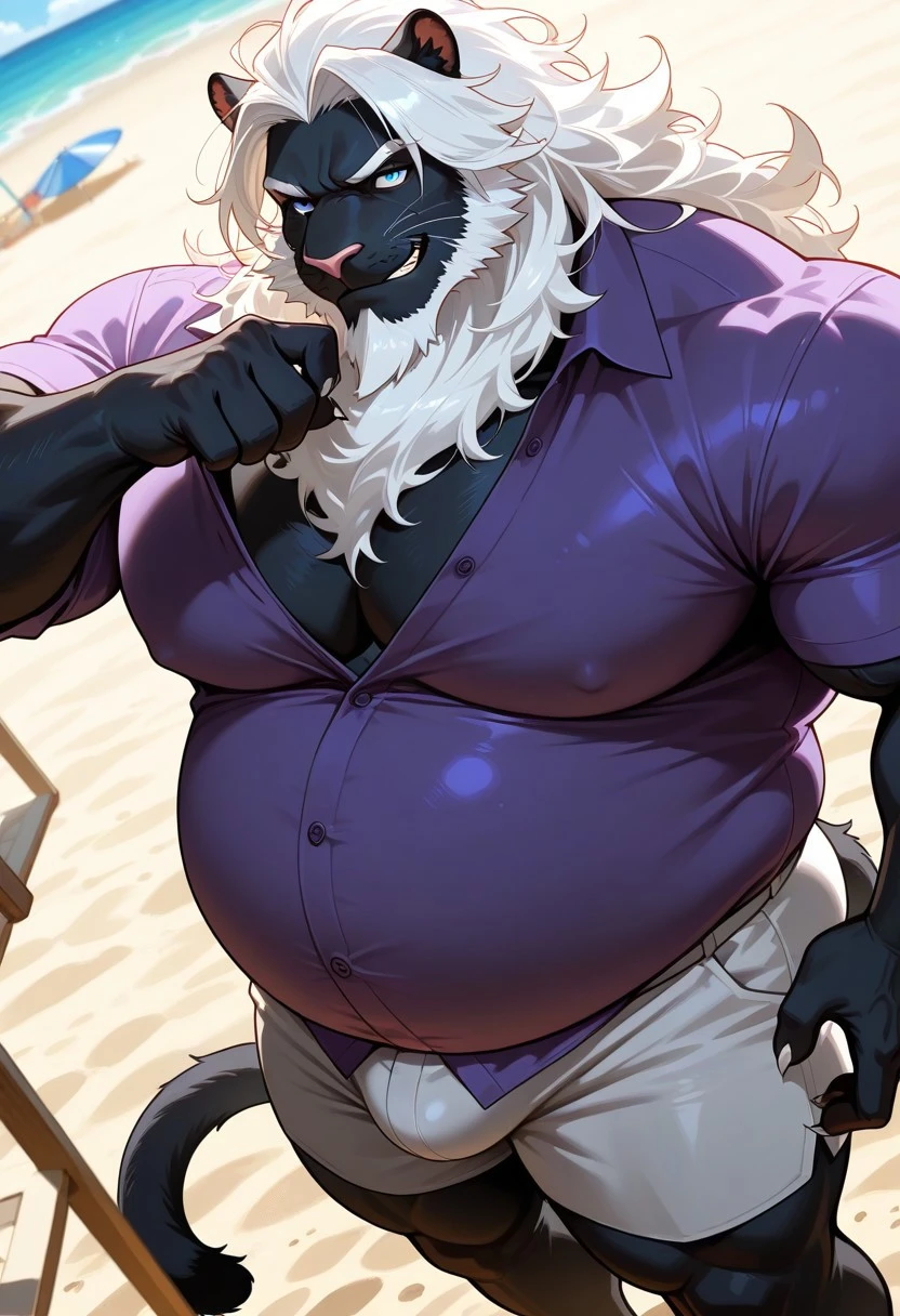 For this character: Milo,panther ,feline,,grumpy face, White hair , long hair , fluffy hair ,black fur, Pink nose,masculine, pudgy, fat, chubby,overweight,soft body,big belly, large tail, feline tail ,long beard, blue eyes,