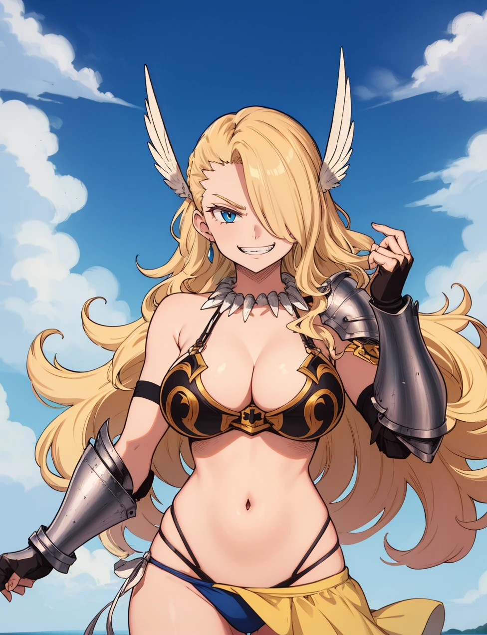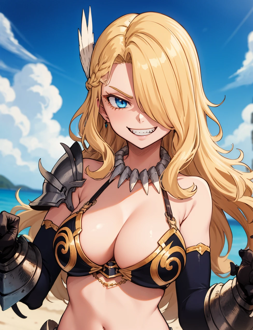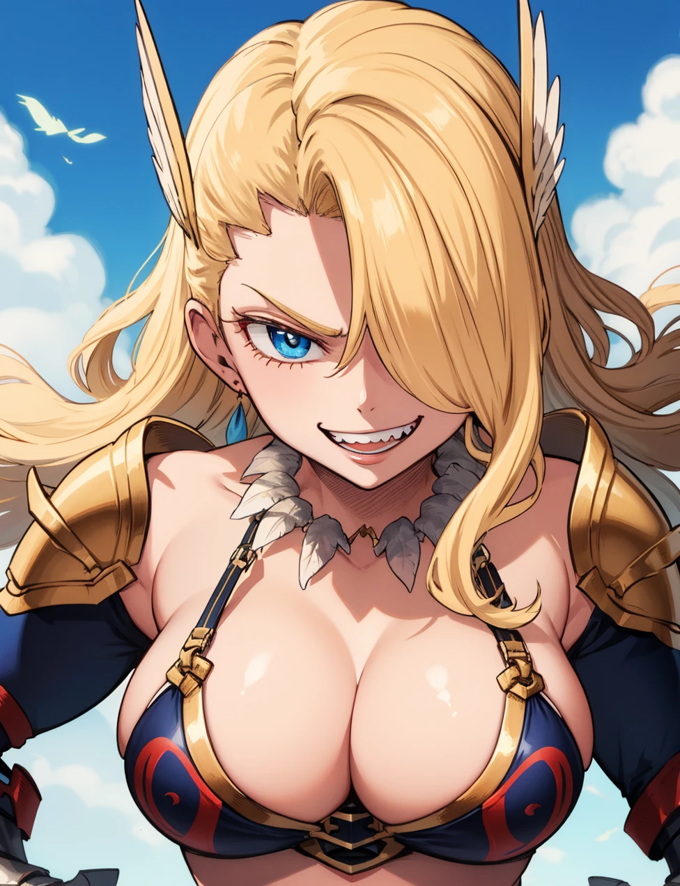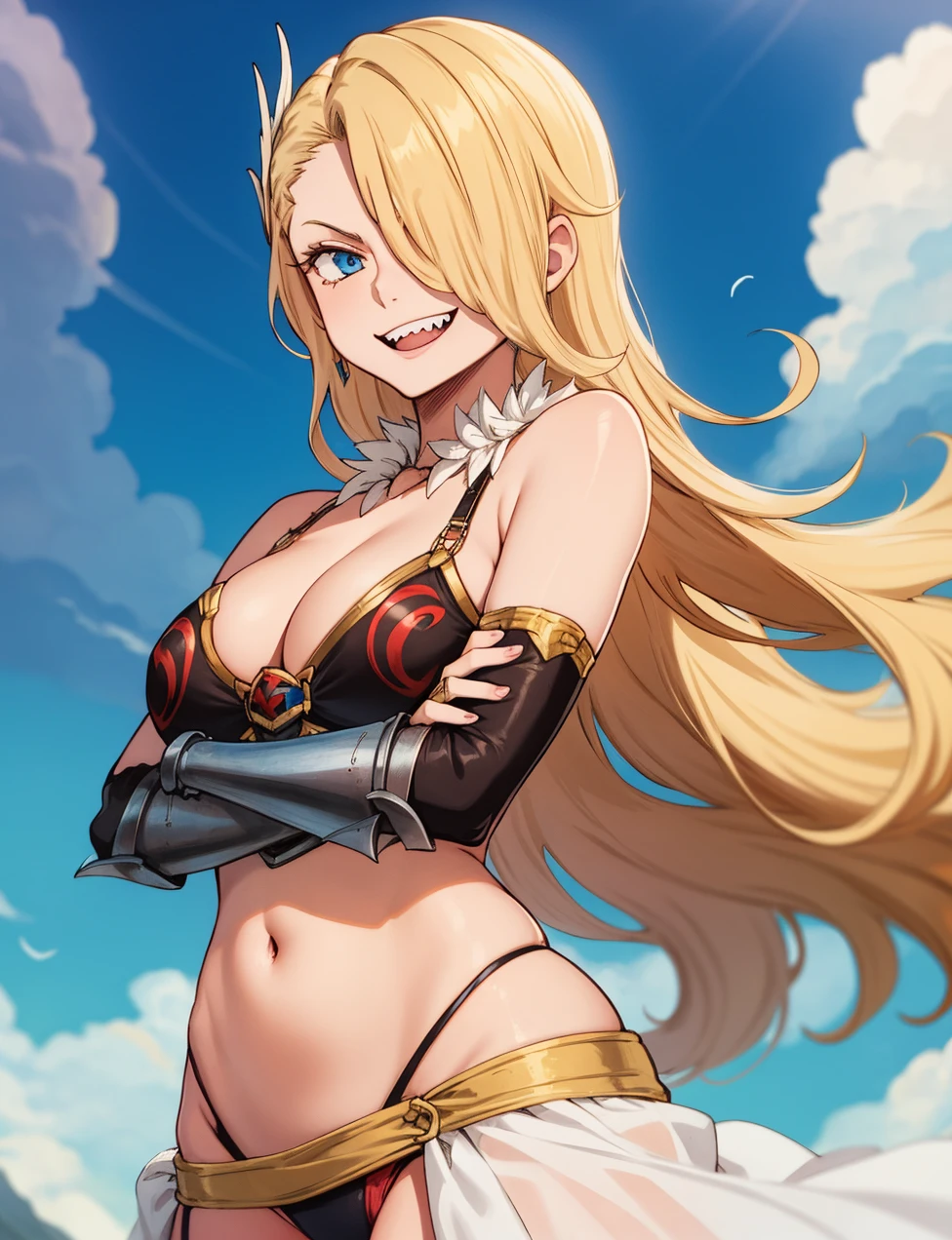 ftkiria,blonde hair, blue eyes, long hair, hair over one eye, hair feather,{sadistic grin|smile}