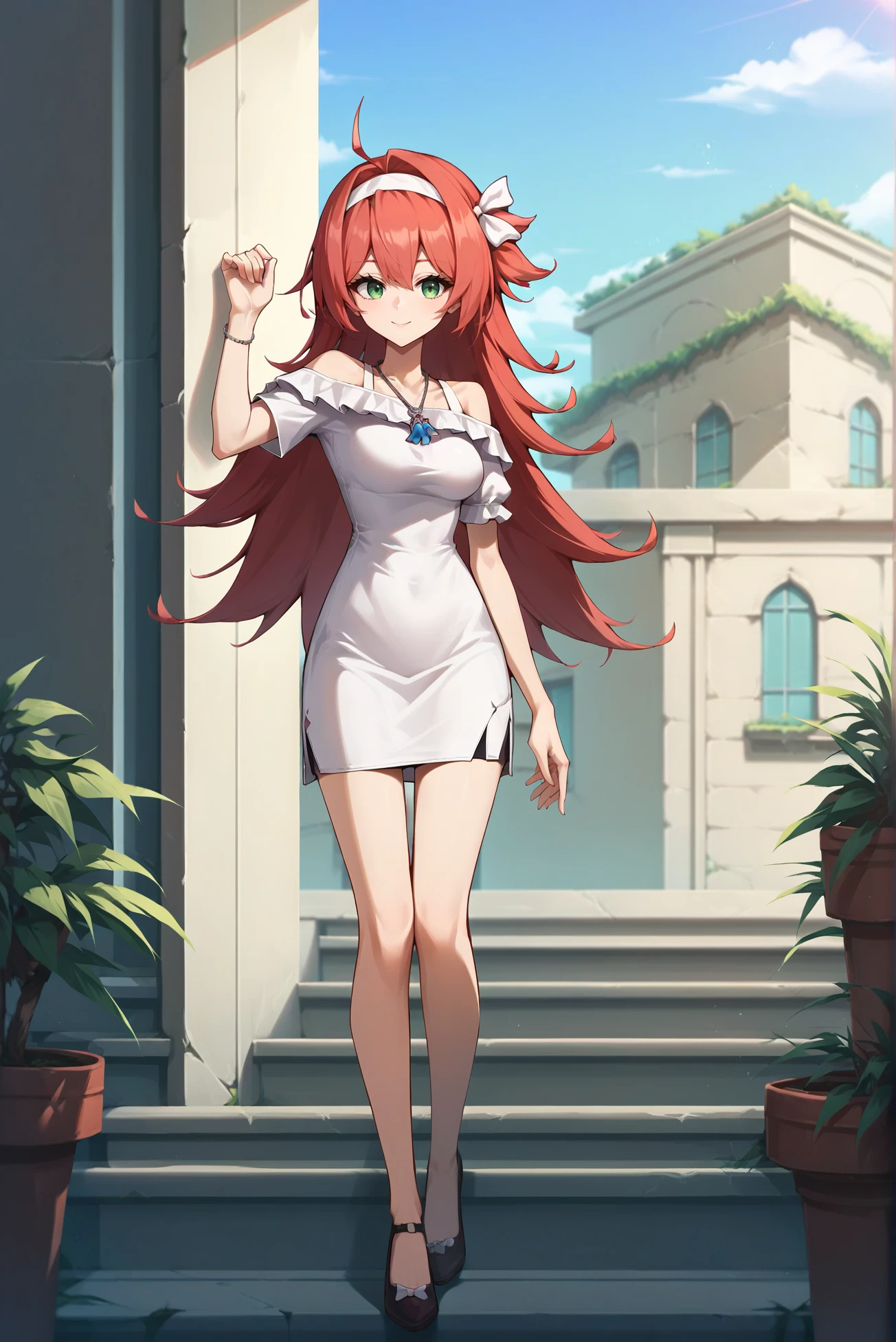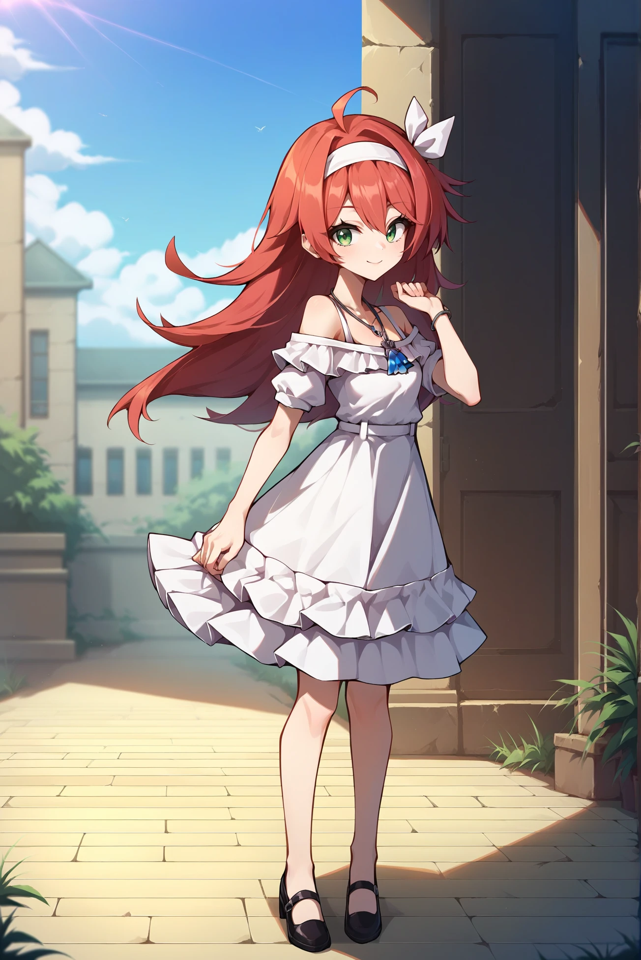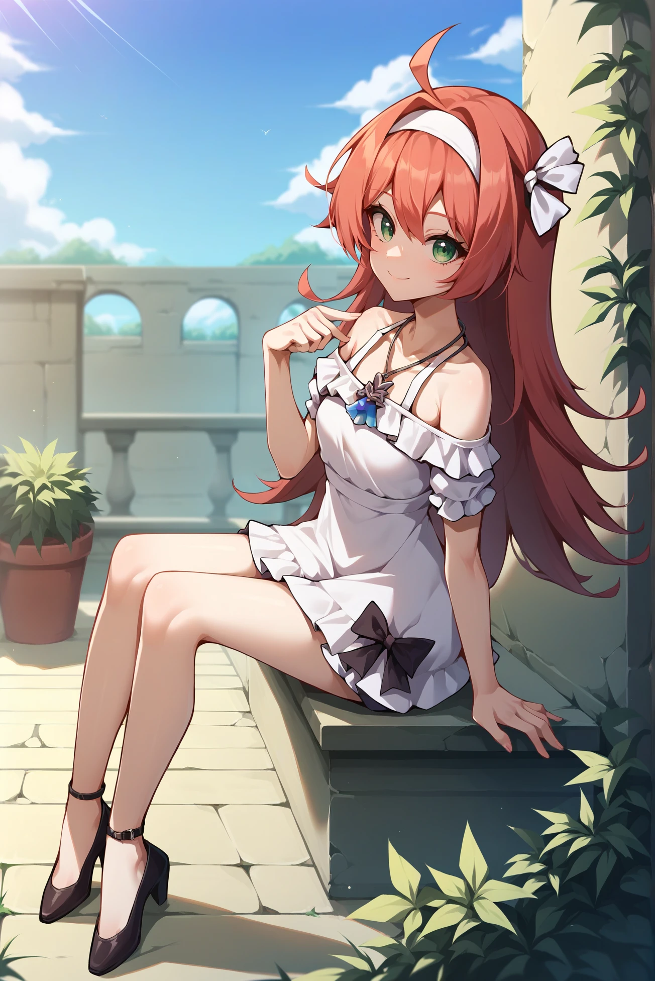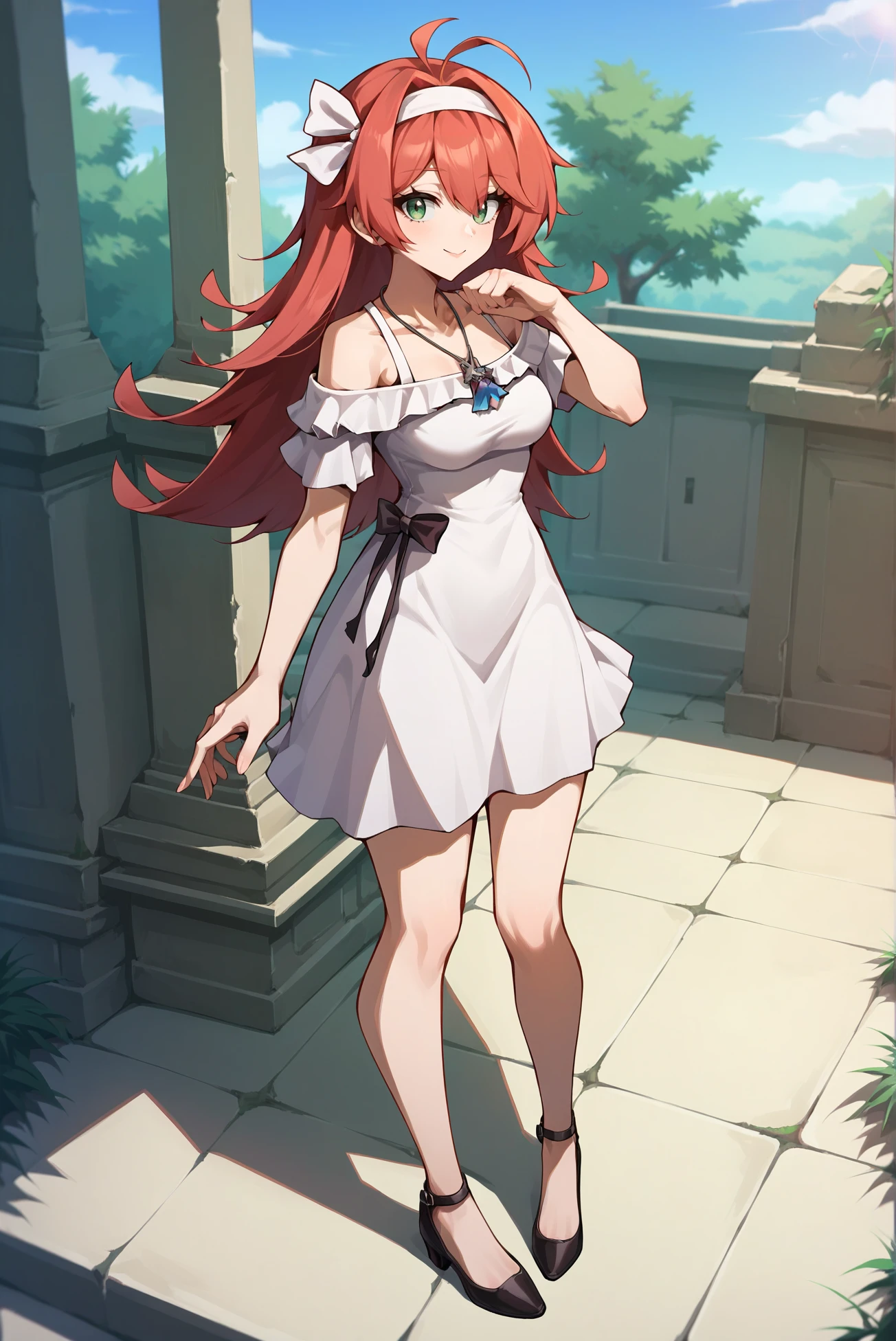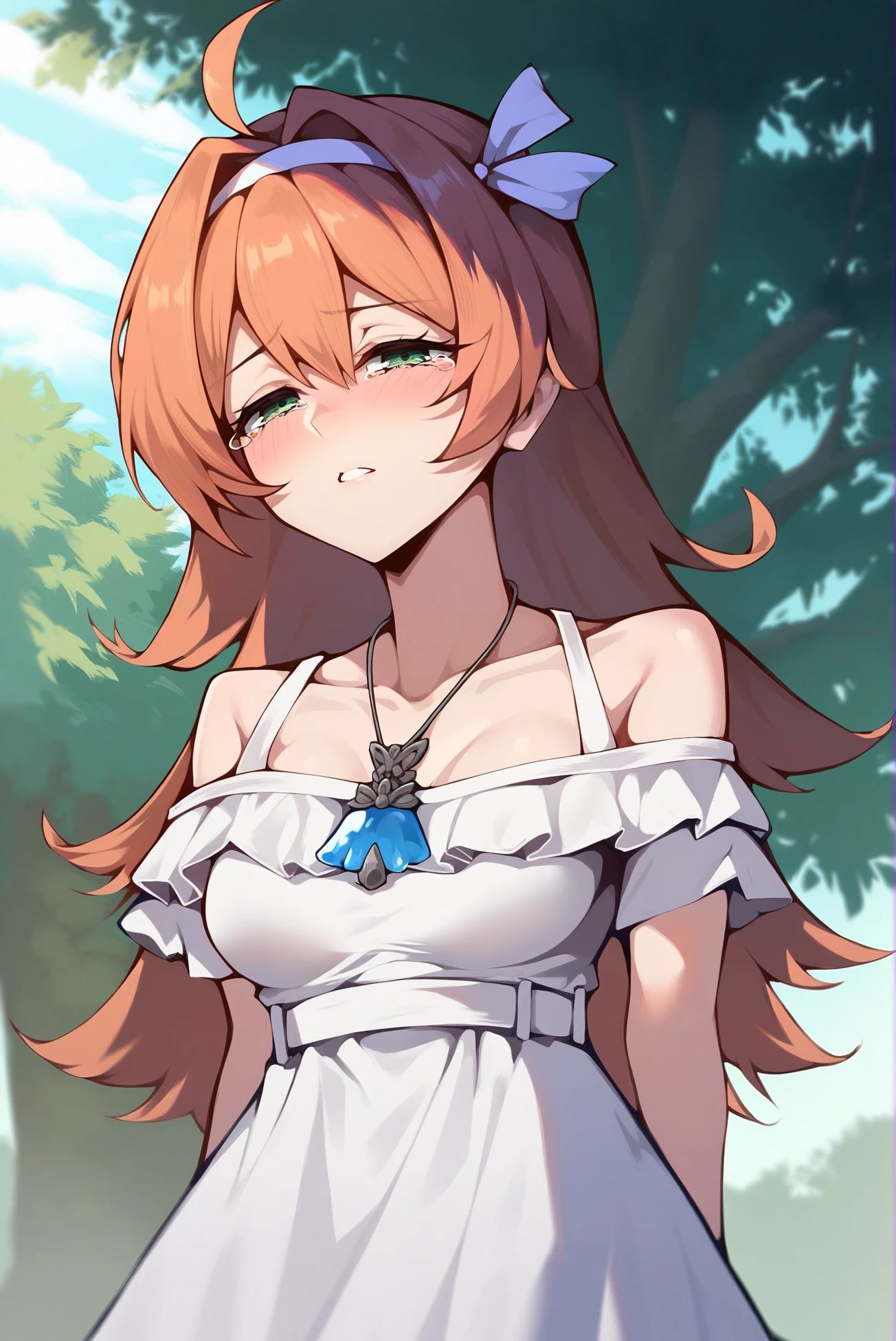 Outfit: white dress, necklace, short sleeves, off shoulder, short dress, frilled dress, hairband, hair ribbon