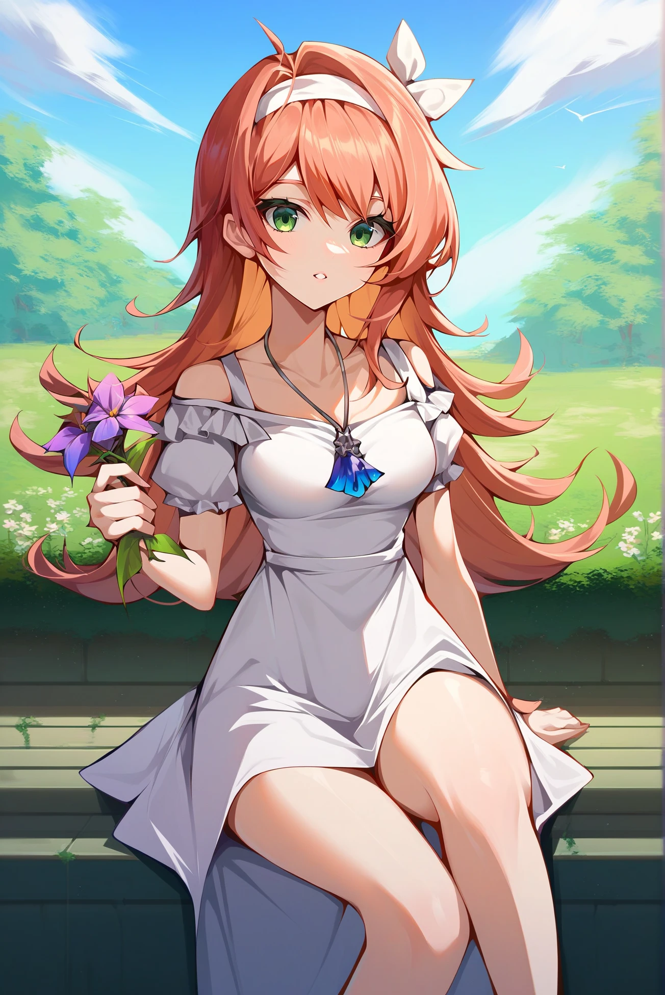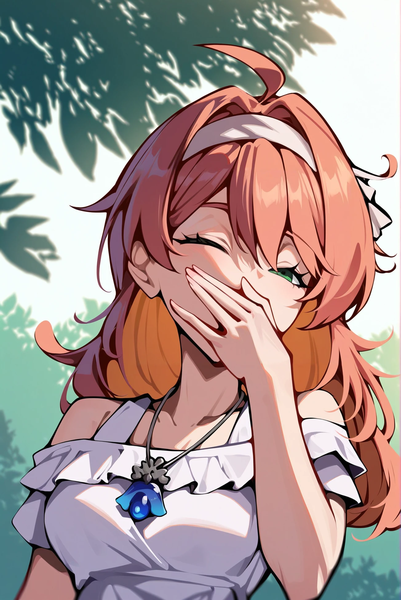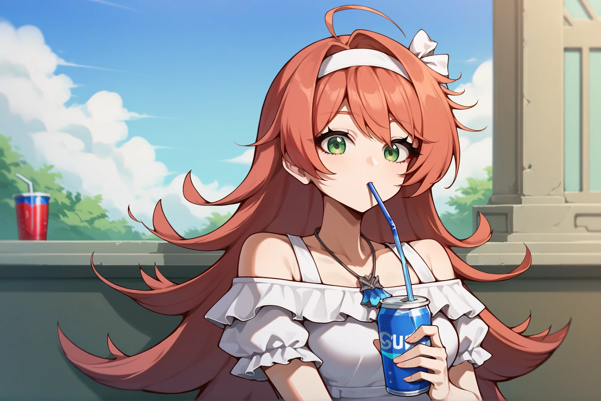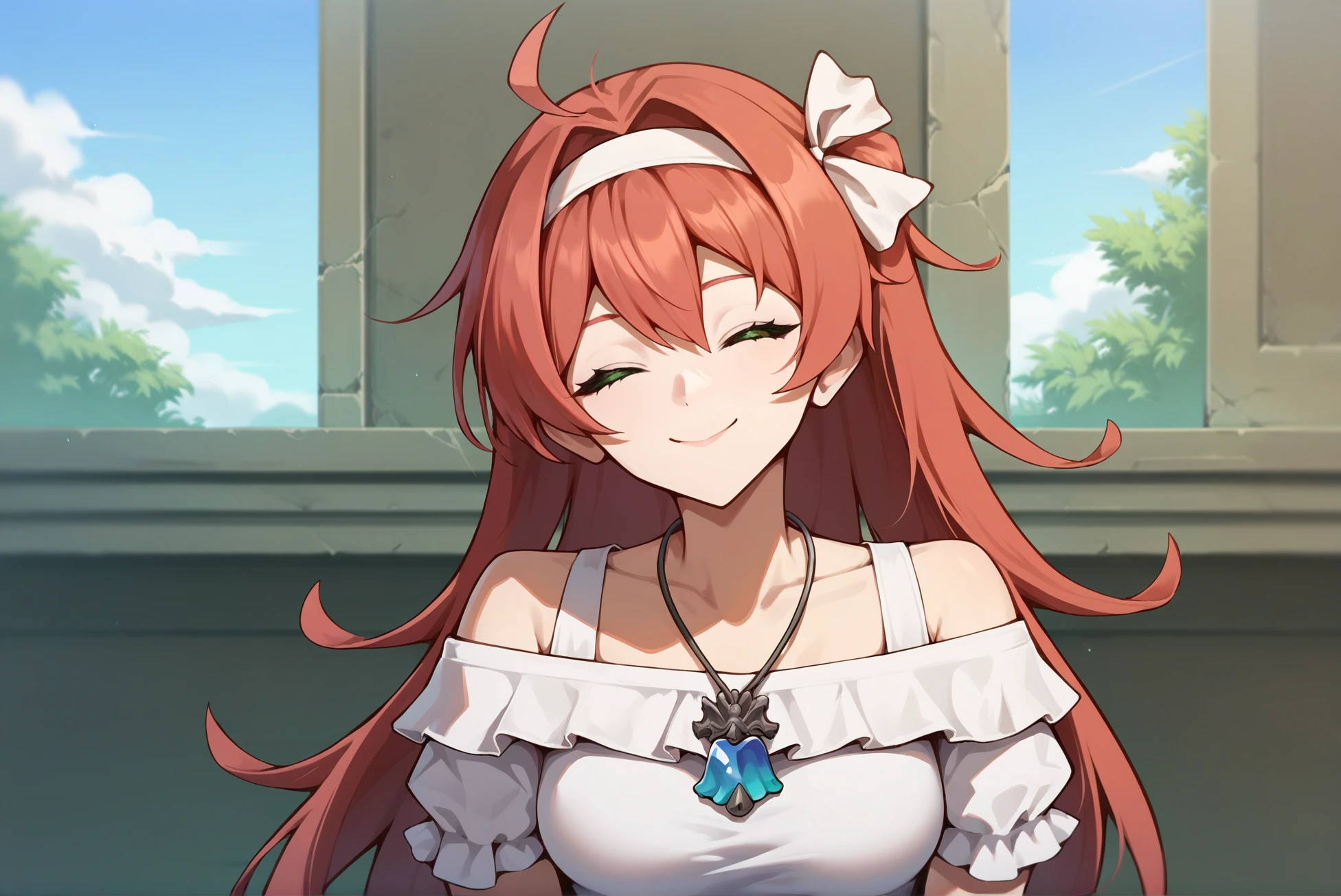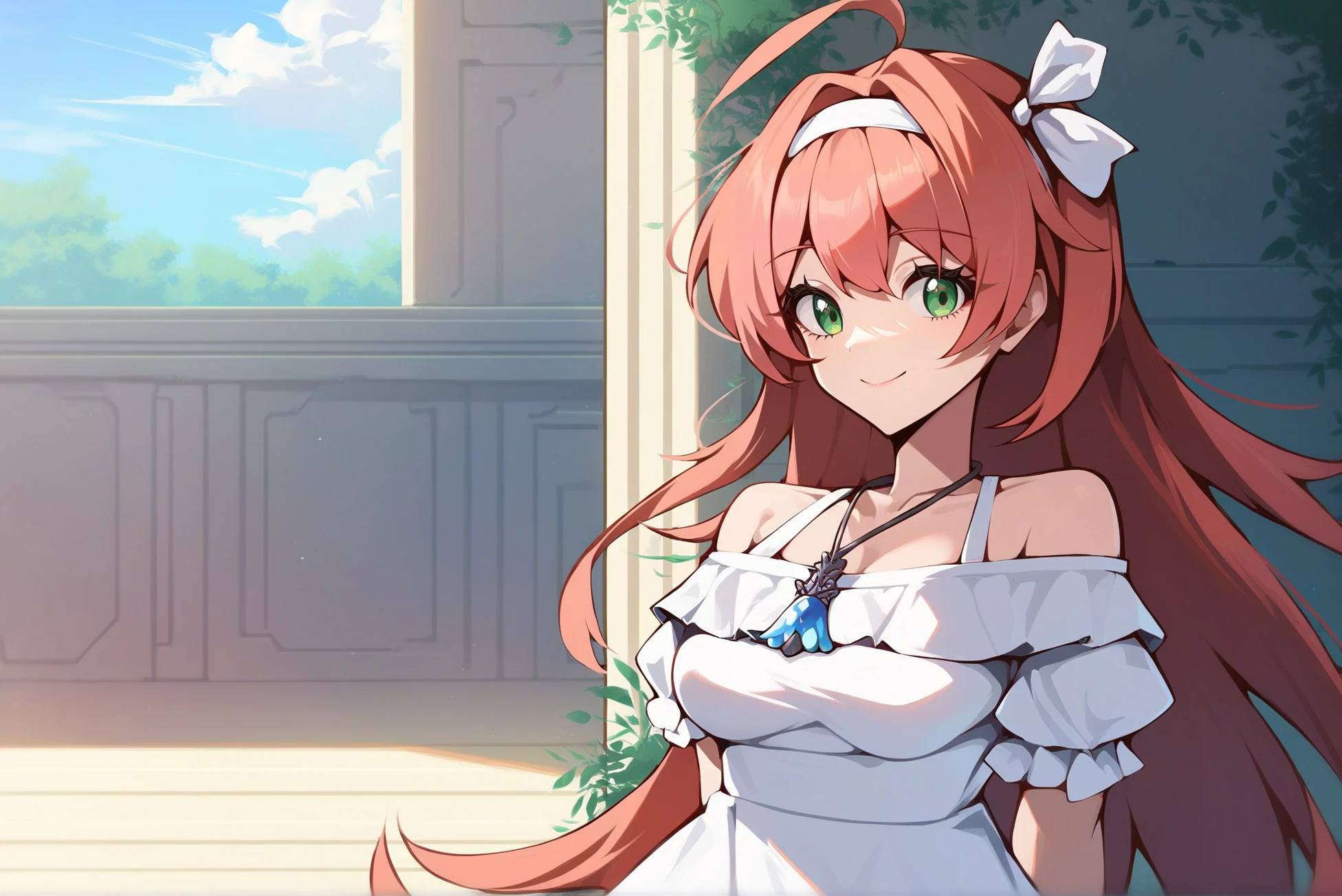 Outfit: white dress, necklace, short sleeves, off shoulder, short dress, frilled dress, hairband, hair ribbon