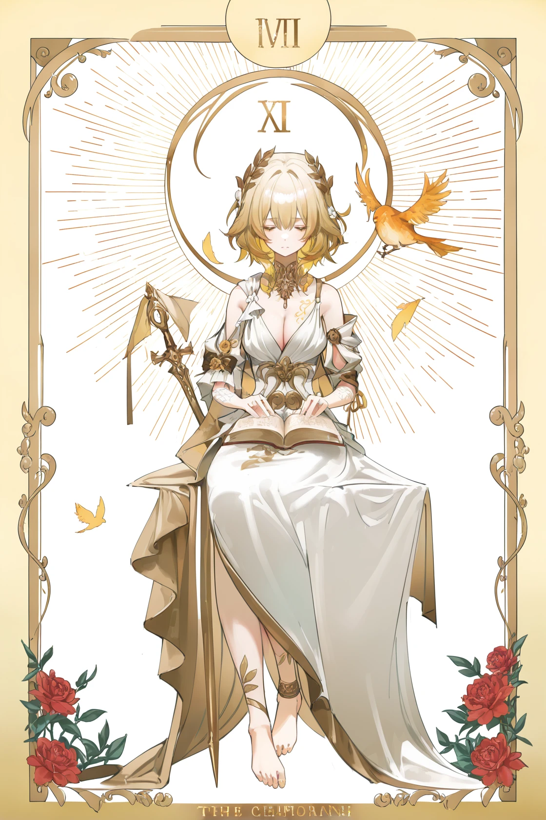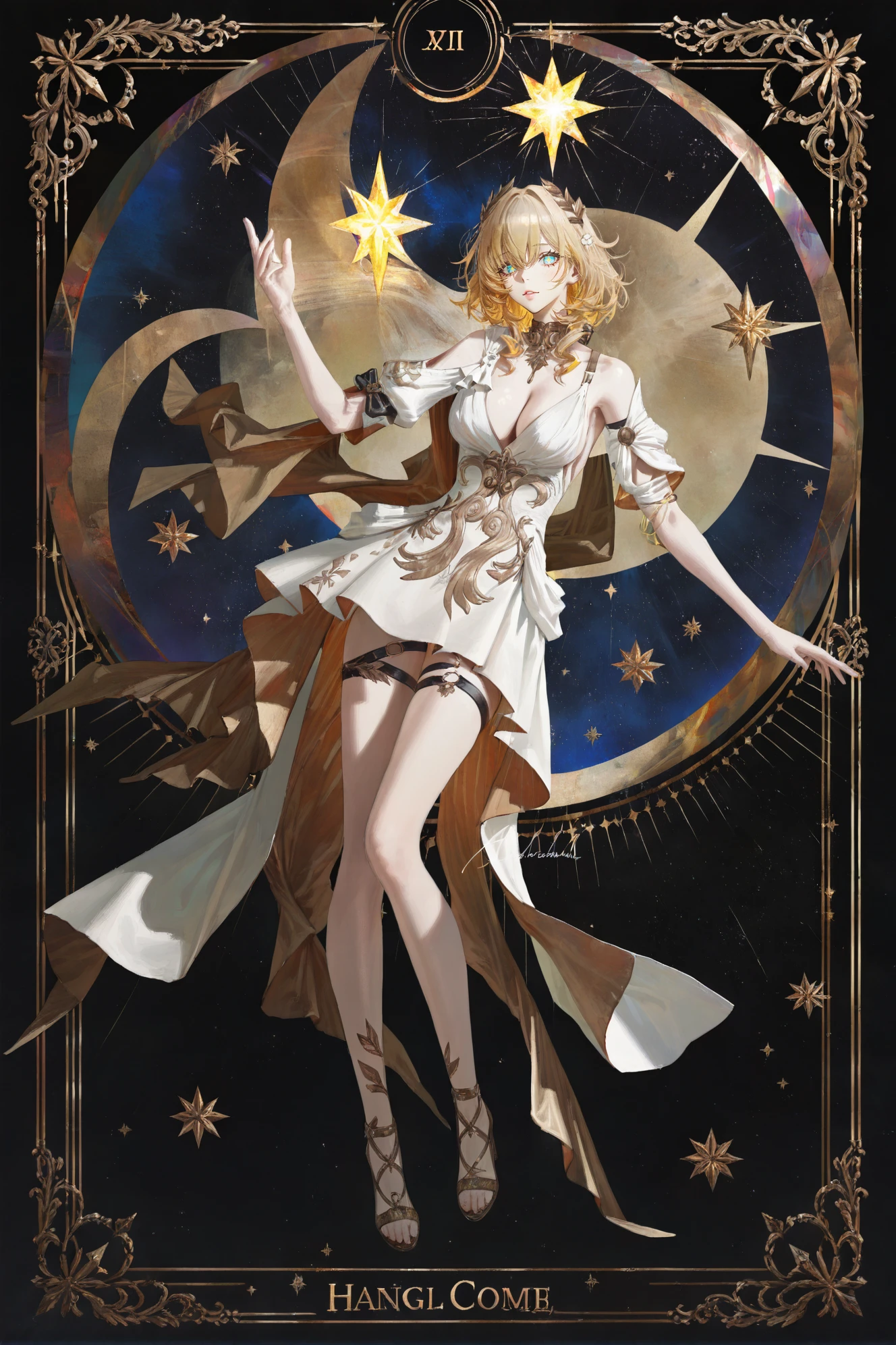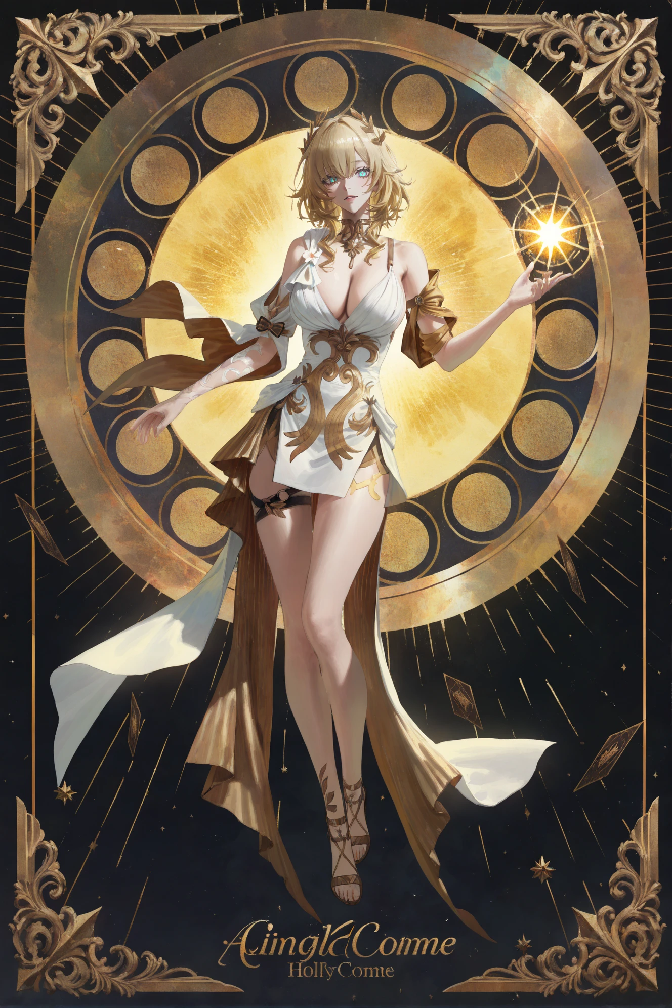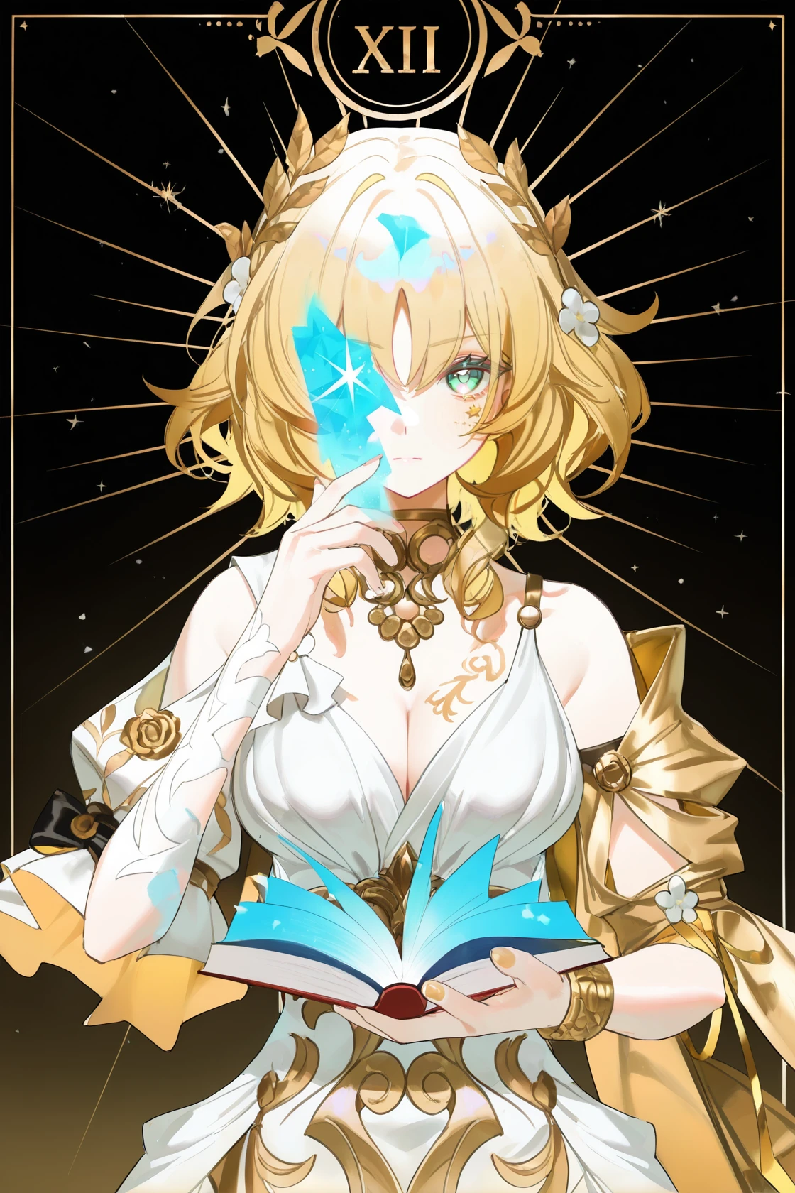 Aglaea \(Honkai: Star Rail\), clothes: Aglaea def white dress, 1girl, blonde hair, breasts, cleavage