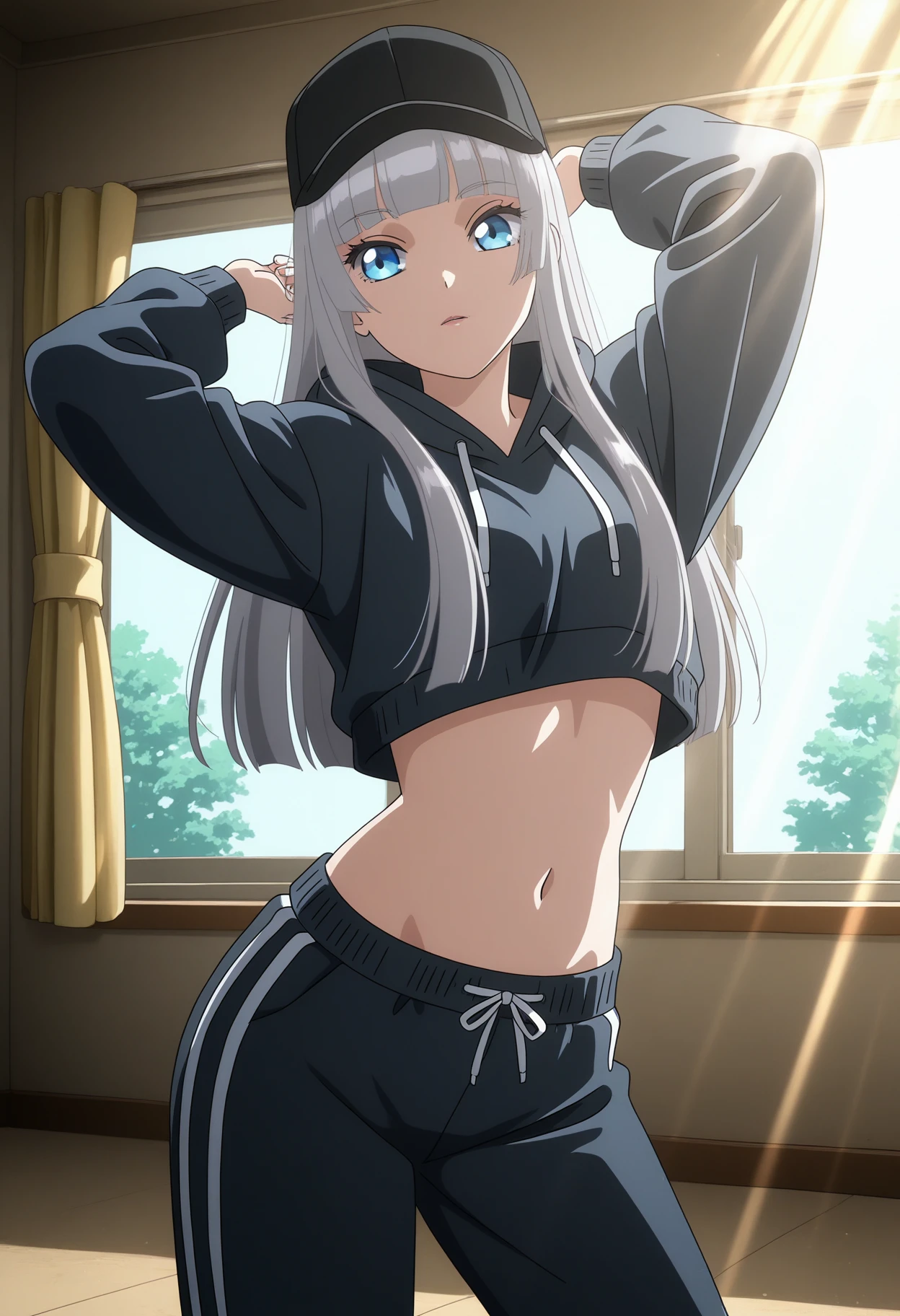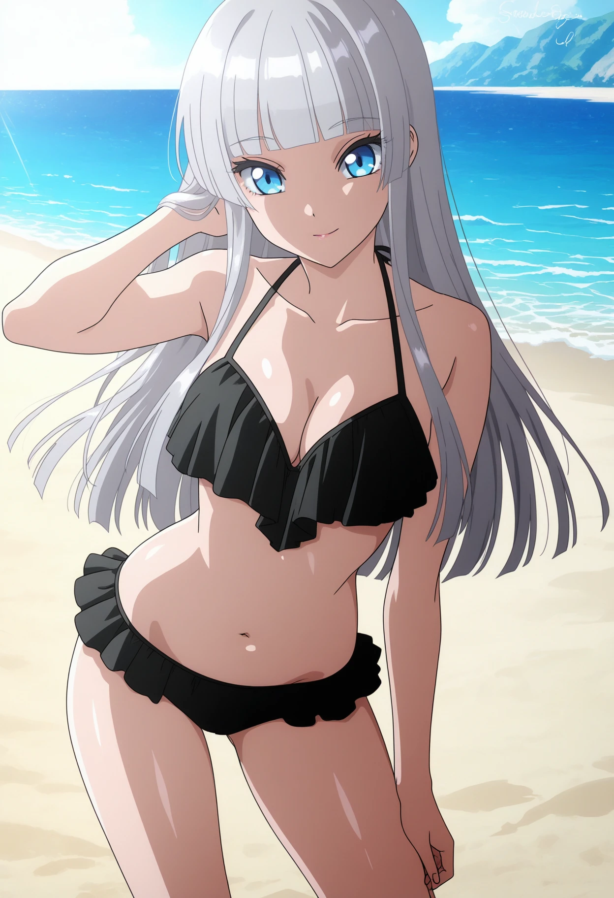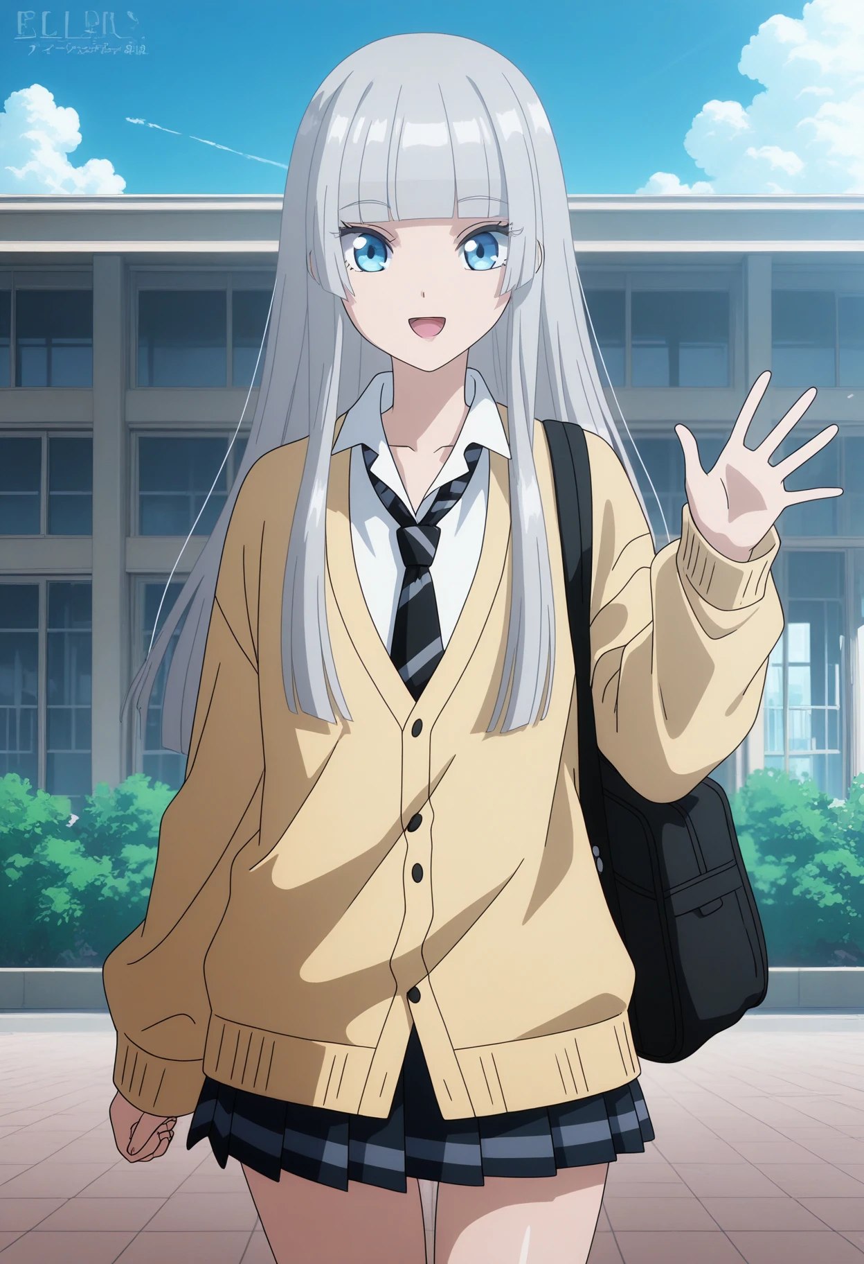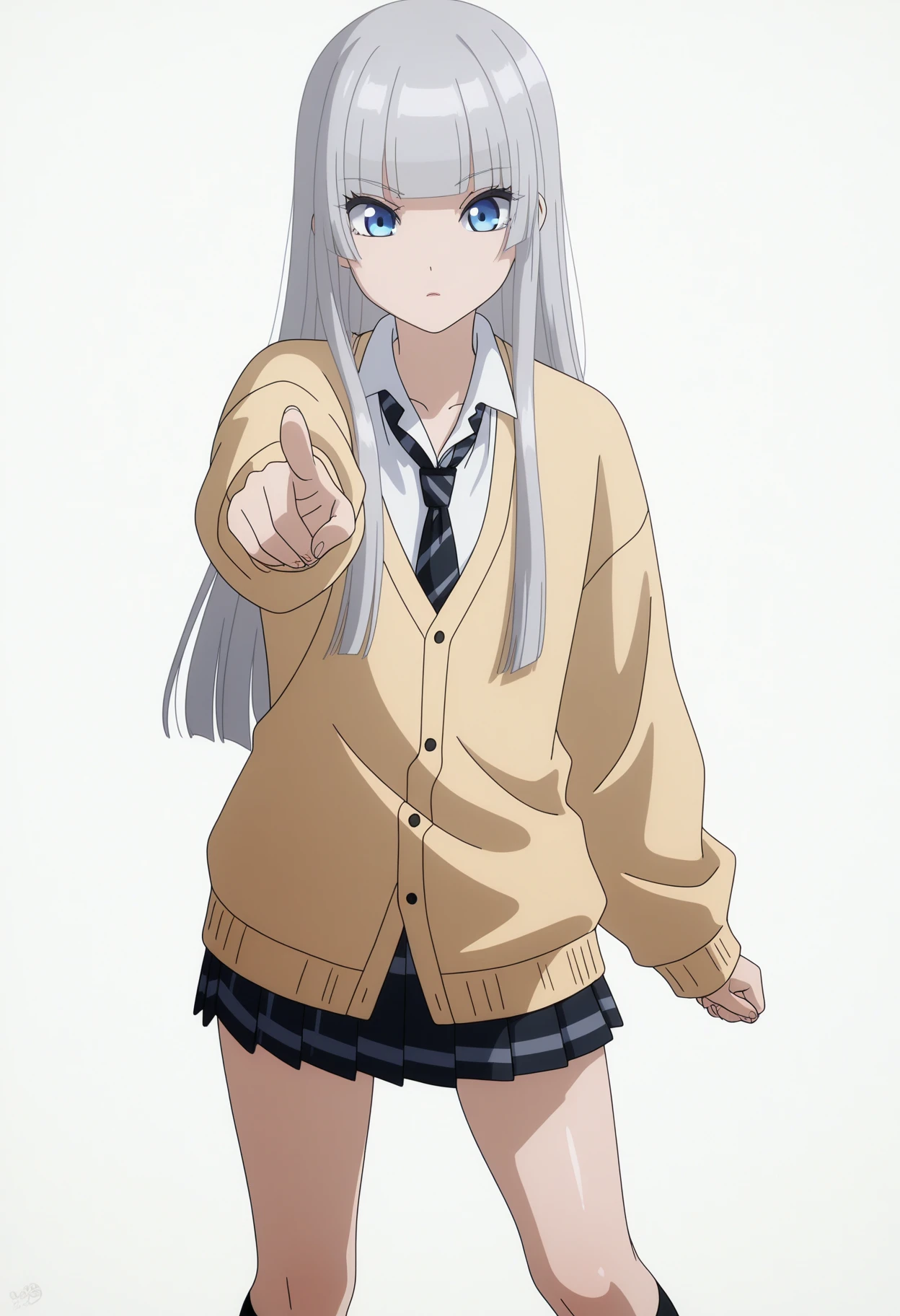 hikaruwz, long hair, grey hair, blunt bangs blue eyes, eyelashes, yellow cardigan, long sleeves, collared shirt, white shirt, necktie, miniskirt, blue skirt, pleated skirt, black socks, school uniform