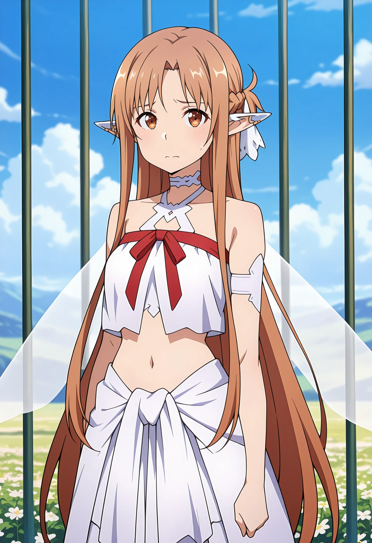 AsunaTitania, parted bangs, short ponytail, french braid, very long hair, brown hair, brown eyes, pointy ears, ear covers, hair ribbon, white ribbon, transparent wings, white wings, white choker, halterneck, strapless shirt, white shirt, red ribbon, crop top overhang, arm strap, midriff, navel, long skirt, white skirt