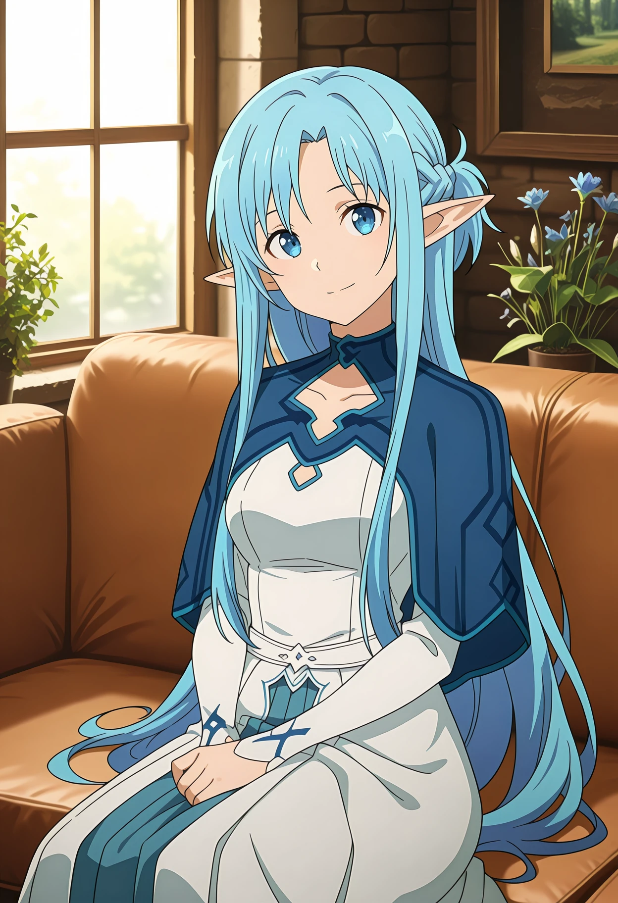 AsunaALOCasual, parted bangs, short ponytail, french braid, very long hair, blue hair, blue eyes, long pointy ears, collarbone, clothing cutout, blue capelet, white dress, long sleeves, long dress, layered dress, pleated dress
