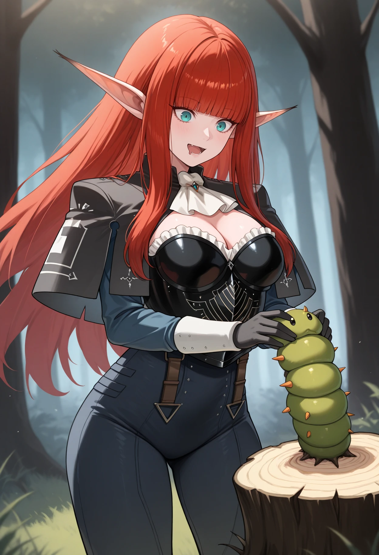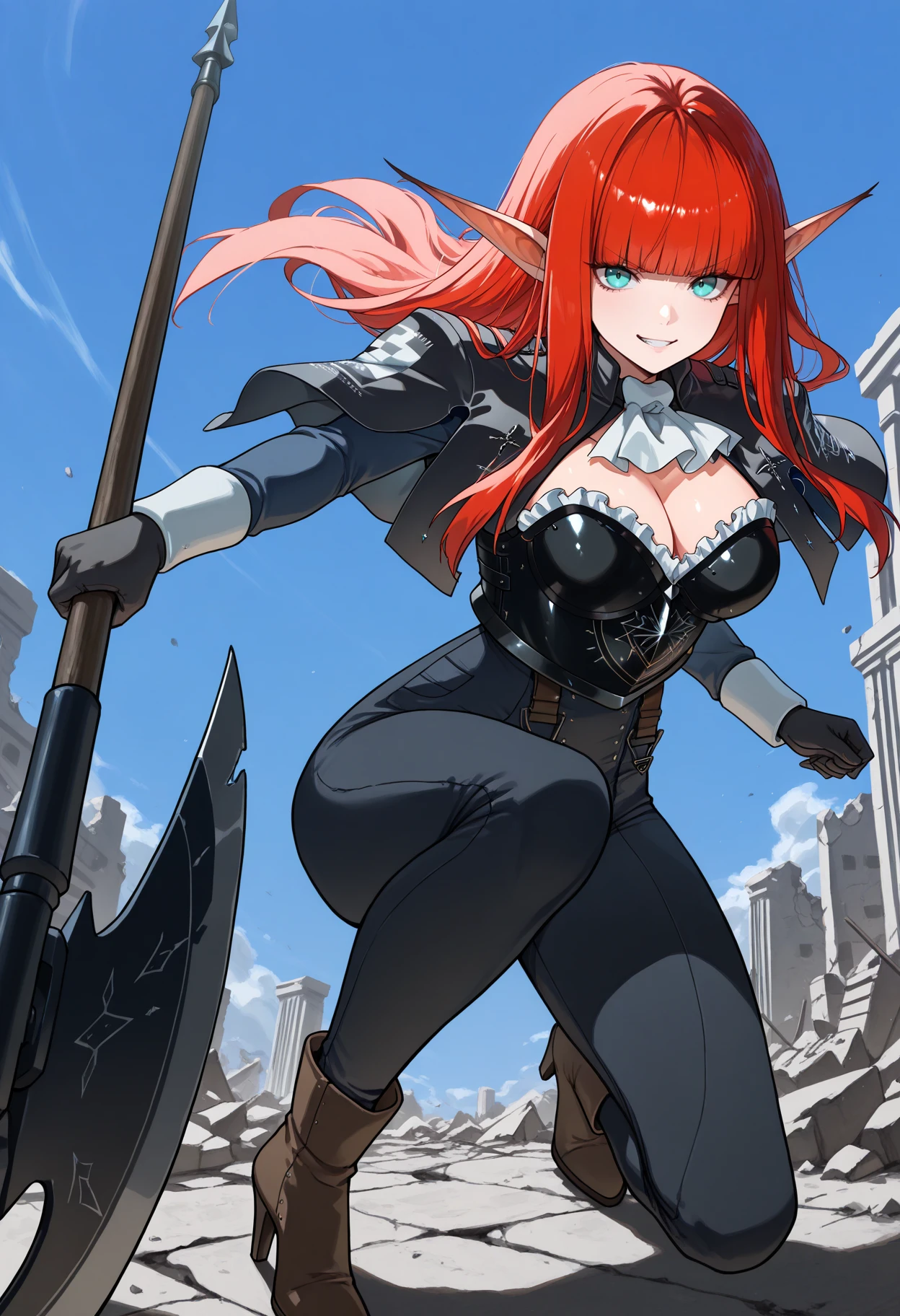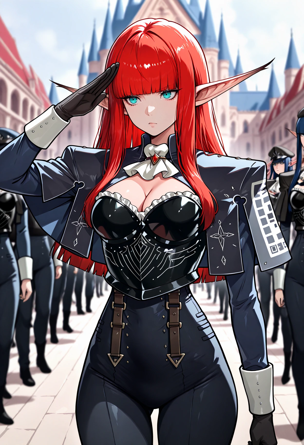 dfHbrg, red hair, long hair, blunt bangs, sidelocks, aqua eyes, pointy ears, white ascot, cleavage, black breastplate, black capelet, dark blue high-waist pants, long sleeves, dark blue sleeves, black gloves