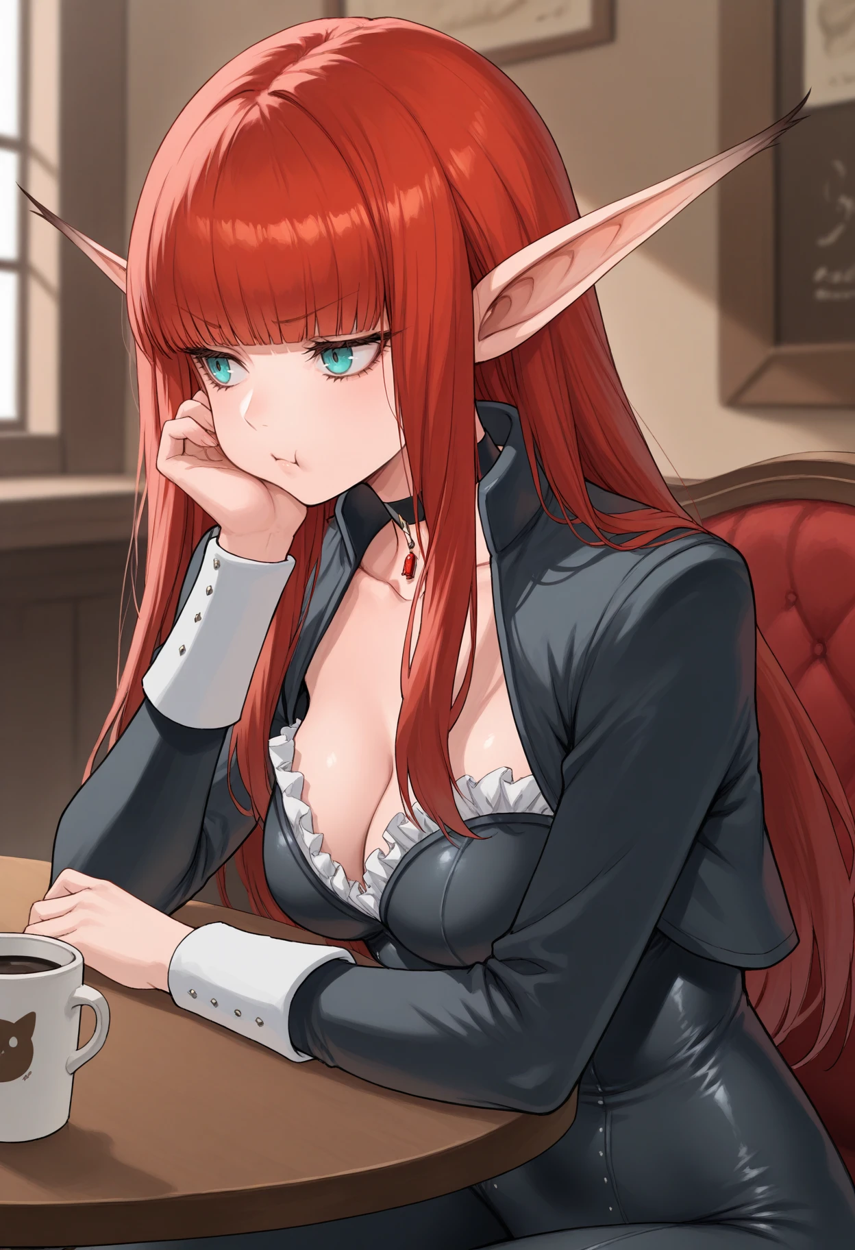 csHbrg, red hair, long hair, blunt bangs, sidelocks, aqua eyes, pointy ears, black choker, pendant choker, collarbone, cleavage, black bodysuit, frills, black jacket, cropped jacket, open jacket, long sleeves