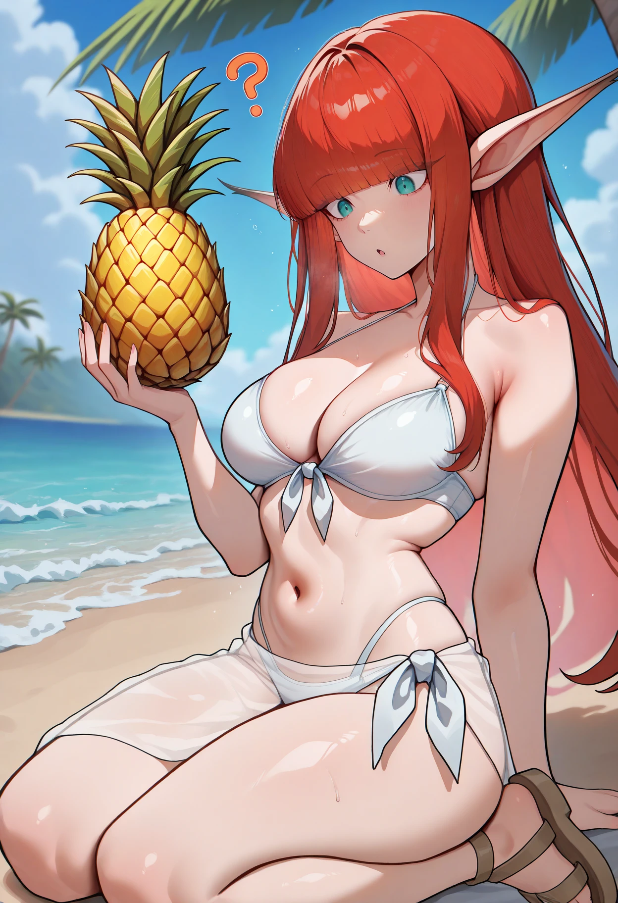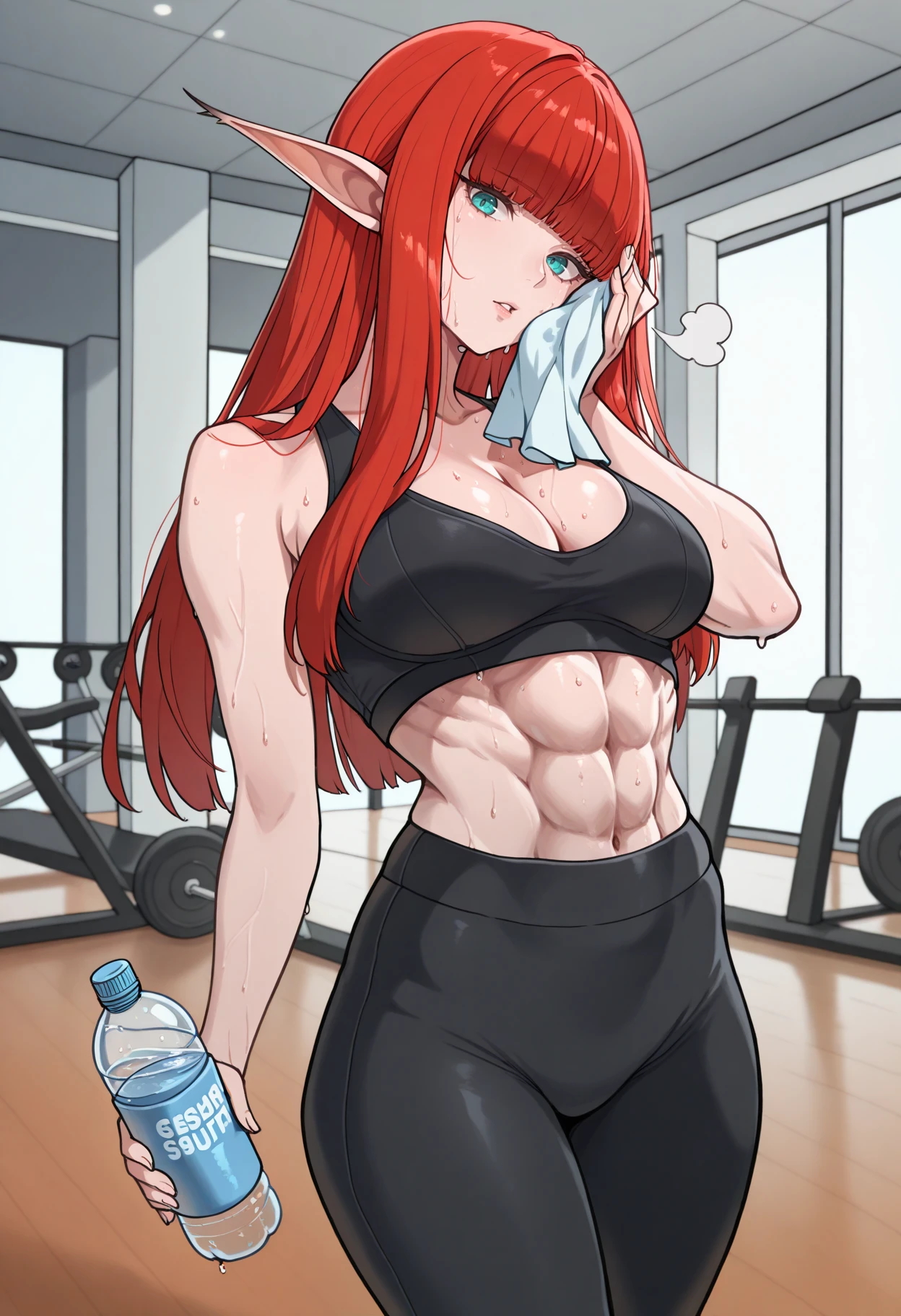 dfHbrg, red hair, long hair, blunt bangs, sidelocks, aqua eyes, pointy ears