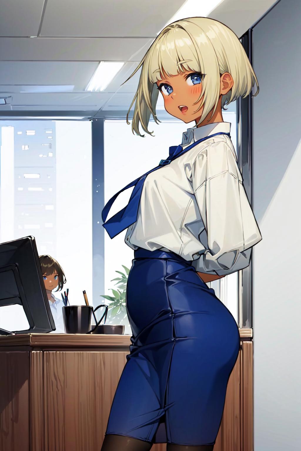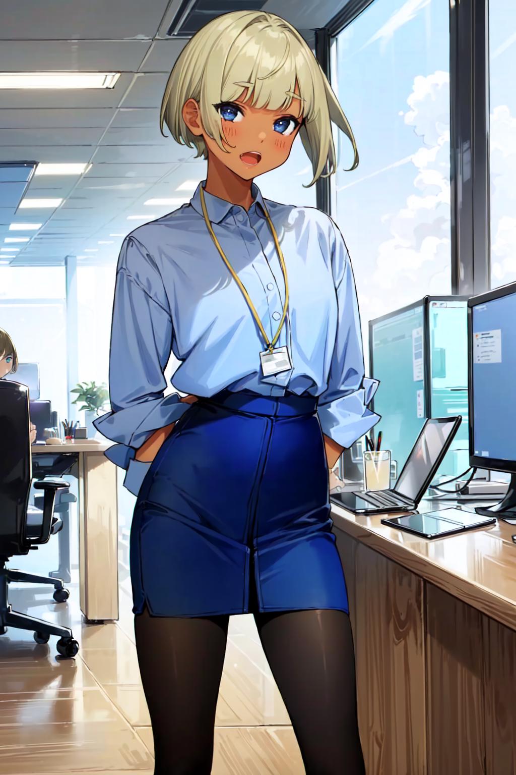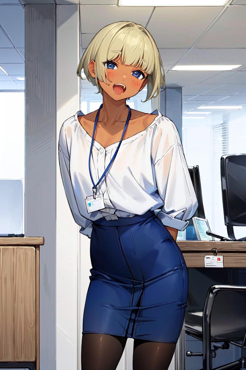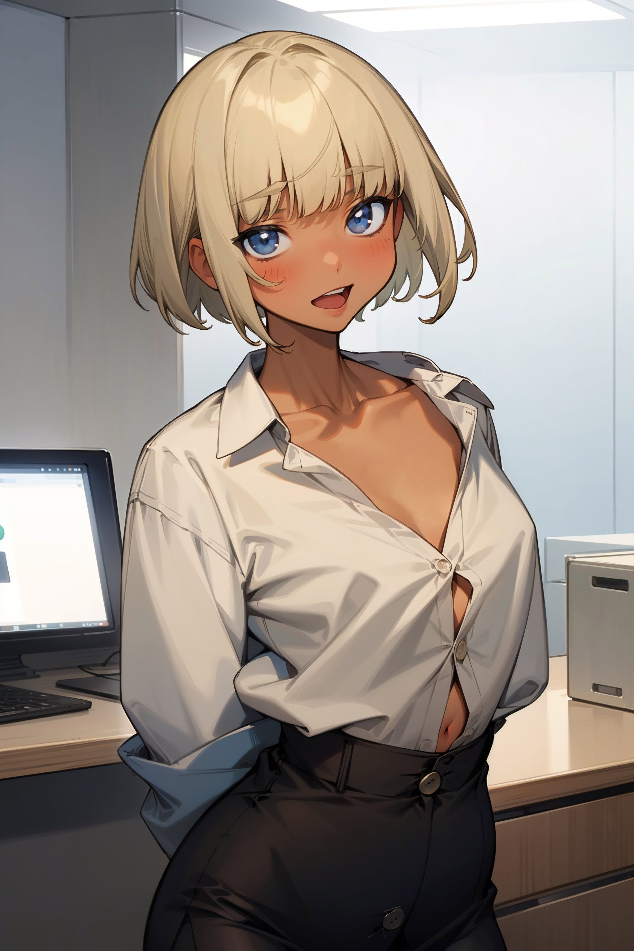 dark skin, dark-skinned female, blonde hair, short hair, bob hair, blunt bangs, blue eyes