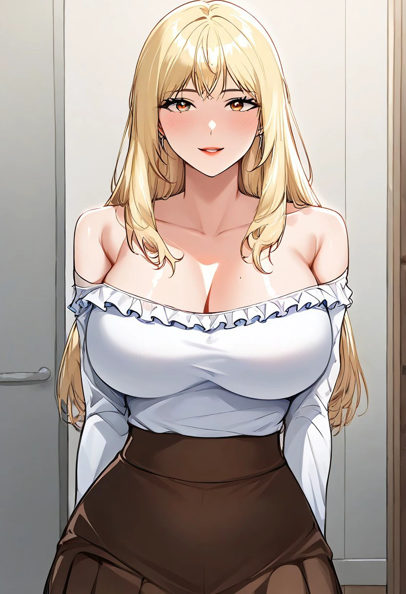 1. ((sexy long-sleeves sheer white top, barely visible bra, obscene cleavage, huge cleavage, brown pencil skirt, ))