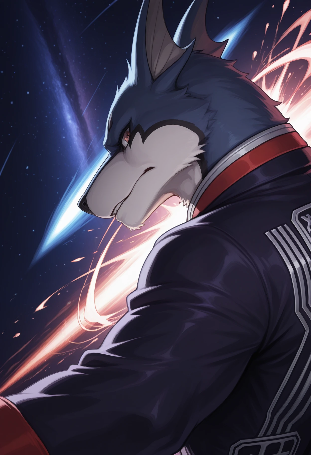 Doggie Kruger, solo, furry, wolf, male, red eyes, black eyebrows, blue fur, black belt, long black coat