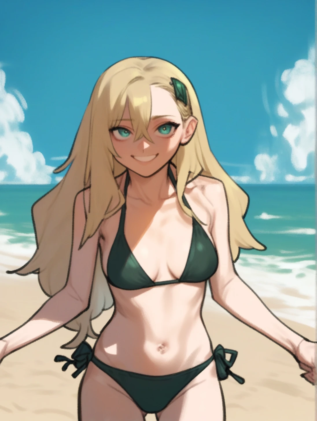 long hair,skirt,blonde hair,long sleeves,school uniform,pantyhose,pleated skirt,serafuku,black skirt,sailor collar,neckerchief,black pantyhose,hair clip,