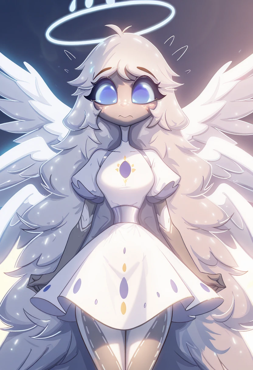 Sera has three versions: her human look, a partial angelic look where she gains glowing eyes in her hair, but no bird features yet, and the angelic form that shows some more anthro bird elements.
