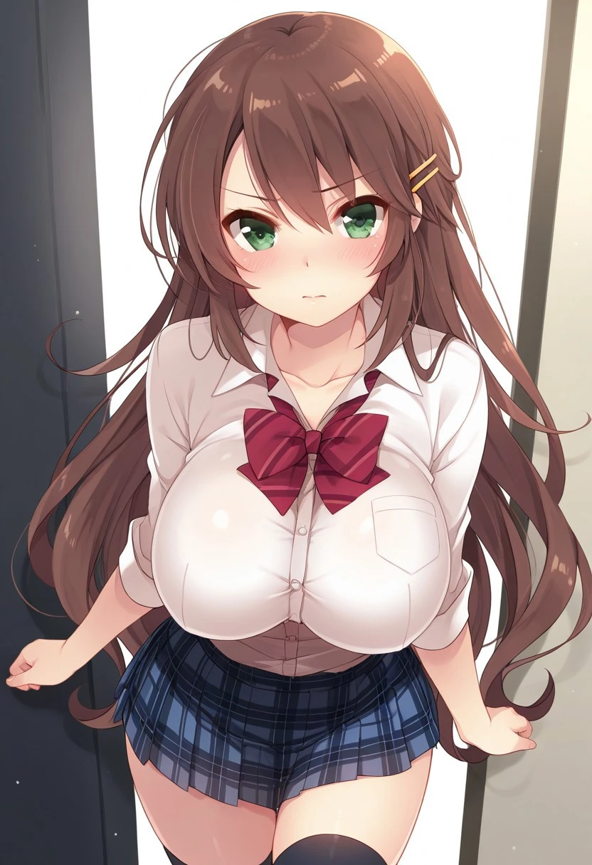 impossible shirt, bowtie, hair clip, plaid skirt, black thighhighs, zettai ryouiki