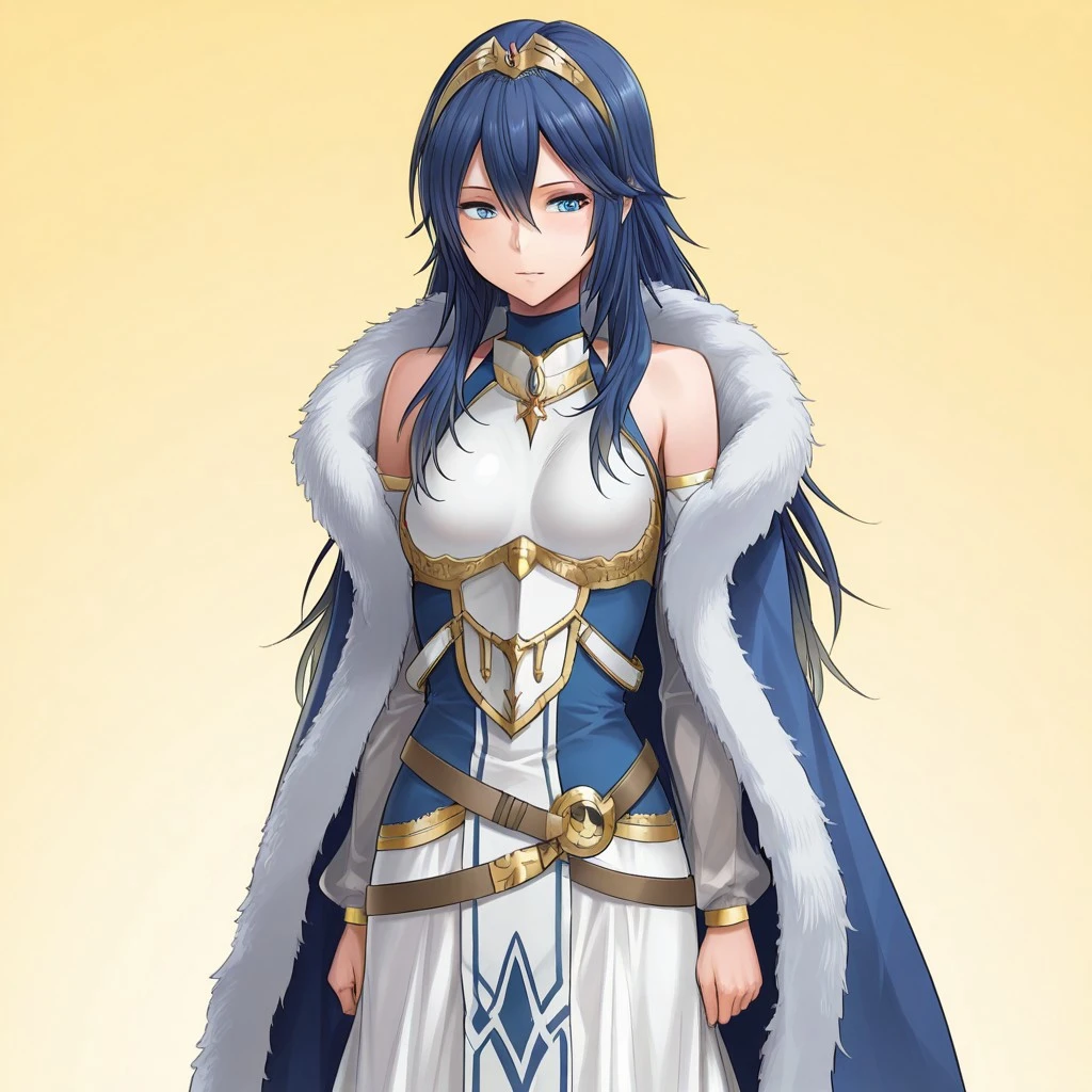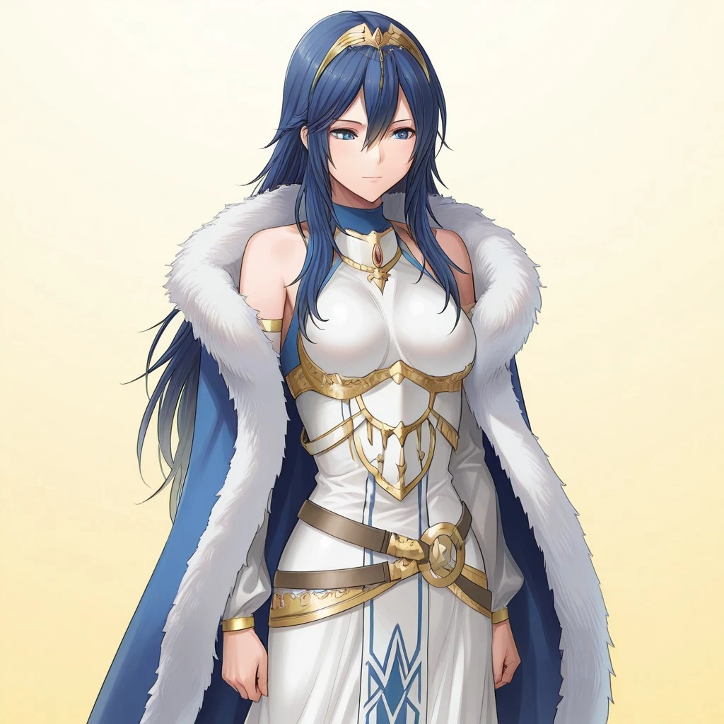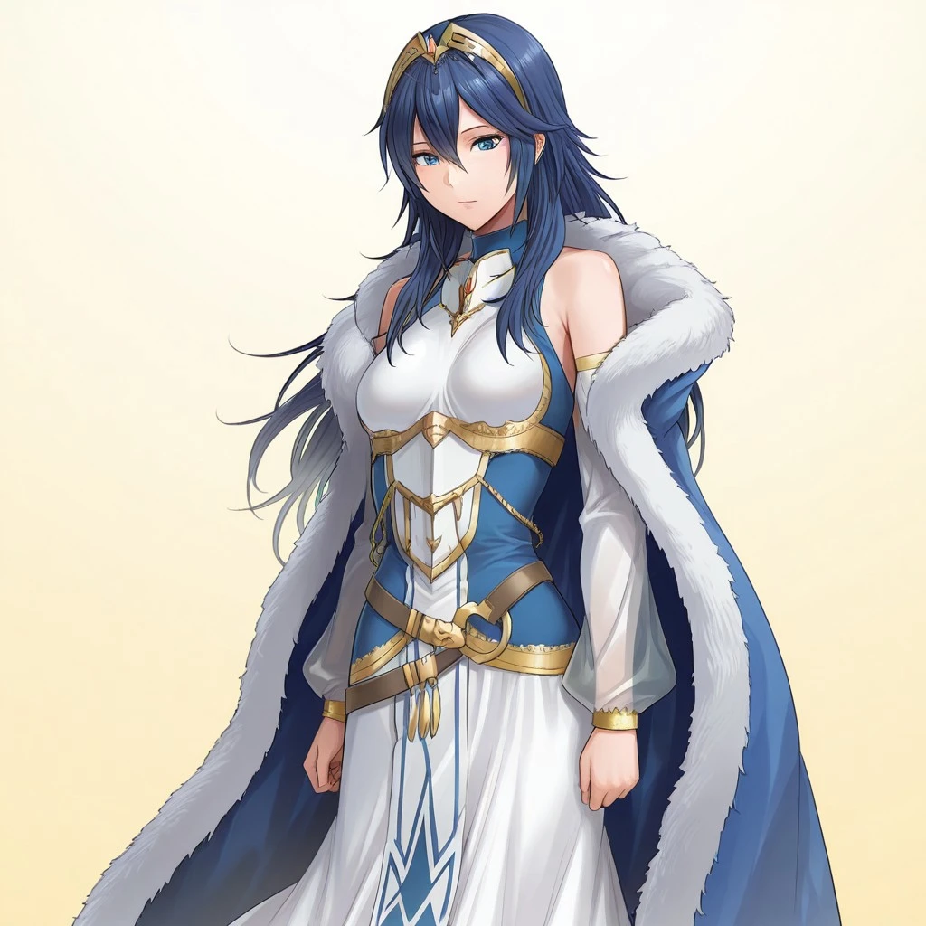 LucinaExalt, long hair, blue hair, hair between eyes, tiara, blue eyes, dress, cape, fur trim. white dress, detached sleeves,