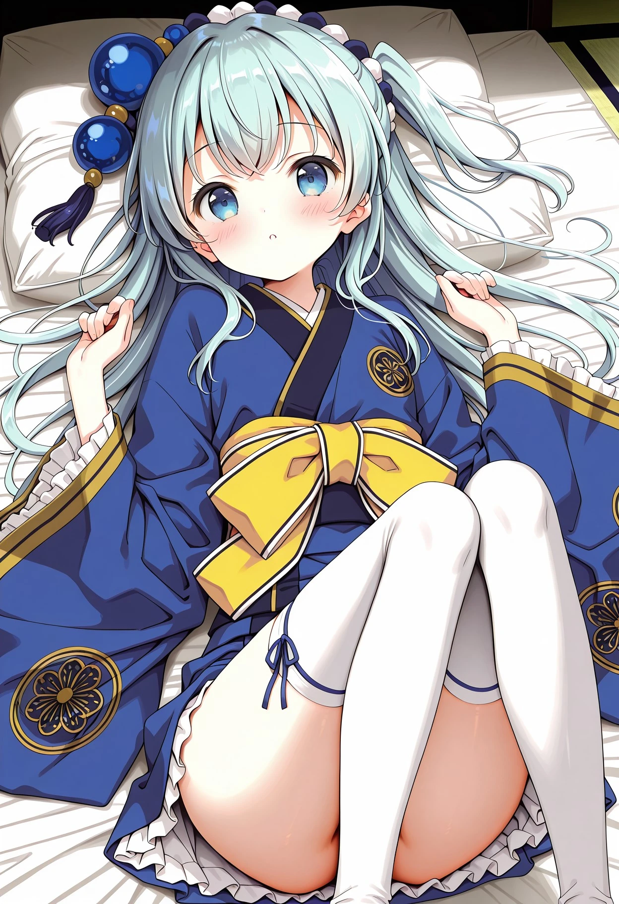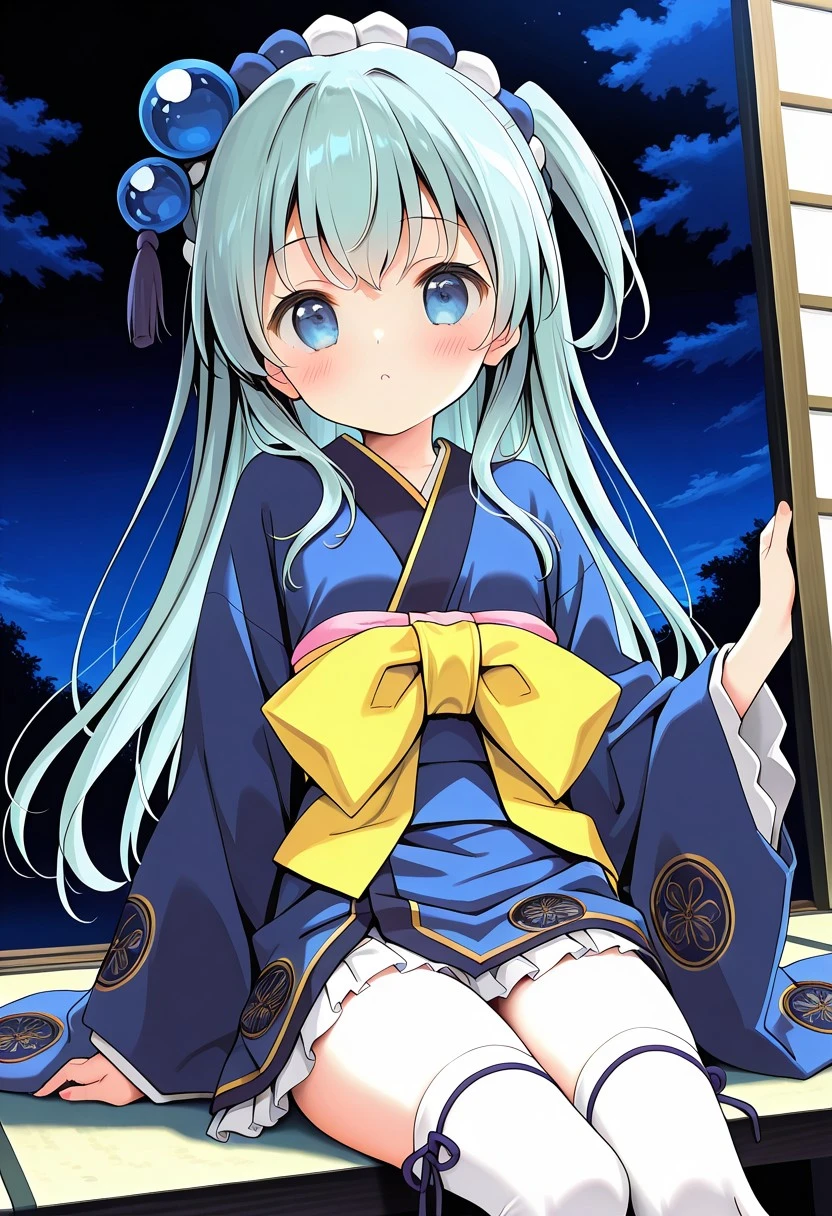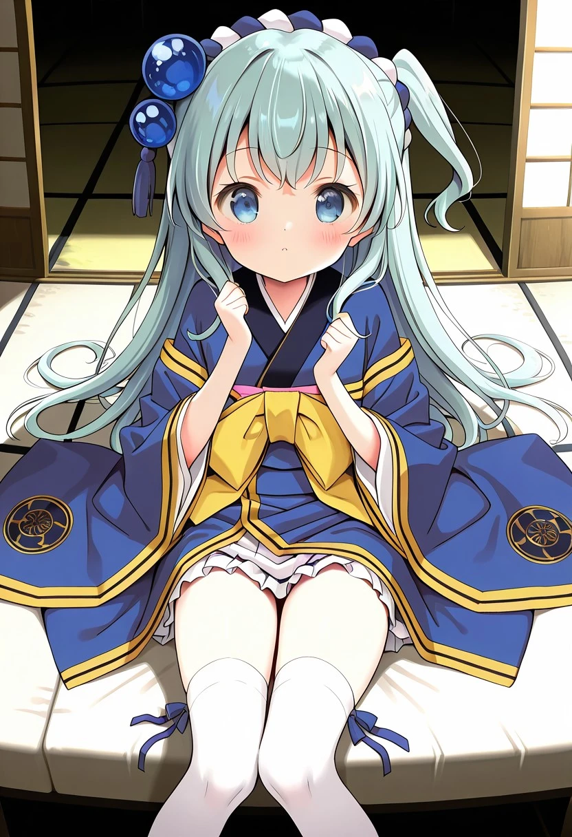 1girl,tokugawa ieyasu (sengoku collection),blue hair,long hair,one side up,blue eyes,hair ornament,white thighhighs,kimono,sash,mini skirt,