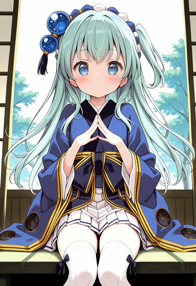 1girl,tokugawa_ieyasu_(sengoku_collection),blue hair,long hair,one side up,blue eyes,hair ornament,white thighhighs,japanese wear,sash,mini skirt,