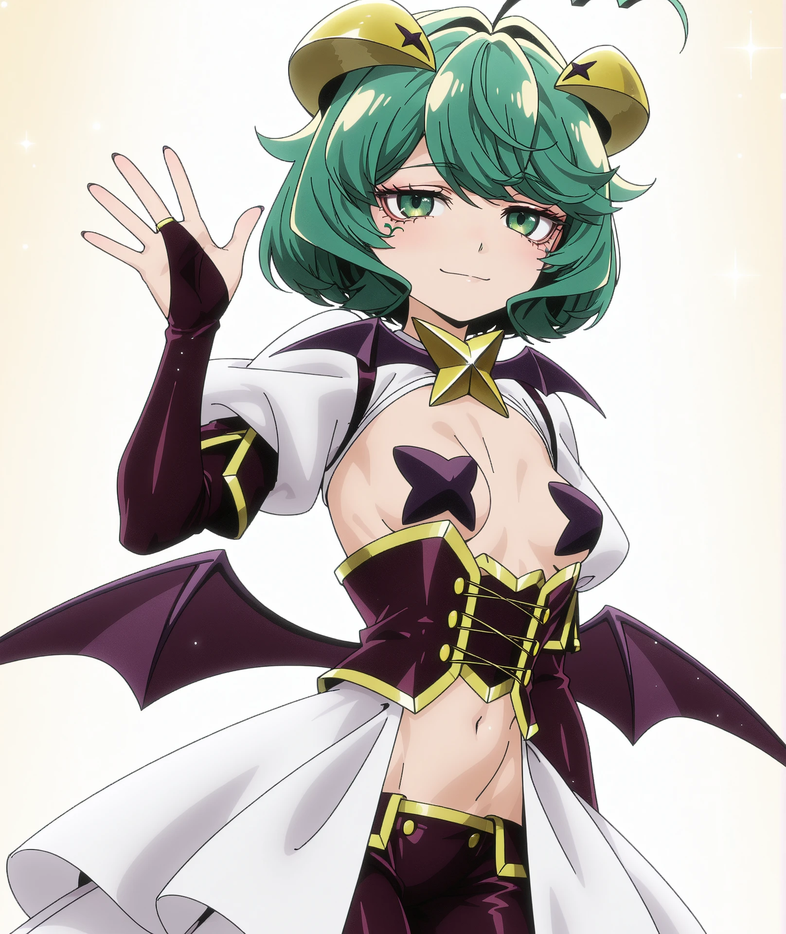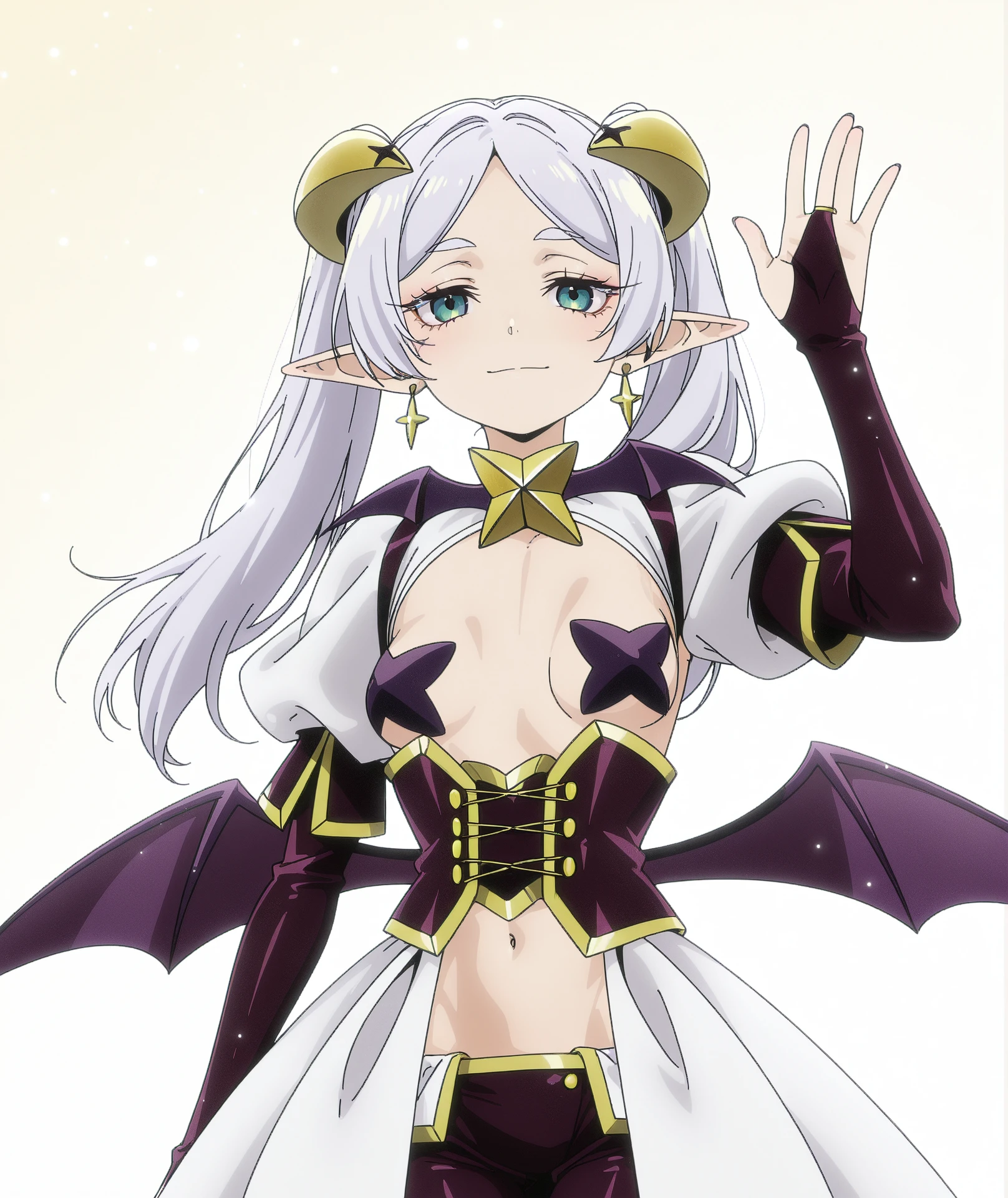 bat brooch, bat wings, bridal gauntlets, corset, cross, cross pasties, low wings, pants, pasties, purple bridal gauntlets, purple corset, purple pants, showgirl skirt, shrug (clothing), skirt, white shrug, white skirt, wings,