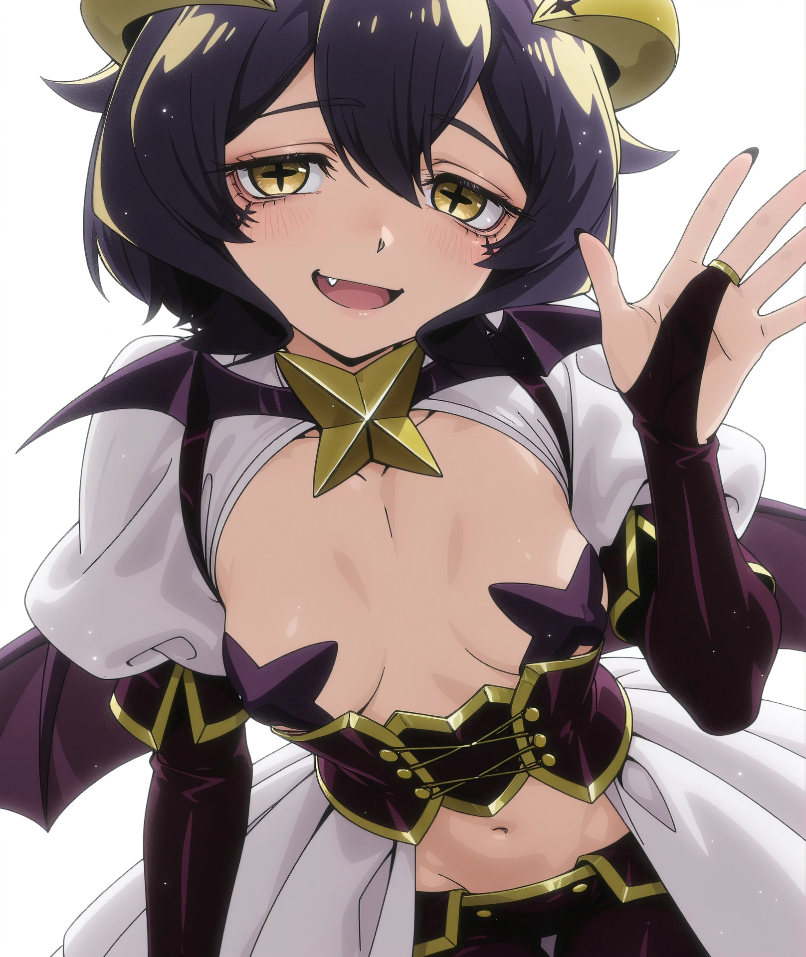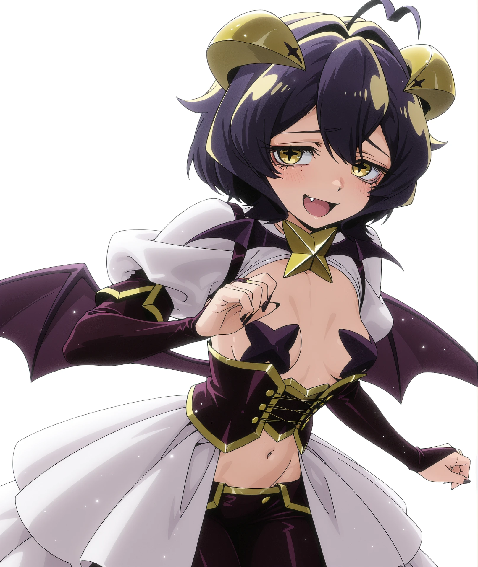 ahoge, black hair, black nails, fang, forward-facing horns, horns, yellow horns,