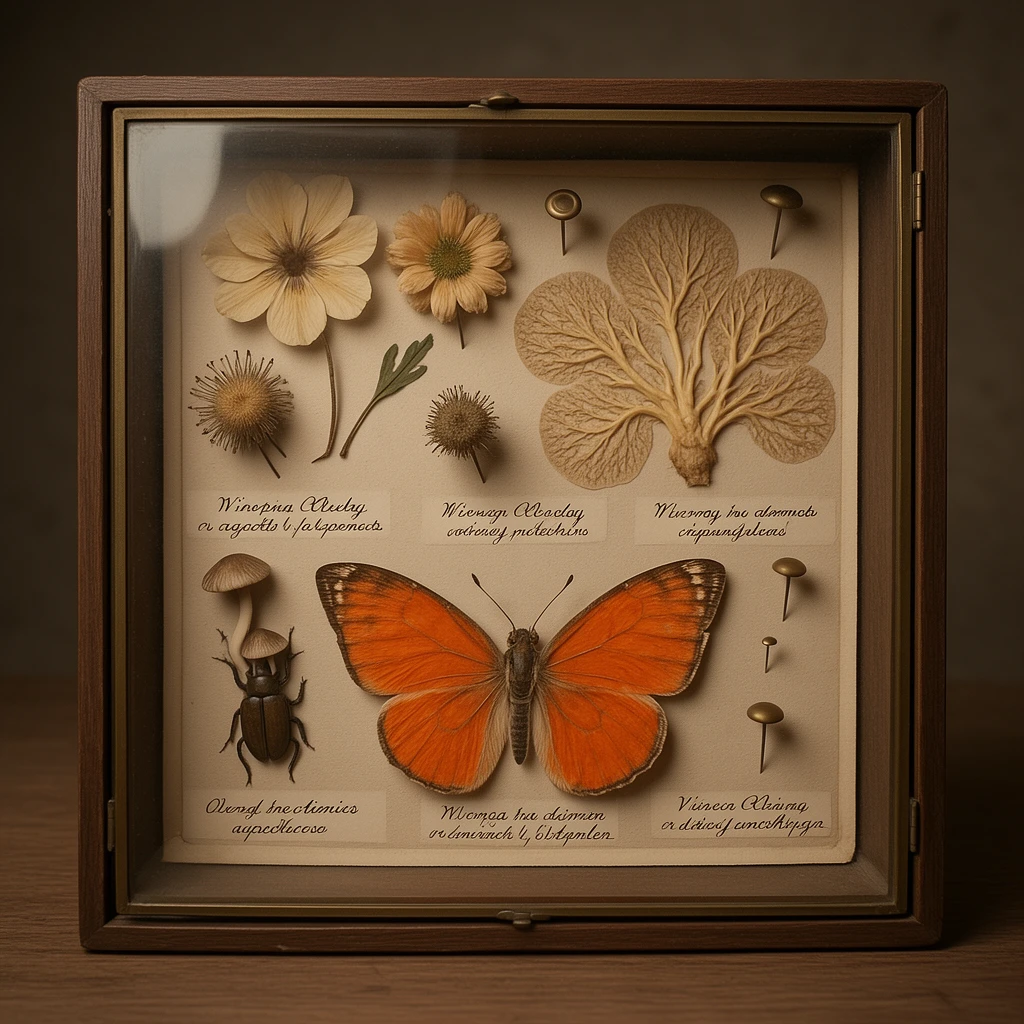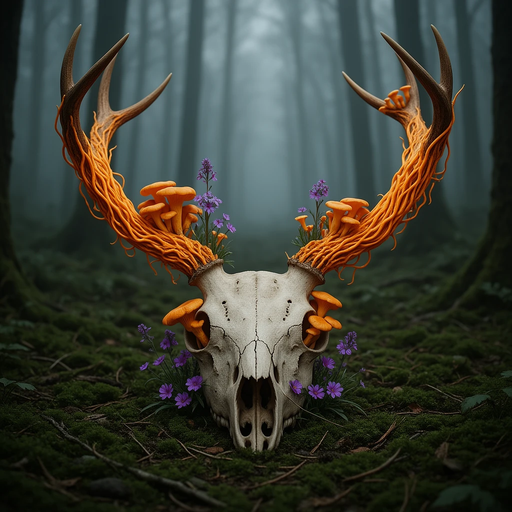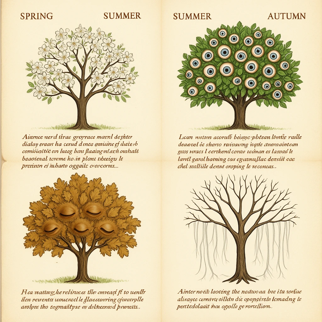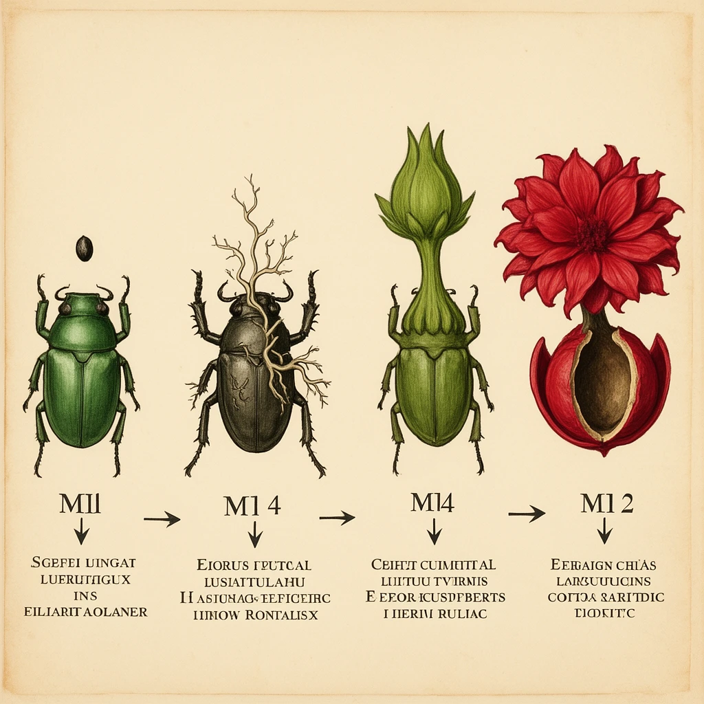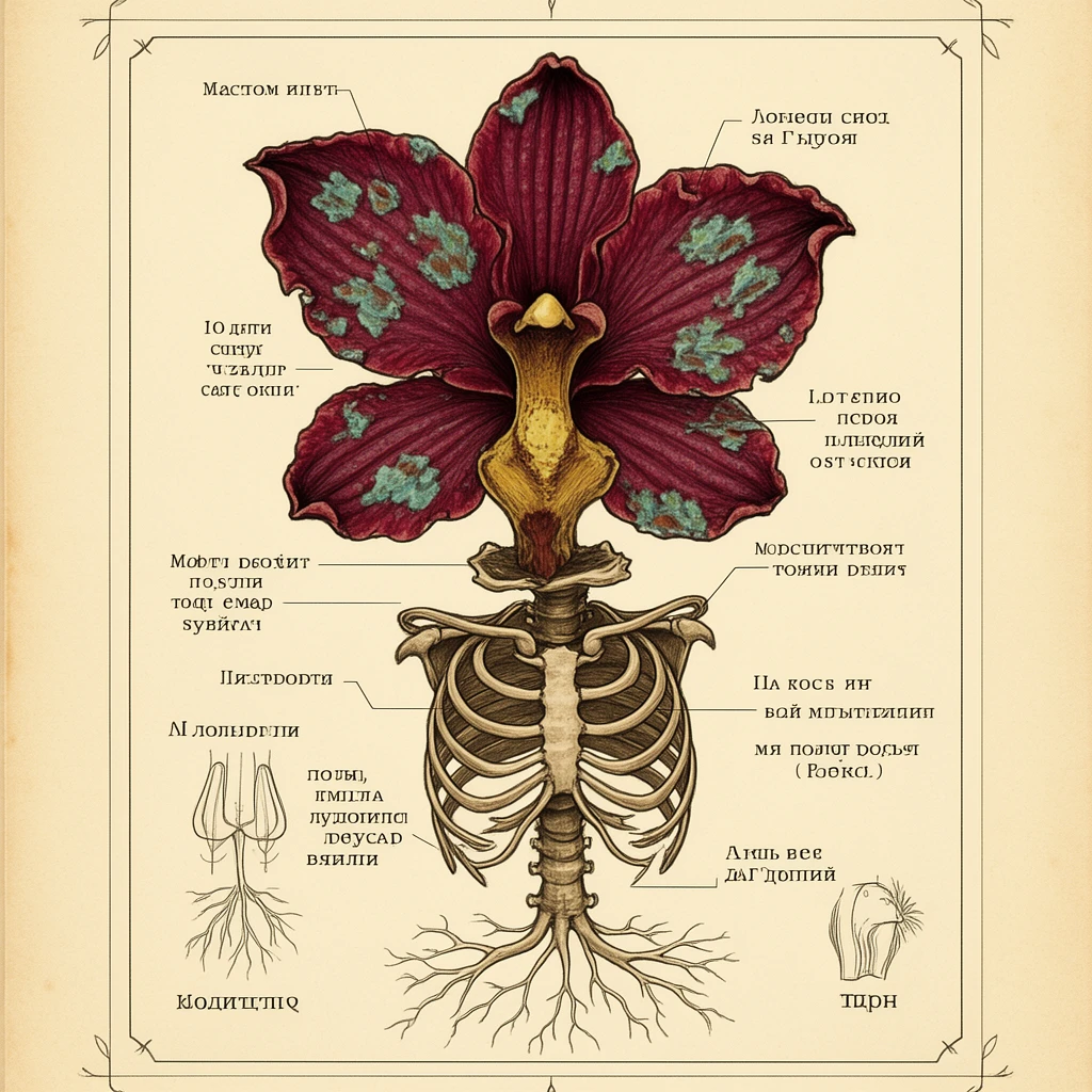 Botanical illustration of gorgeous decay. Flowers blooming from dead animals, fruits splitting to reveal something wrong, specimens decomposing with scientific precision. Victorian naturalist field guide aesthetics applied to organic horror. Beauty and rot sharing the same petal.
