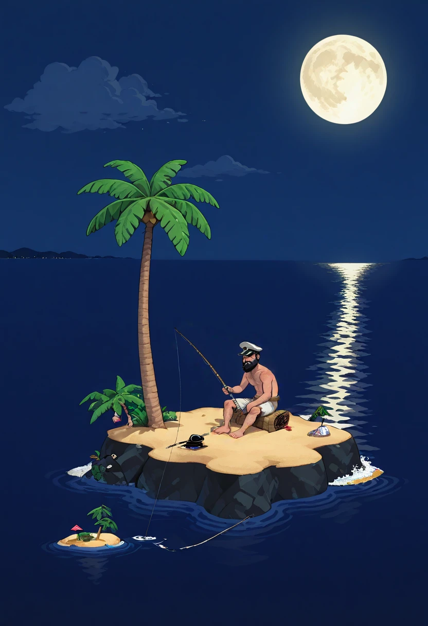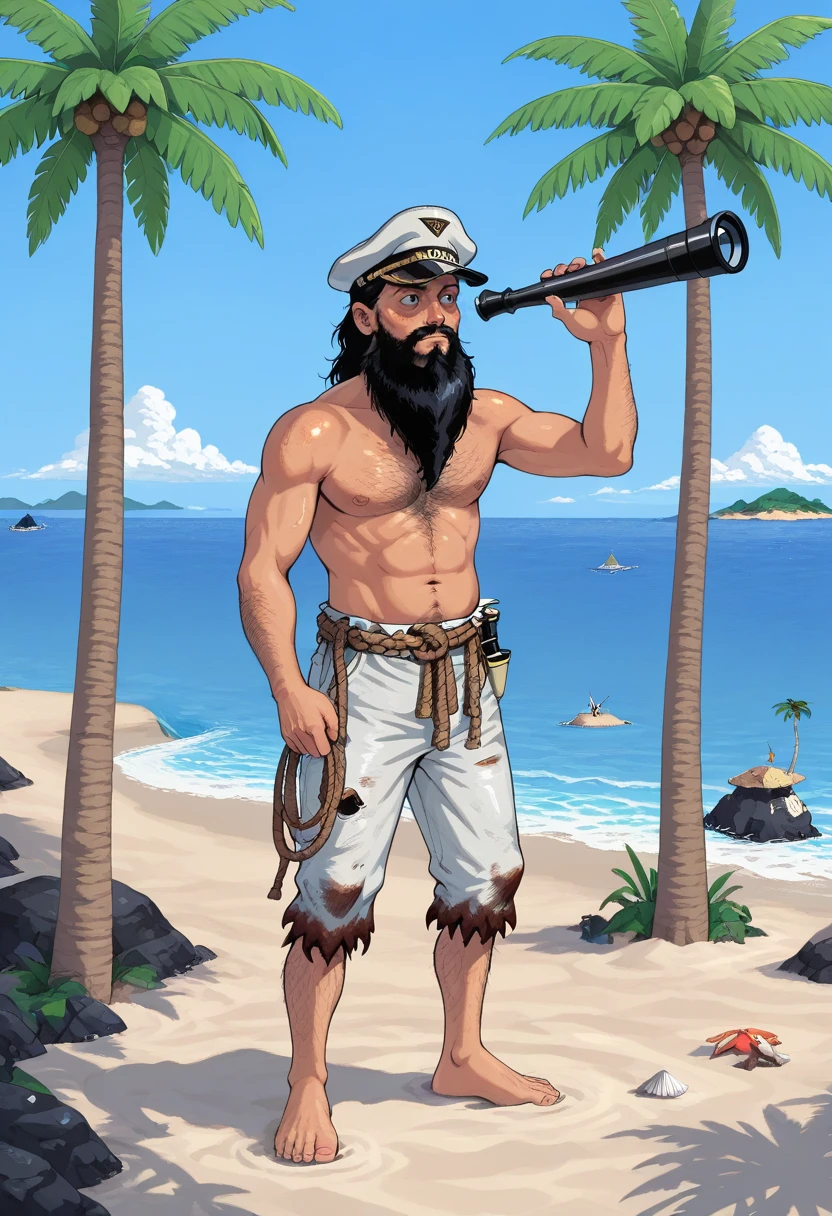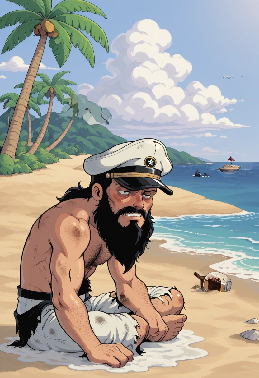johnny, black hair, peaked cap, ragged clothes, beard, hairy face, topless male,