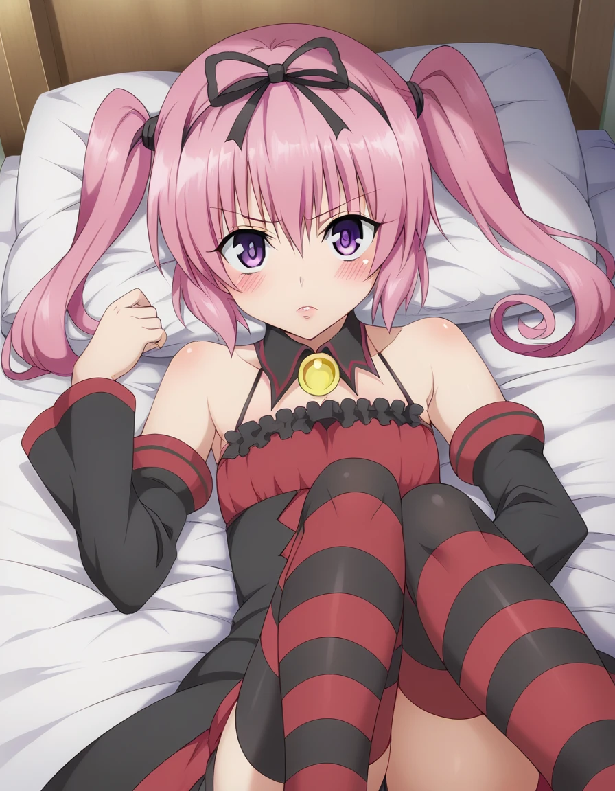 Princess dress: nanadevil, nana asta deviluke, long hair, twintails, purple eyes, pink hair, hair ribbon, detached collar, jewelry, bare shoulders, multicolored clothes, detached sleeves, striped thighhighs,