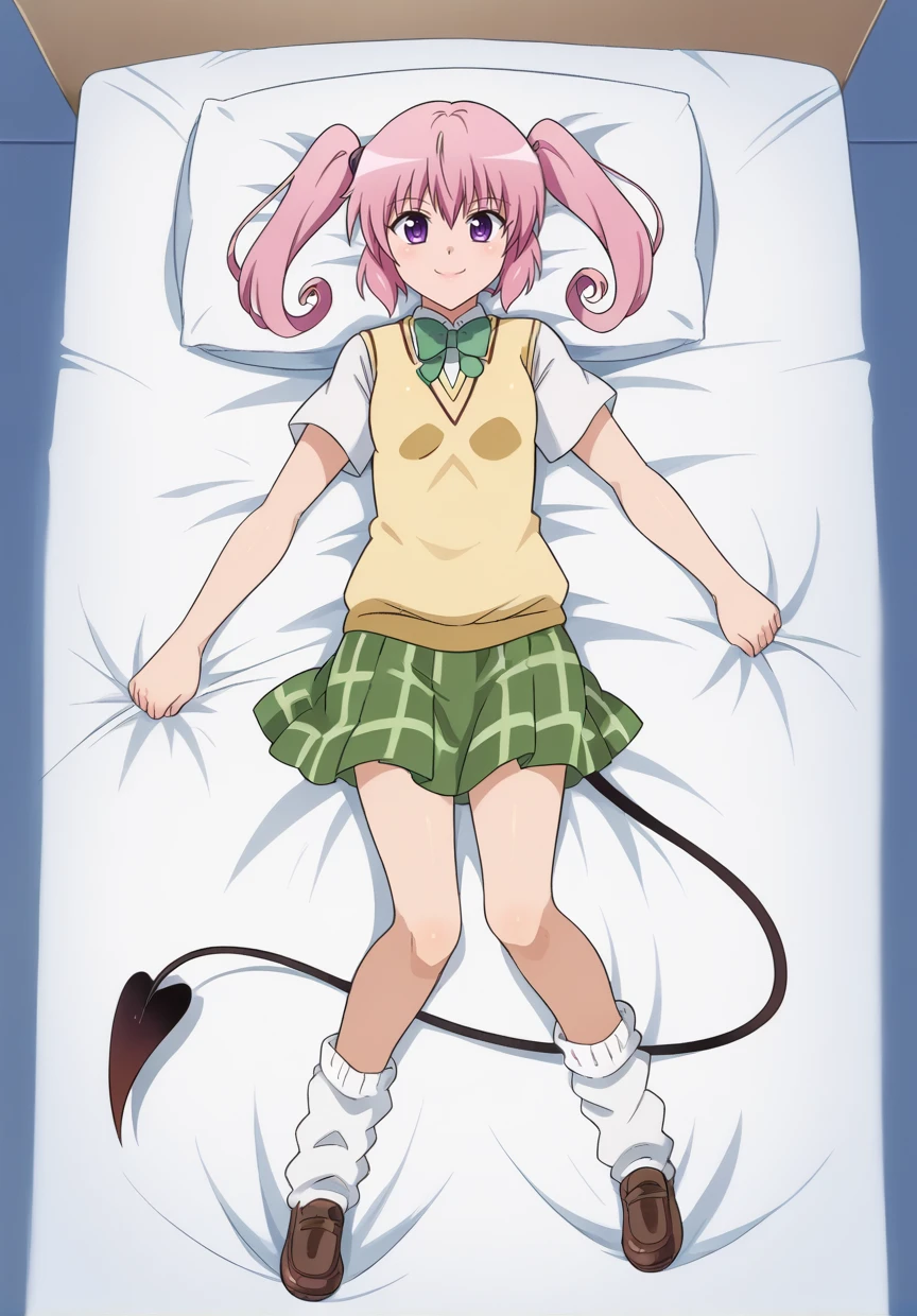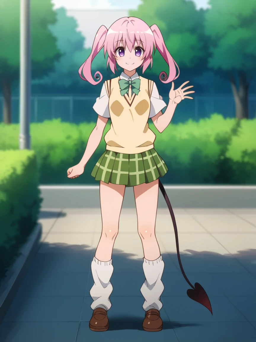 School uniform: nanadevil, nana asta deviluke, long hair, twintails, purple eyes, pink hair, sainan high school uniform, white shirt, green skirt, pleated skirt, green bow, orange sweater vest, socks, loose socks, brown shoes