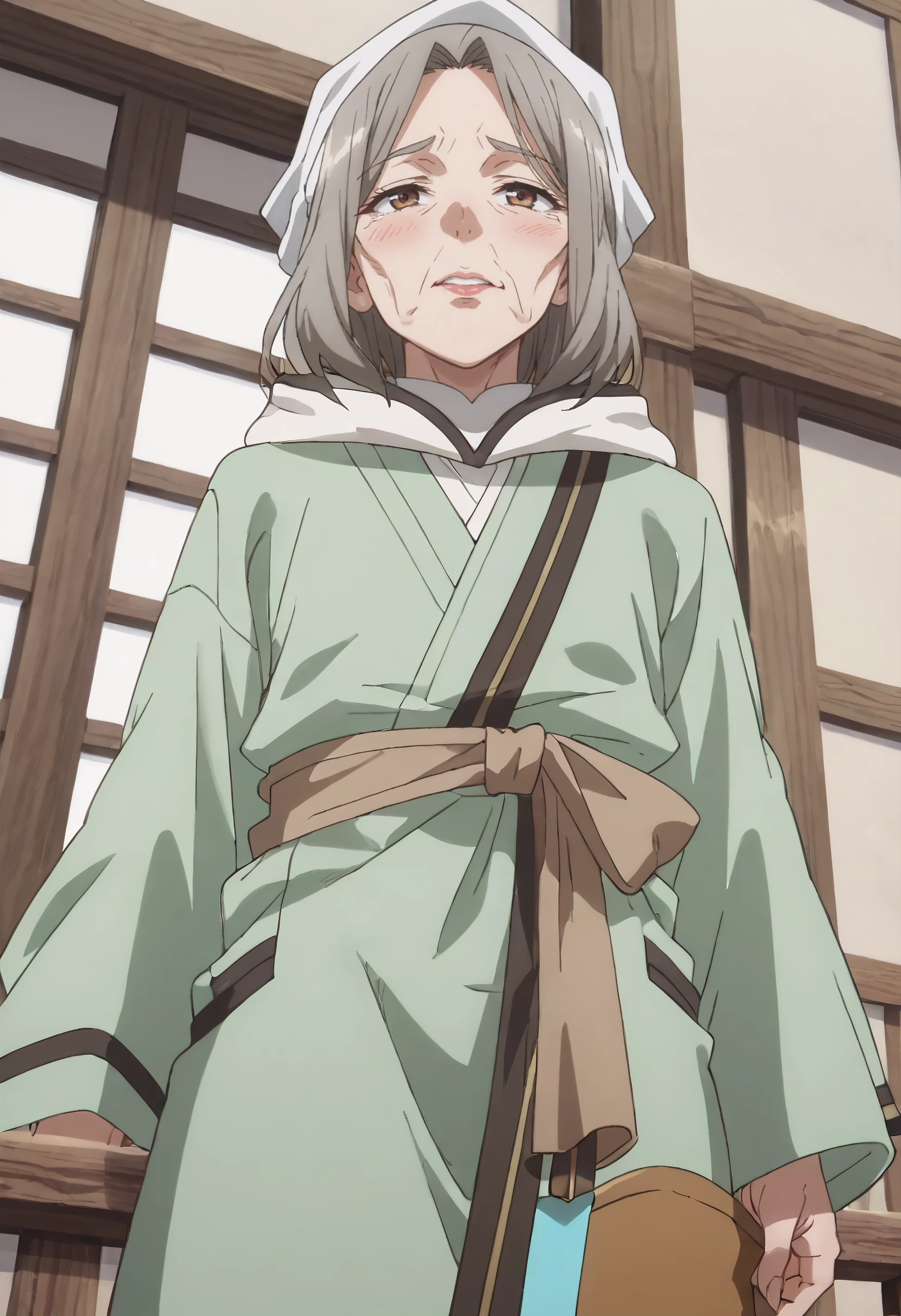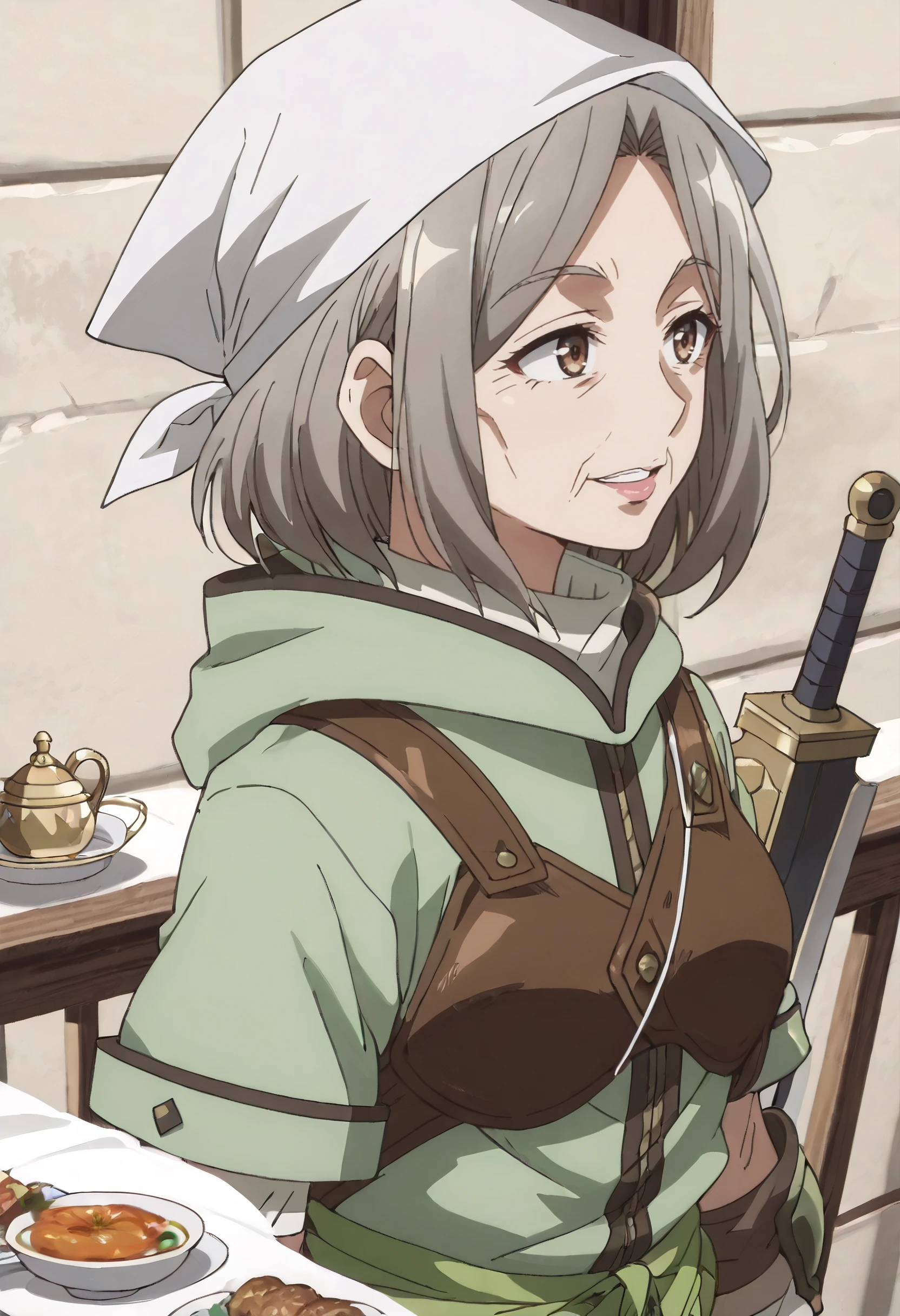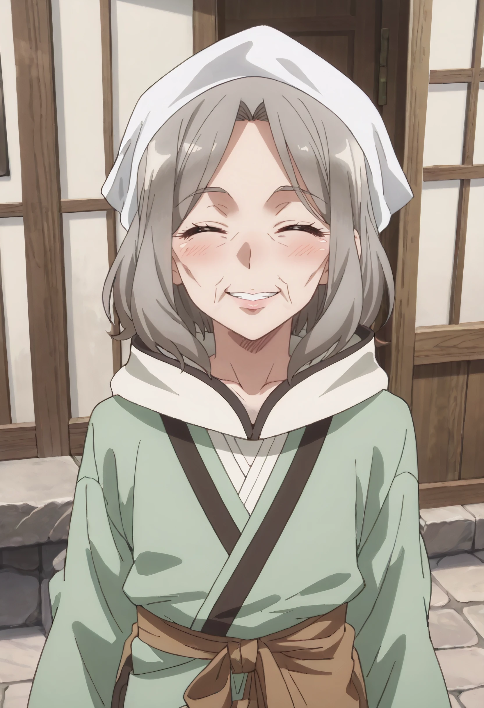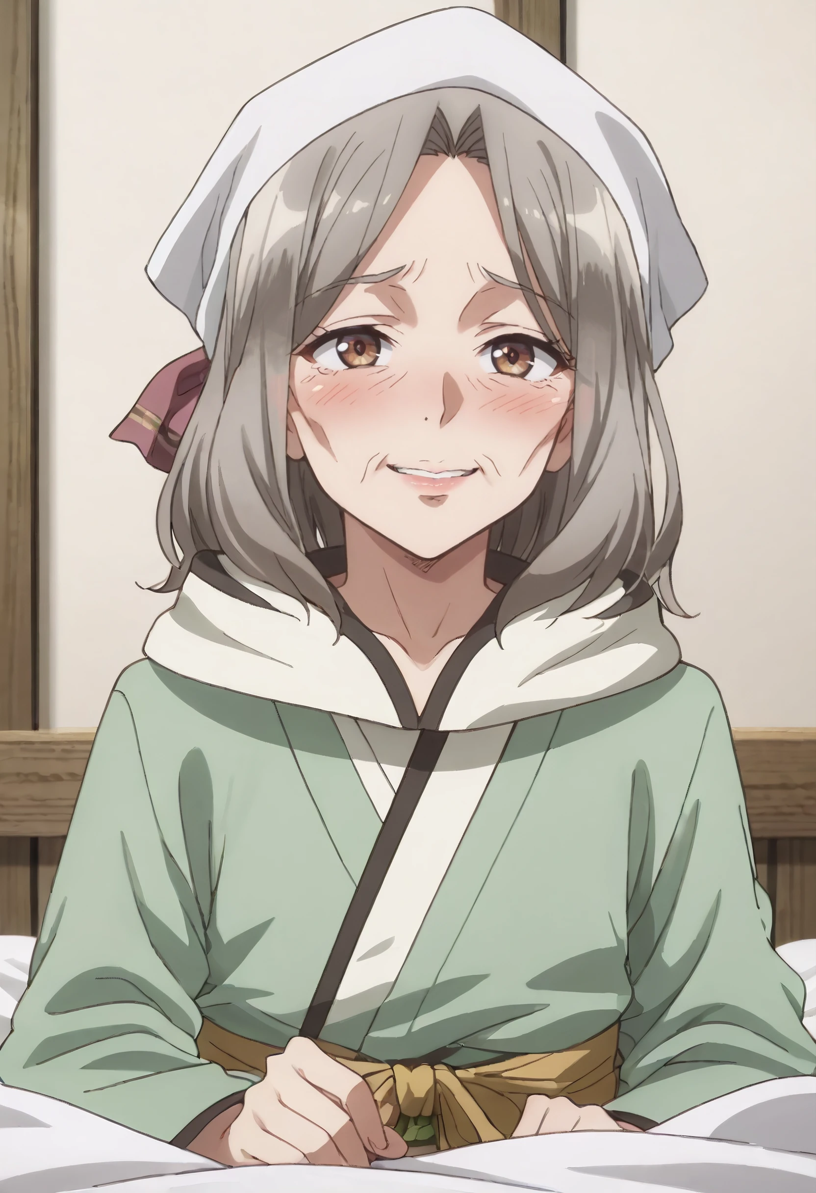 JHNHoxie, brown hair, grey hair, headscarf, brown eyes, short hair, old, old woman,