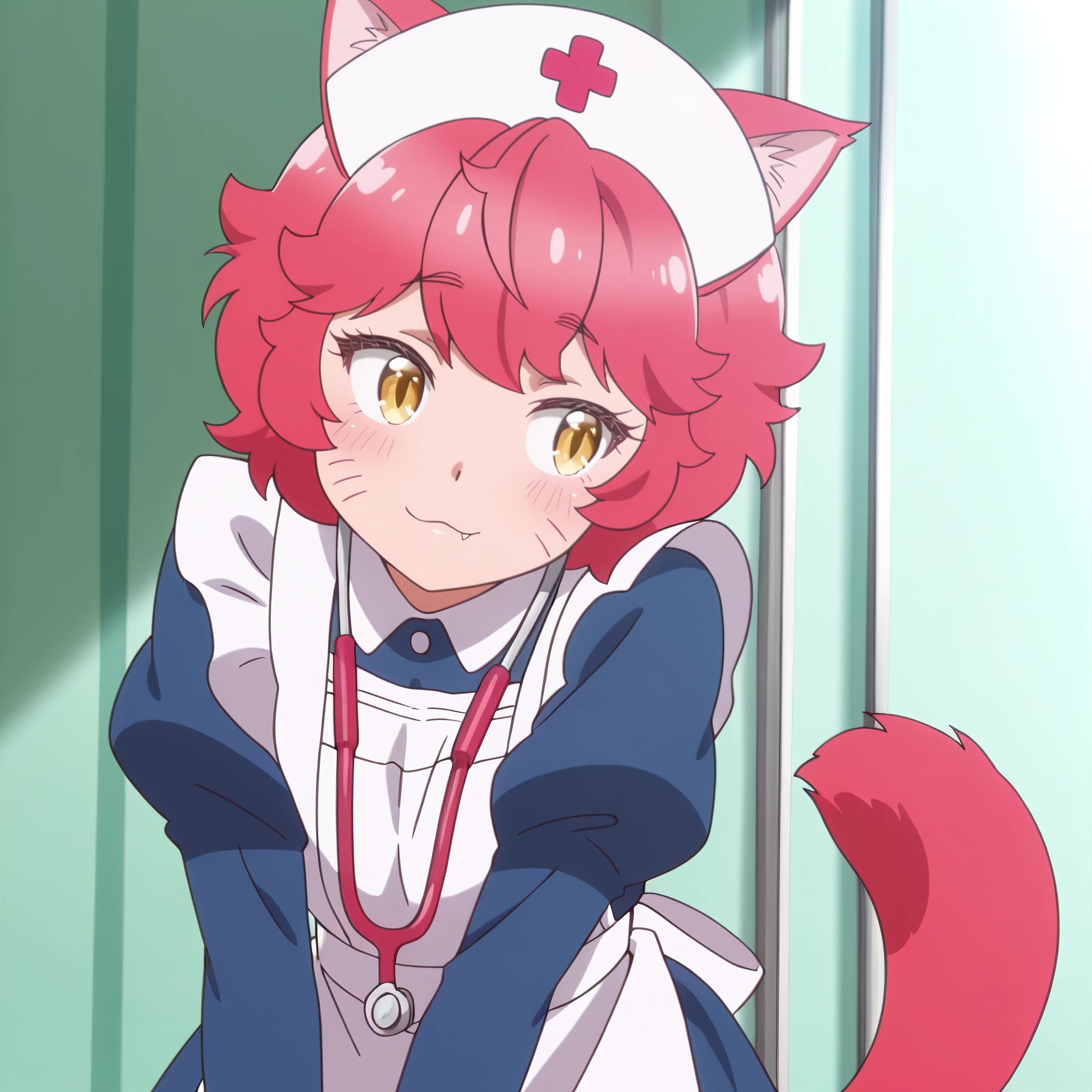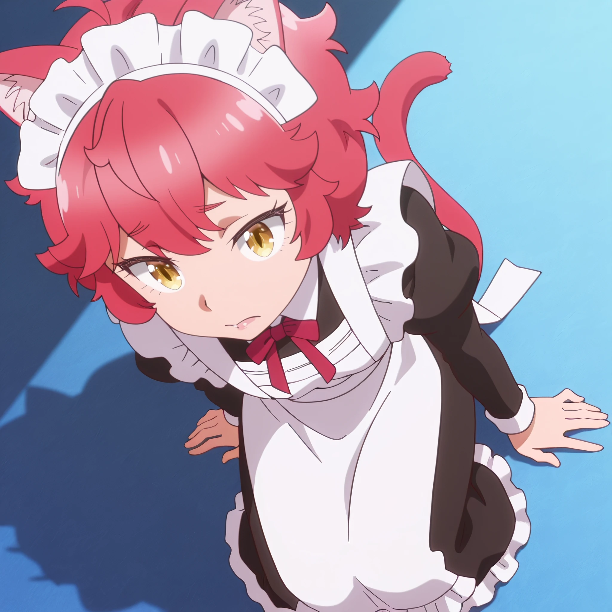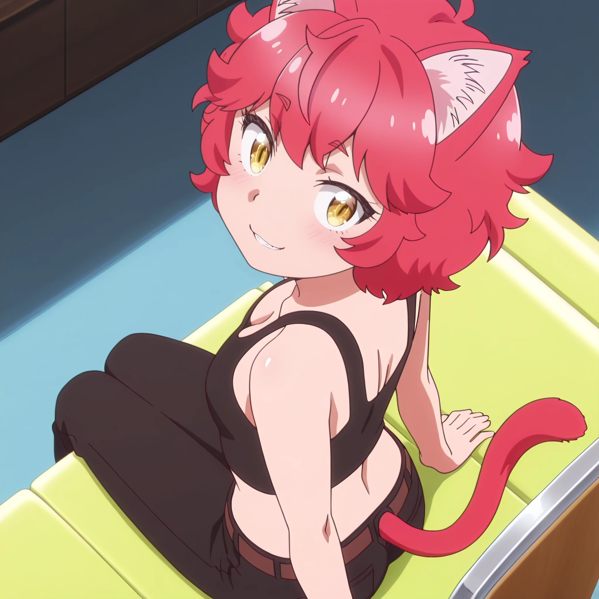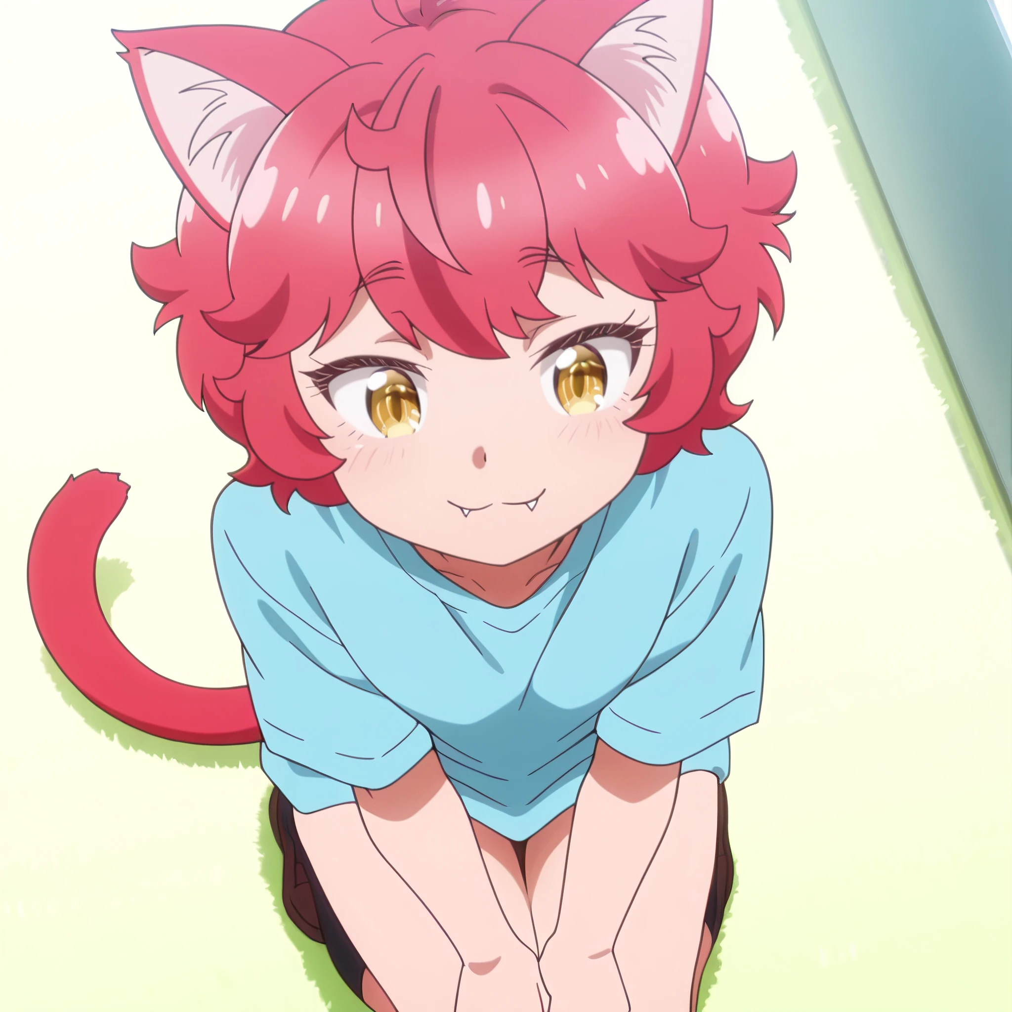 ARTJosette, cat girl, animal ears, yellow eyes, short hair, eyebrows visible through hair, cat ears, bangs, red hair, animal ear fluff, tail,