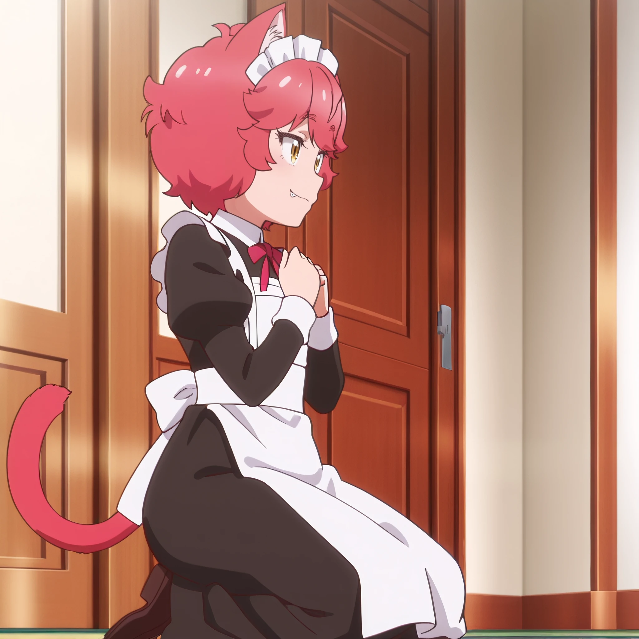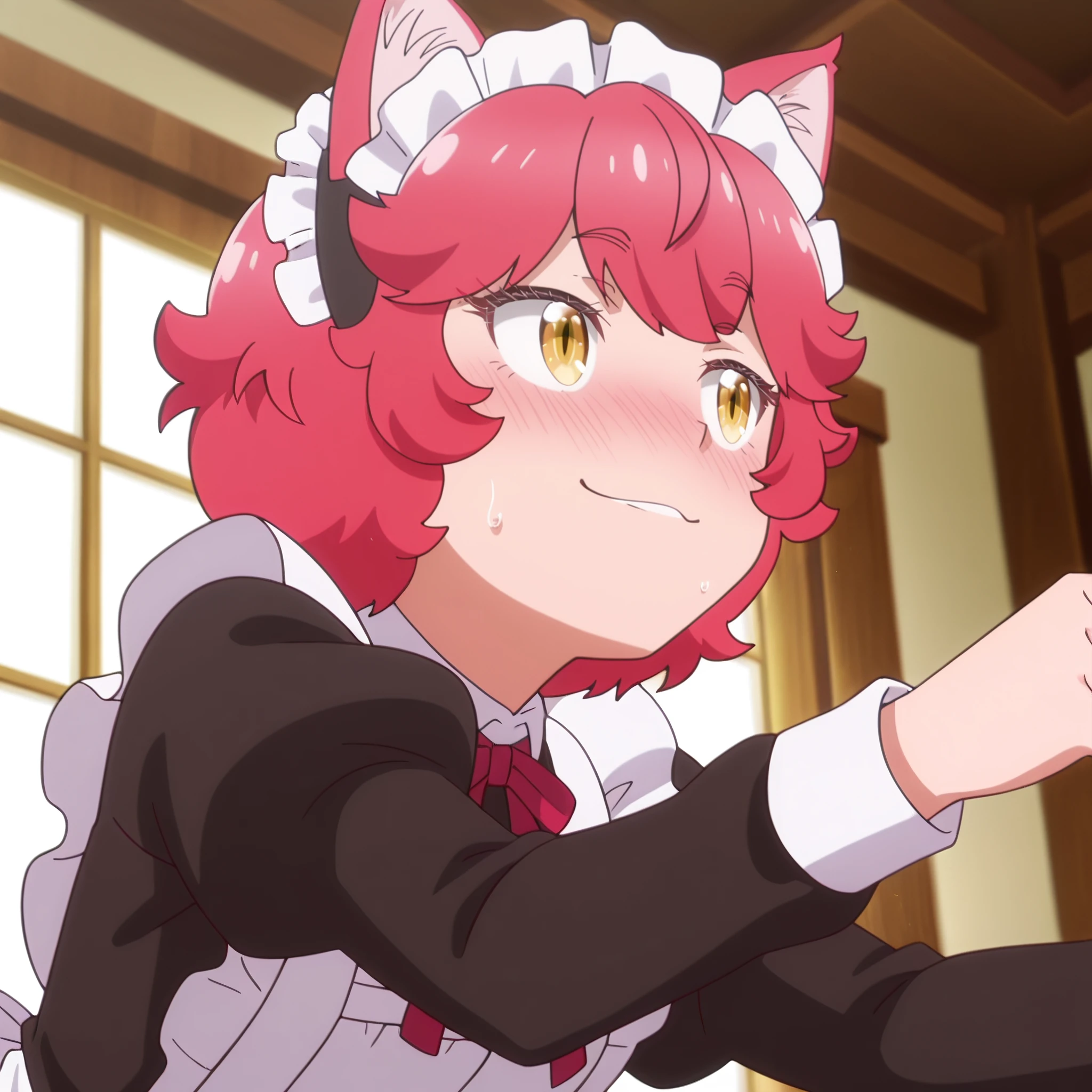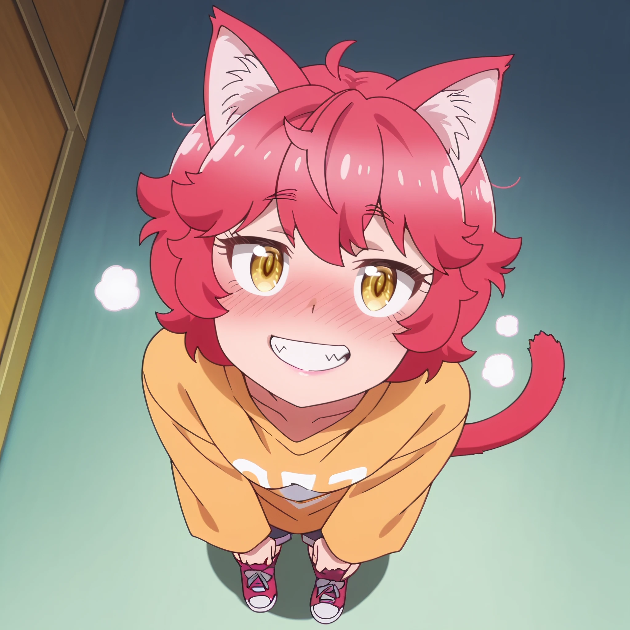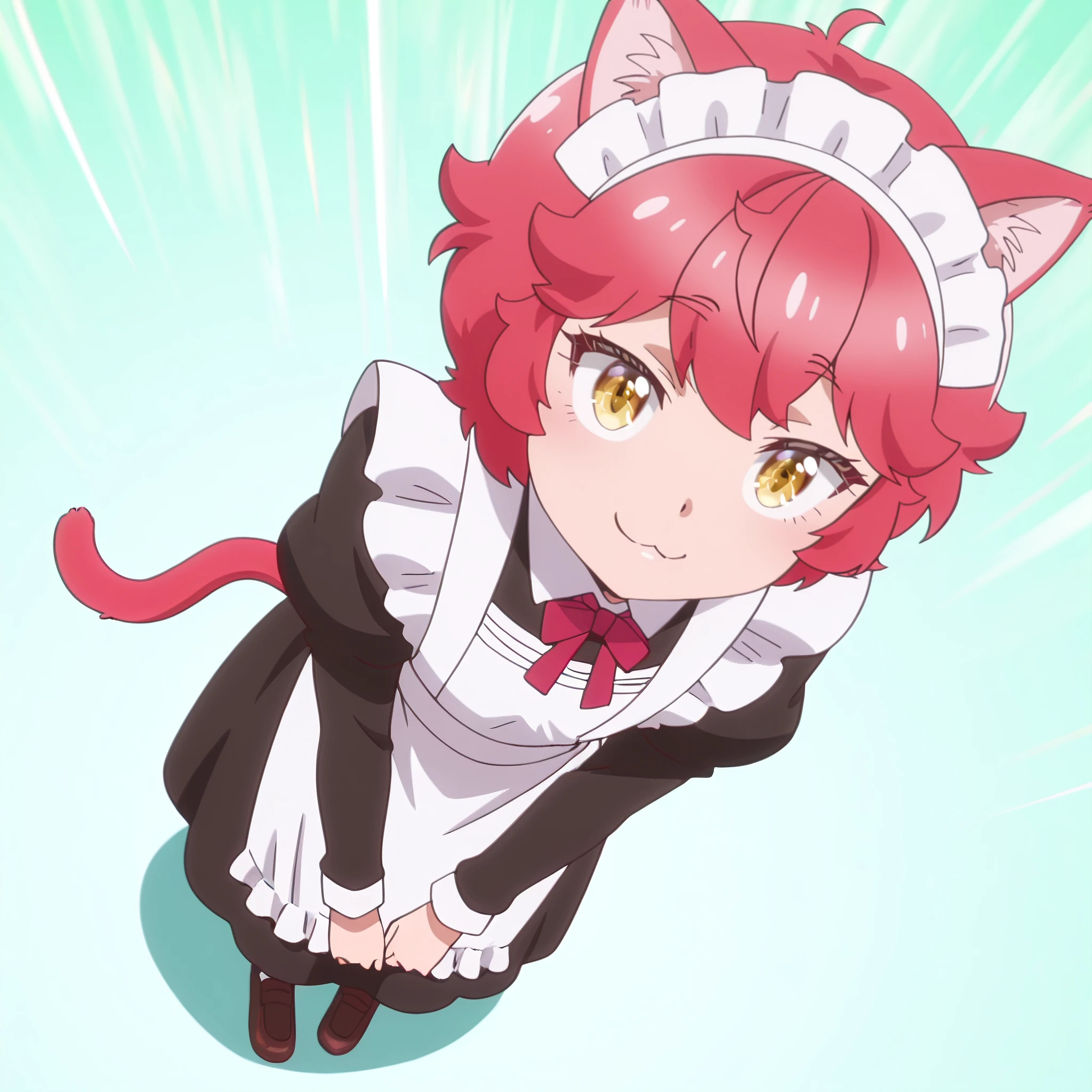 ARTJosette, cat girl, animal ears, yellow eyes, short hair, eyebrows visible through hair, cat ears, bangs, red hair, animal ear fluff, tail,