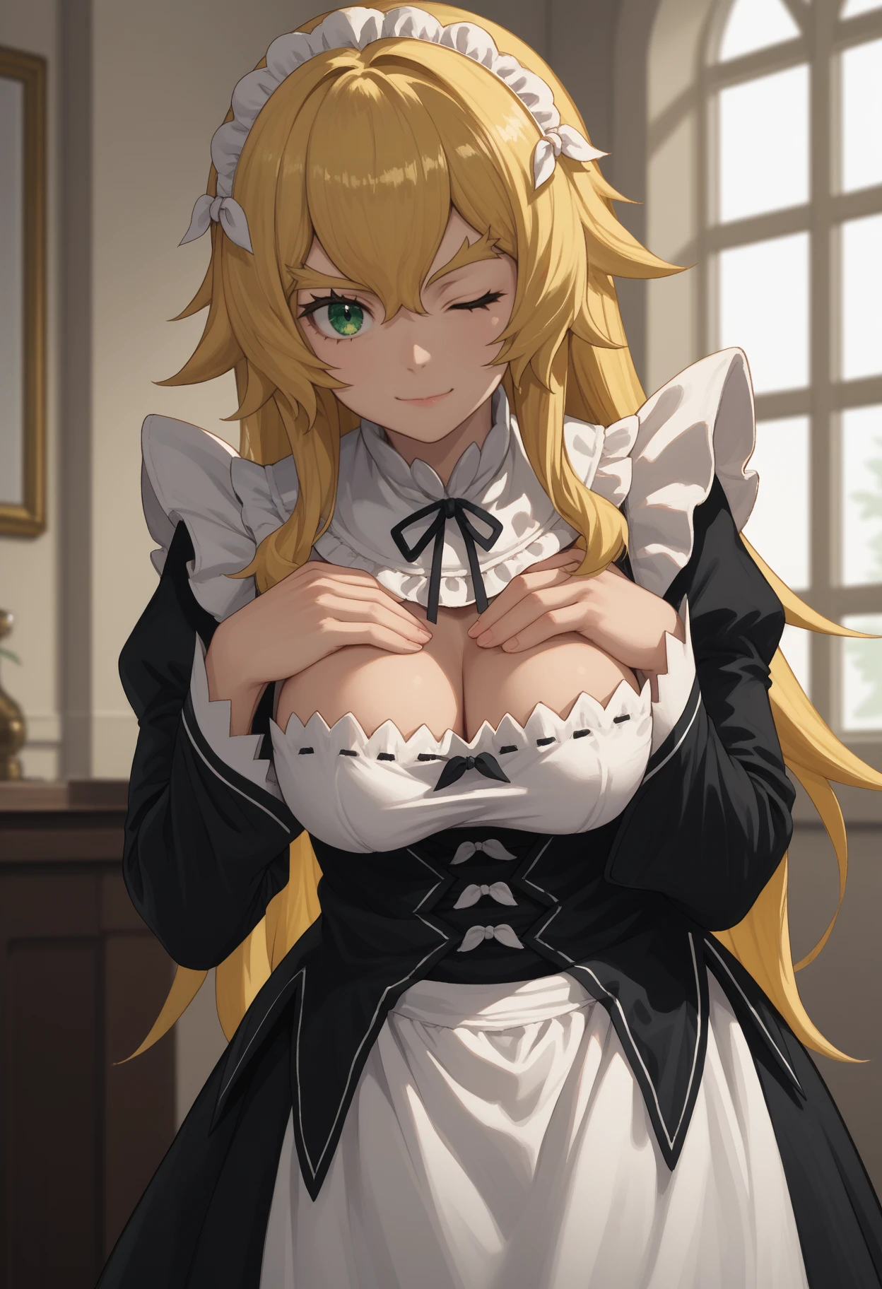 Default Outfit: maid headdress, roswaal mansion maid uniform, frills, black dress, neck ribbon, black ribbon, long sleeves, puffy sleeves, maid apron, waist apron, cleavage