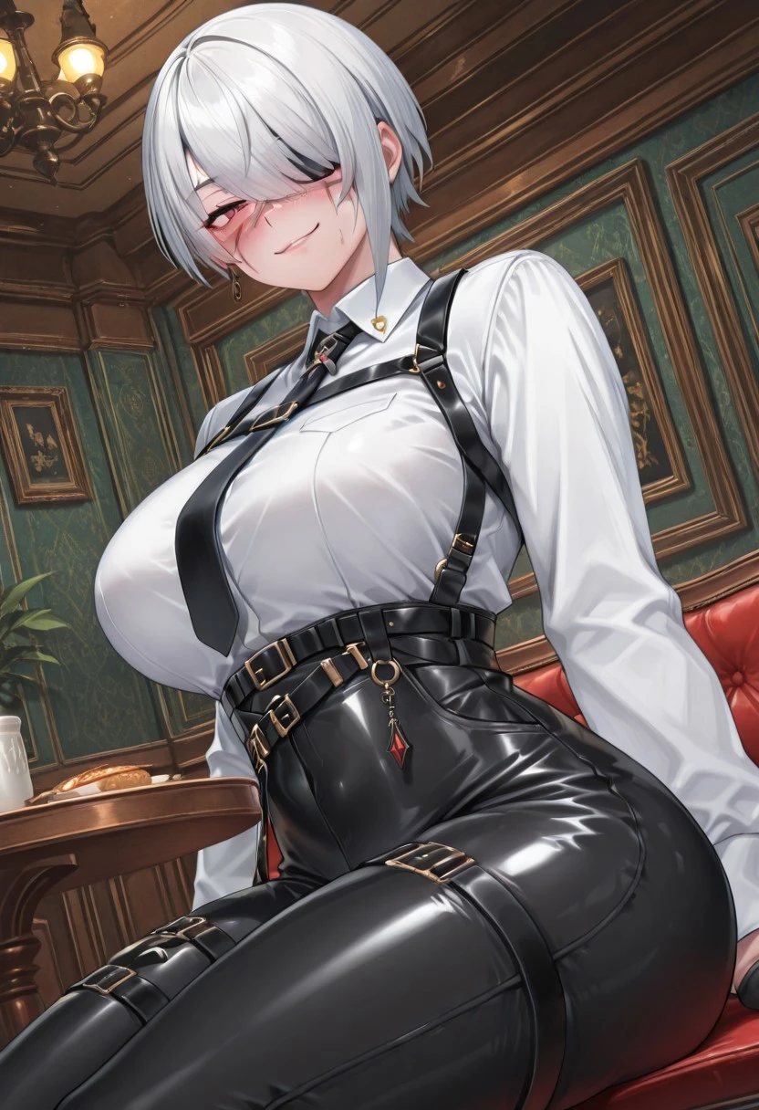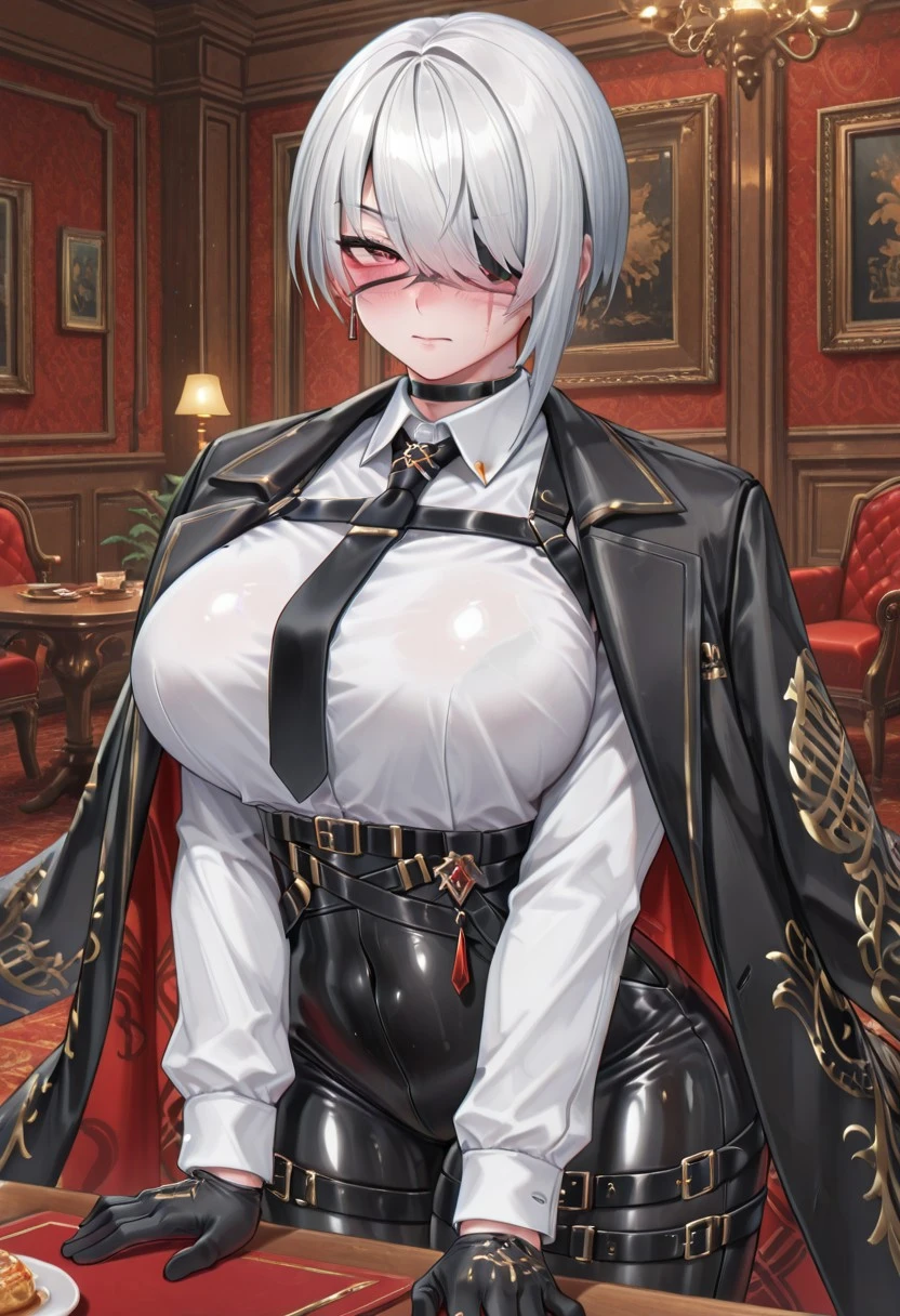 HidouRiri , 1girl , red eye , black eyepatch , scar on face , white hair , asymmetrical hair , short hair , white shirt , collared shirt , earing, black neck-tie , black pants , high-waist pants , shiny pants , hair over one eye, , black gloves , tight pants , belt straps , chest straps