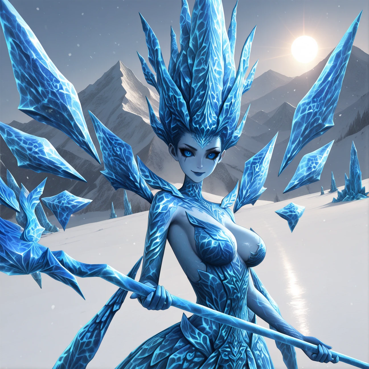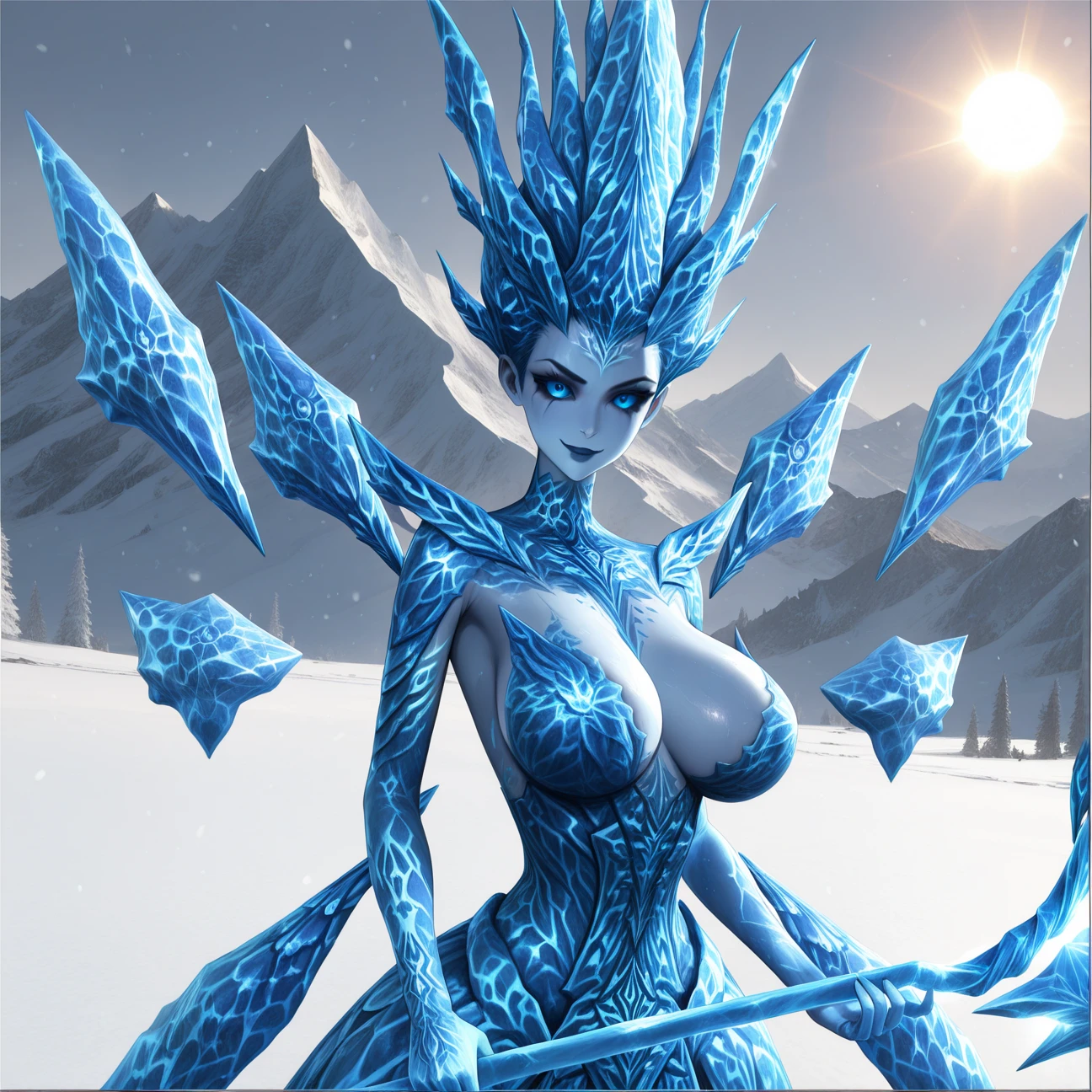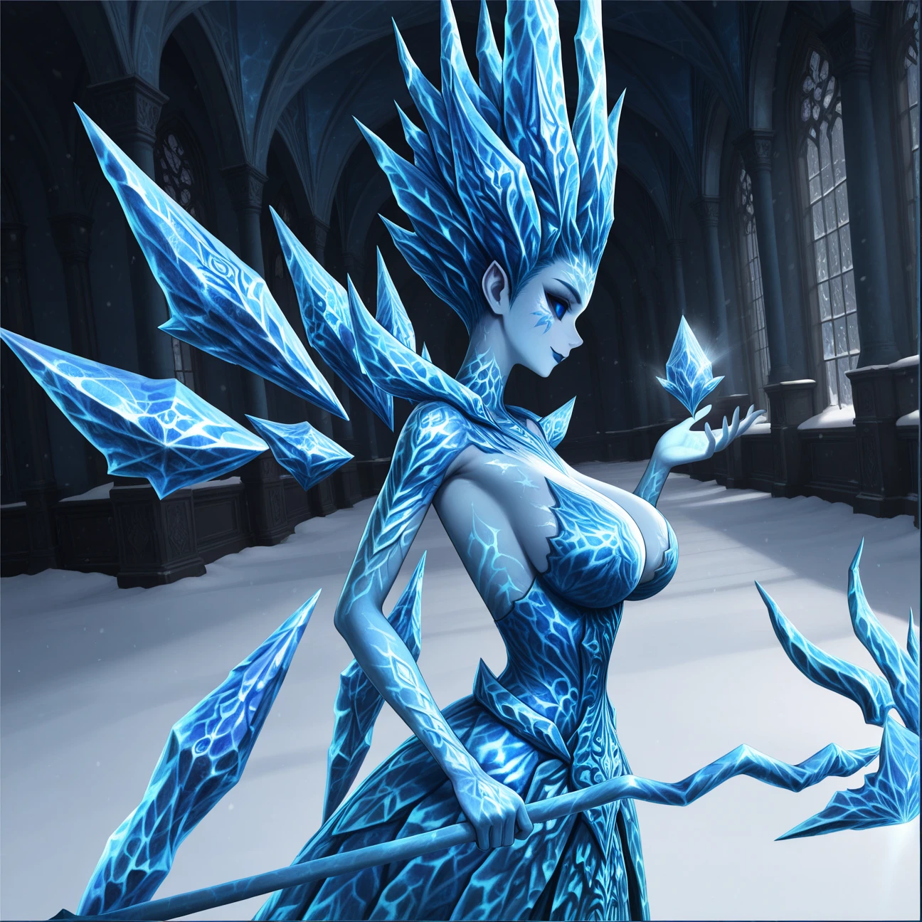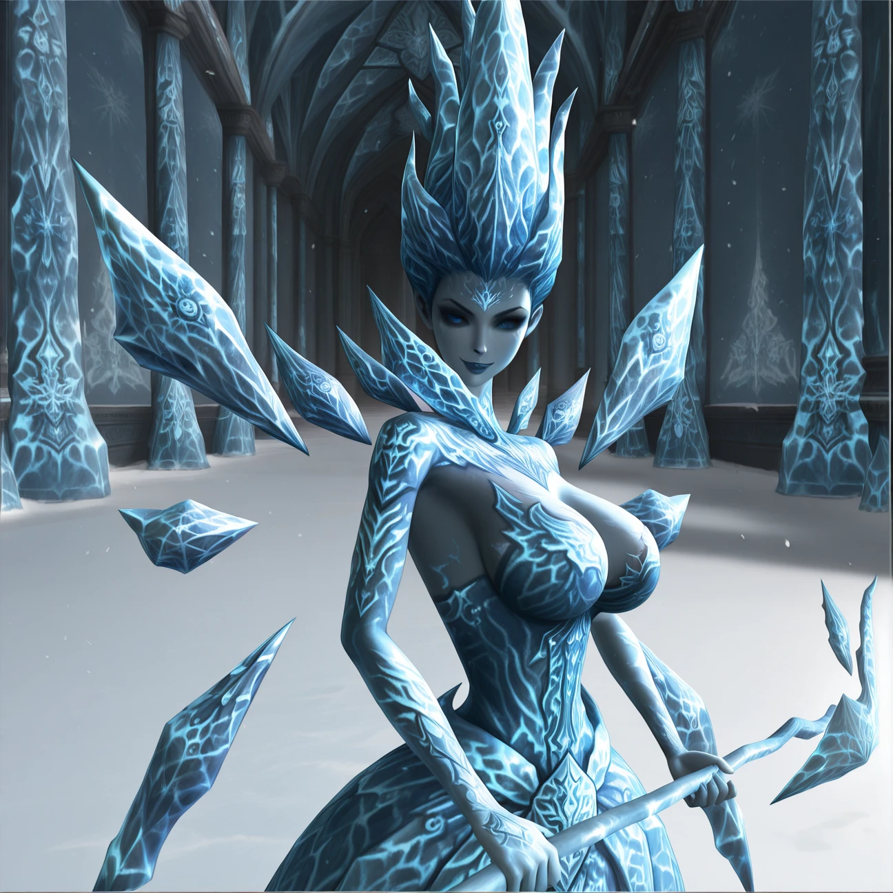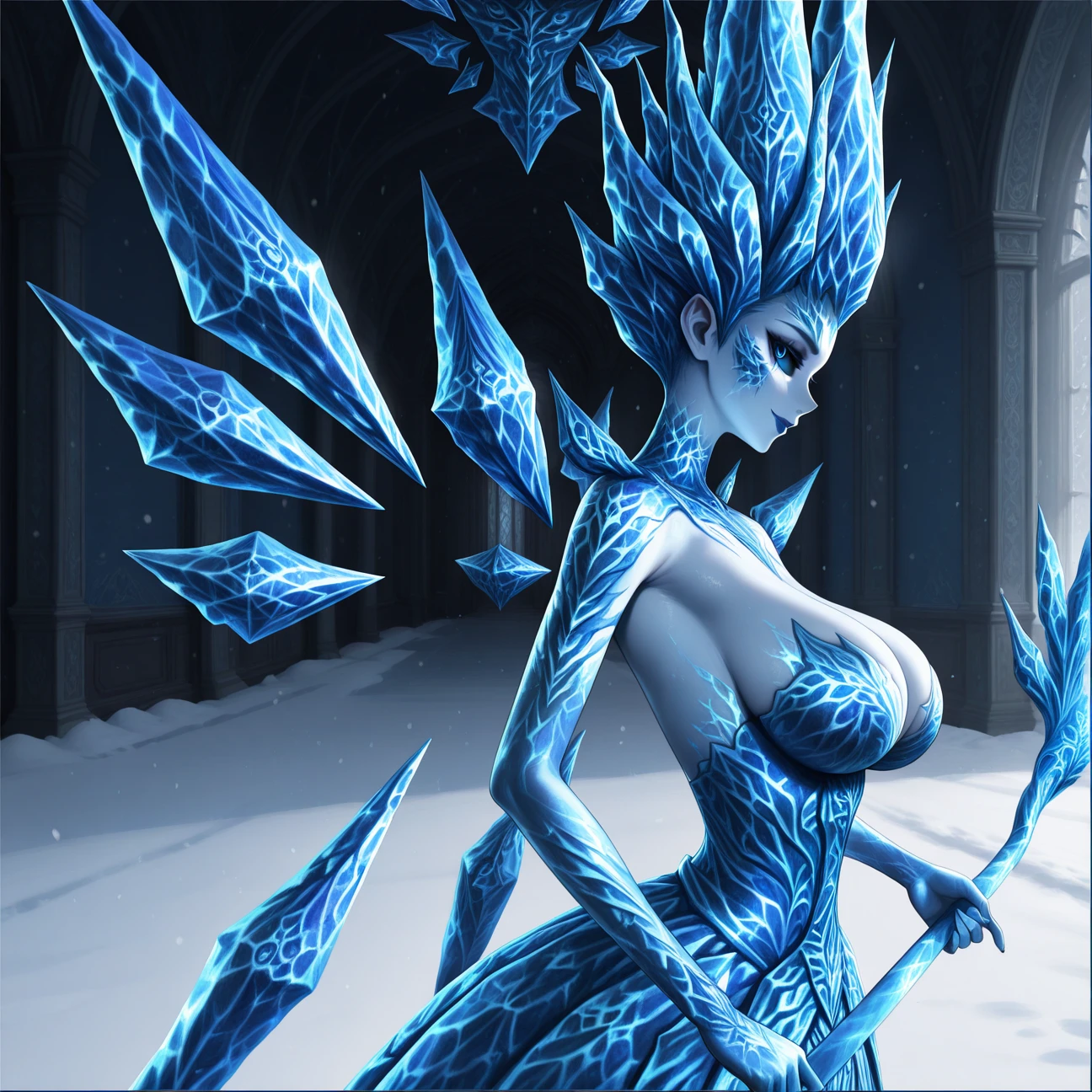 blue eyes, colored skin, blue skin, frozen, blue hair, ice, crystal, ice wings, pointy ears, large breasts