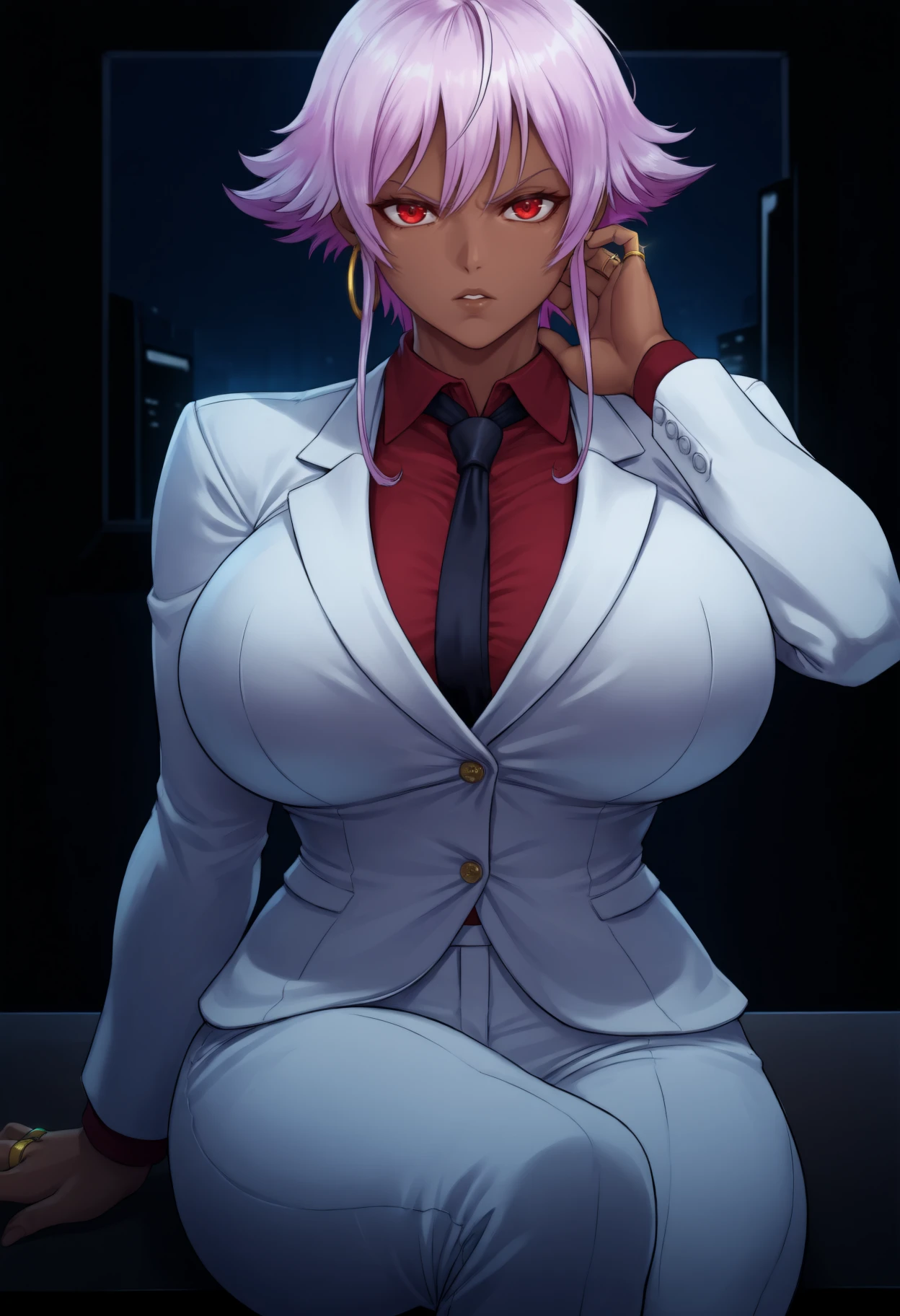 "dark-skinned female, red eyes, pink hair, short hair with long locks, huge breasts"