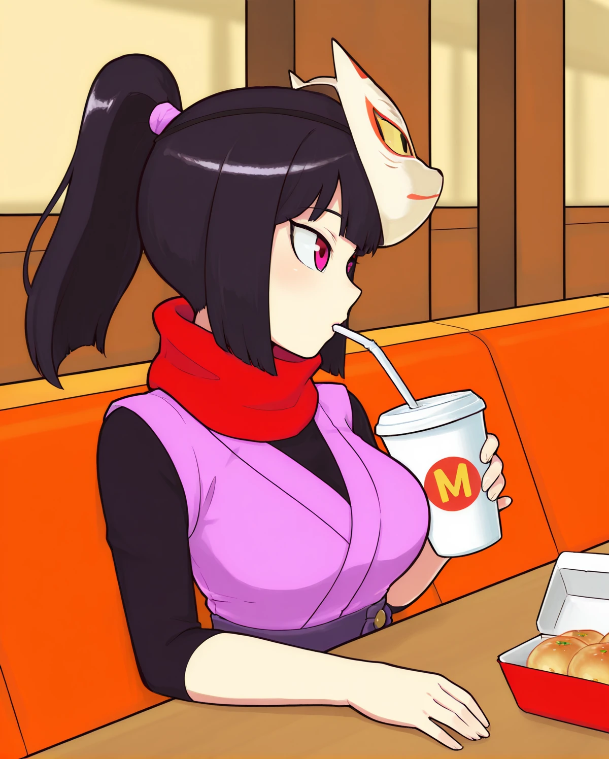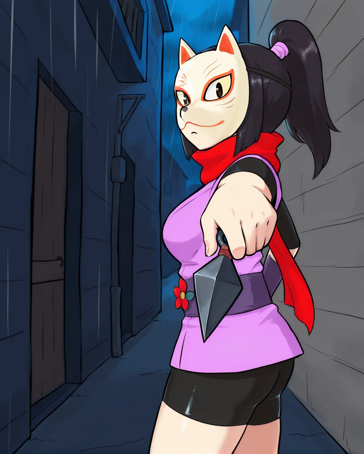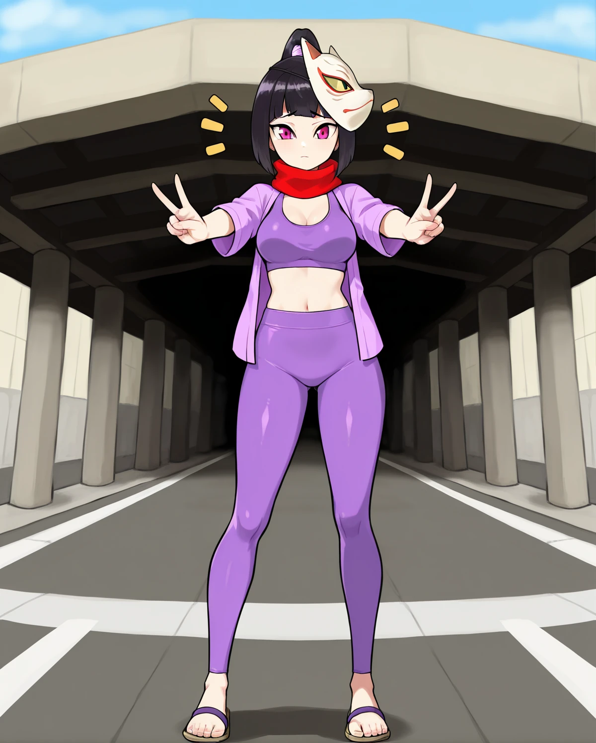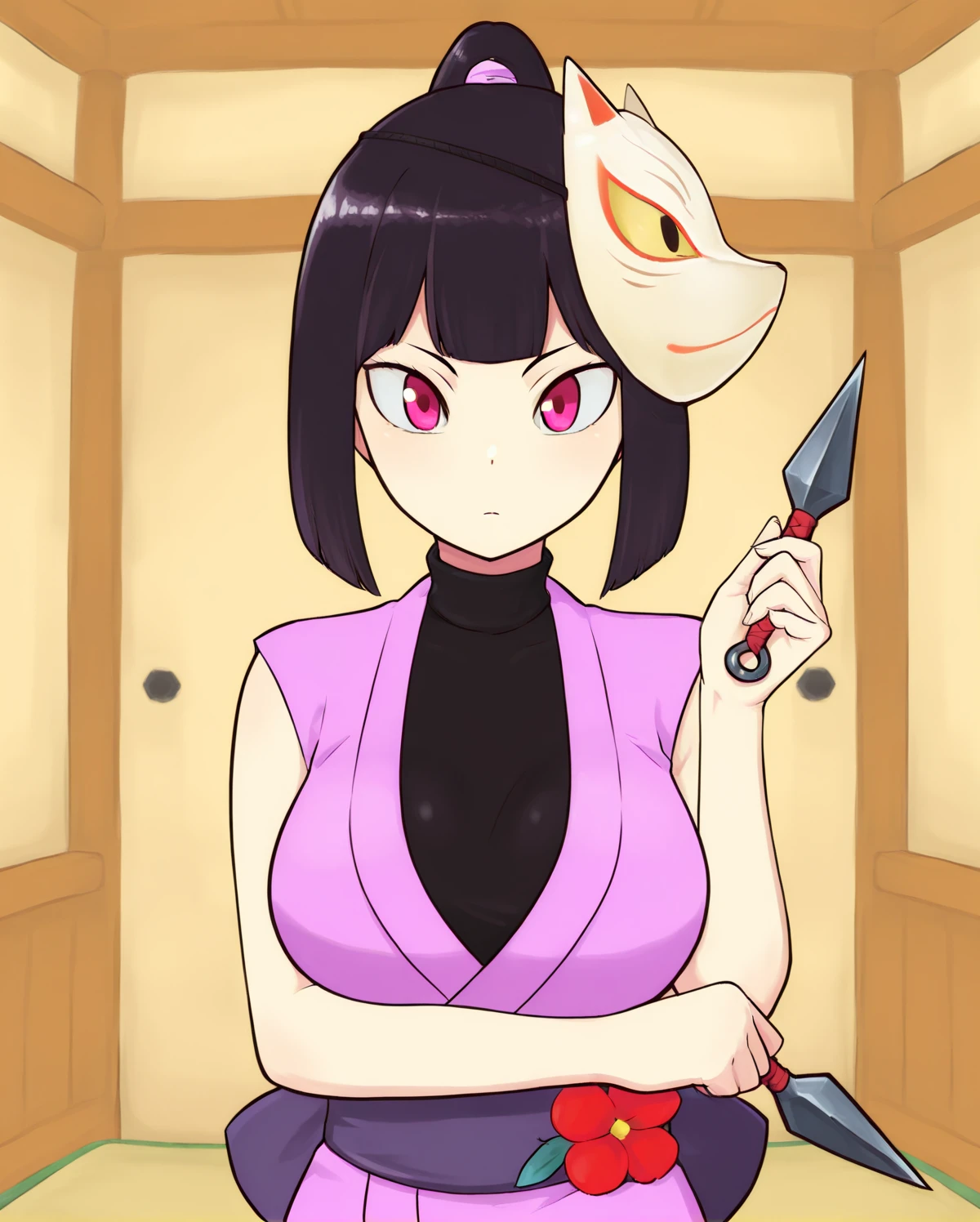 fox mask, mask on head, pink eyes, tsurime, black hair, high ponytail, purple motoyui, red scarf, black undershirt, purple dougi, flower, purple belt, martial arts belt, black shorts, bike shorts, sandals