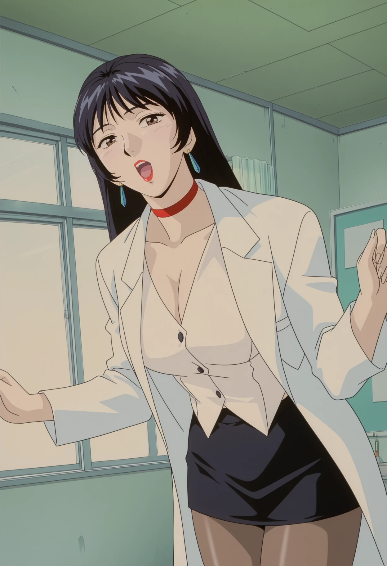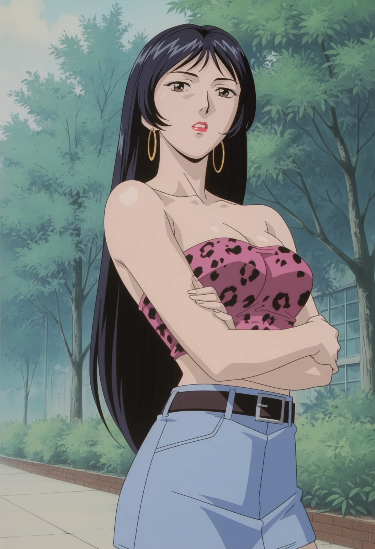 1girl,solo,mm,mature female,long hair,black hair,earrings,lipstick,brown eyes,retro artstyle,anime coloring