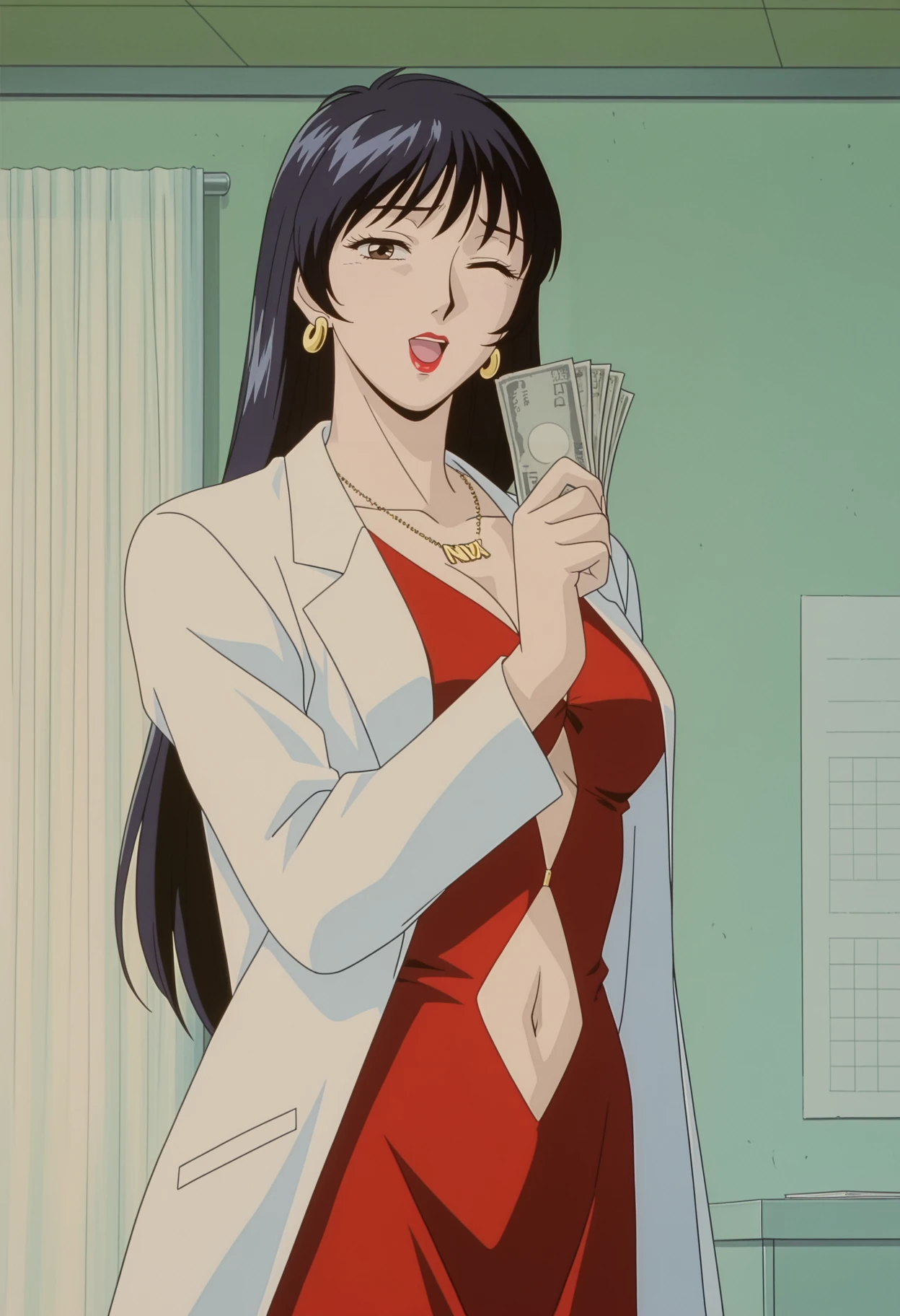 lab coat,necklace,red dress,clothing cutout,underboob cutout,navel cutout