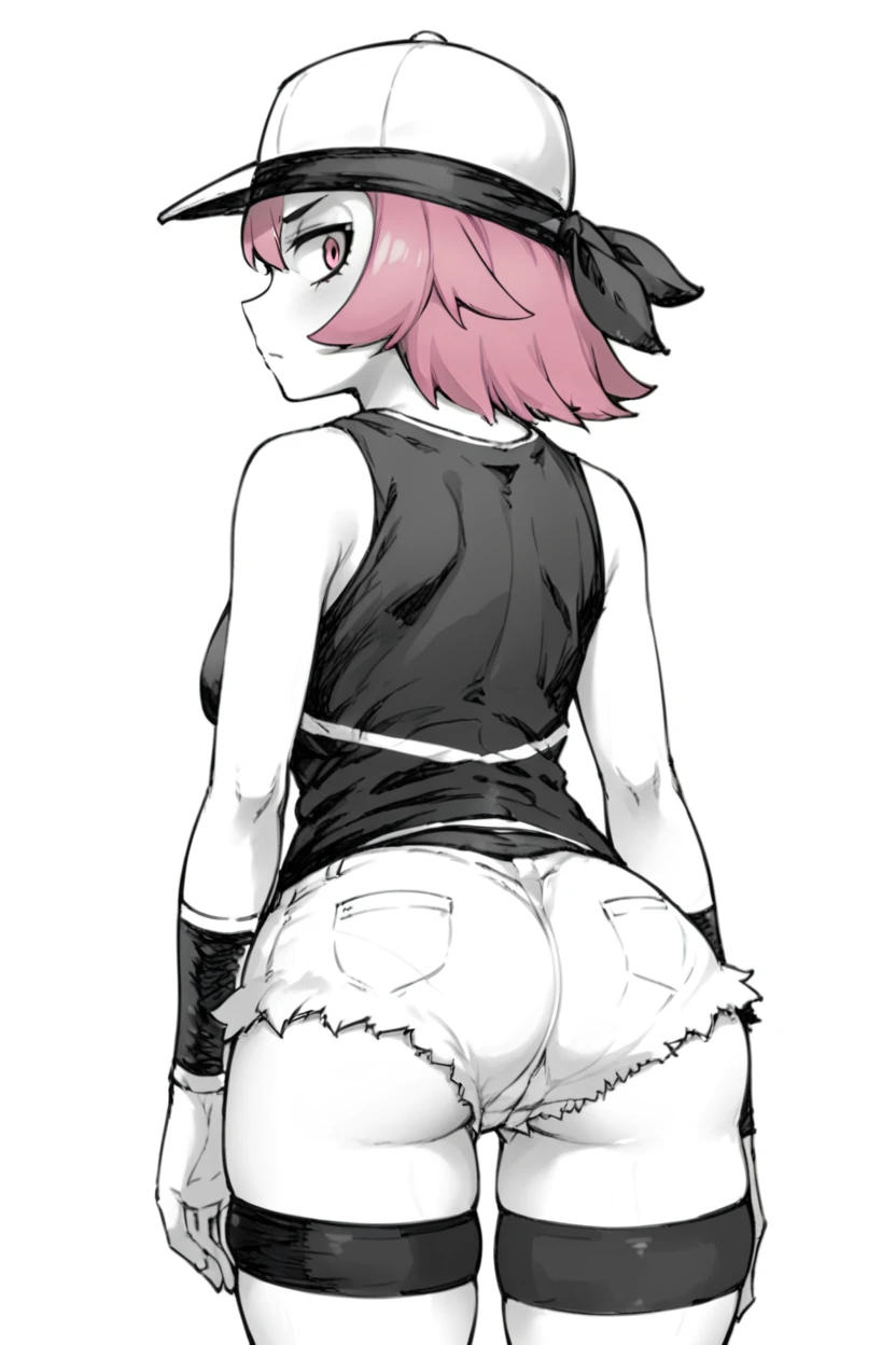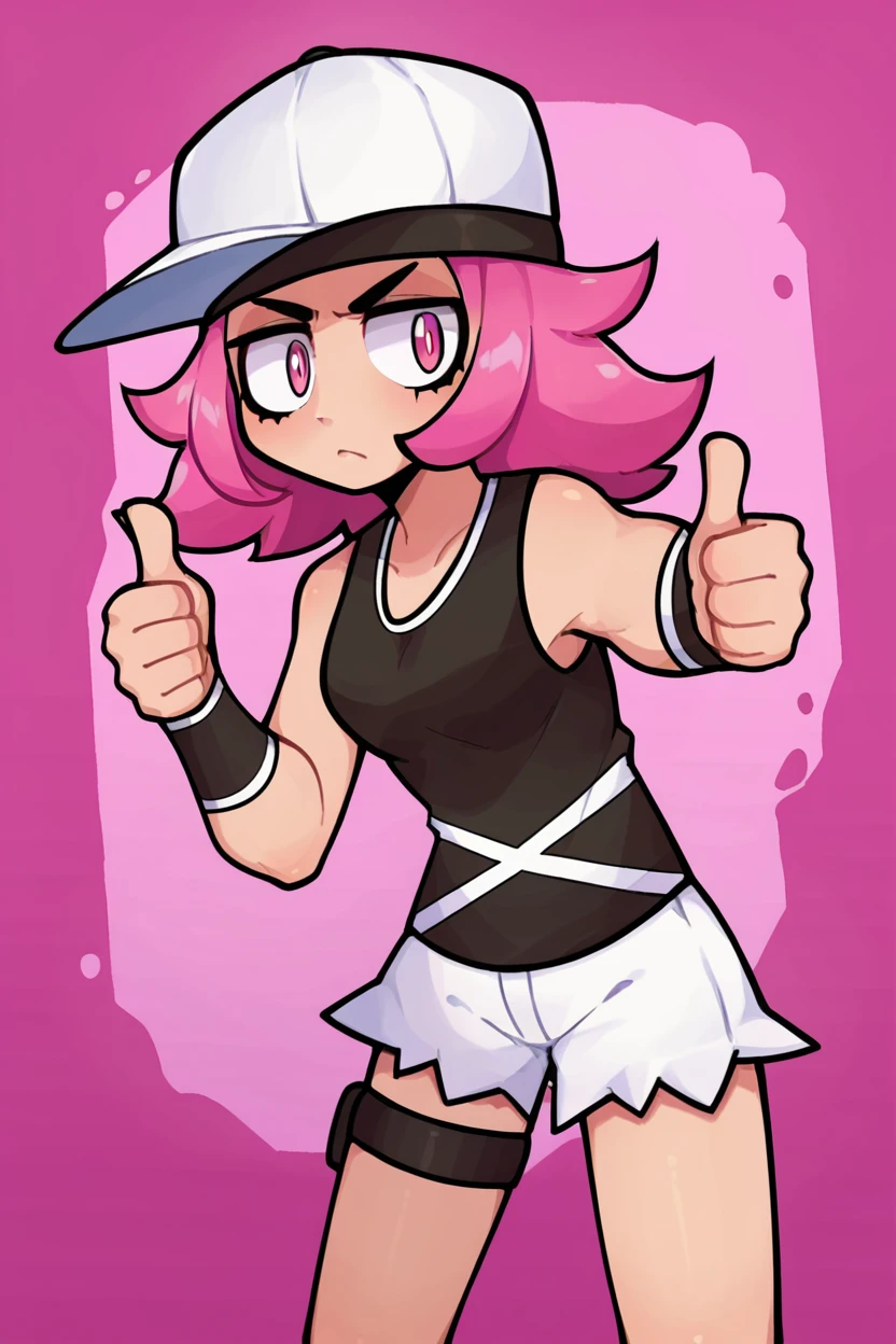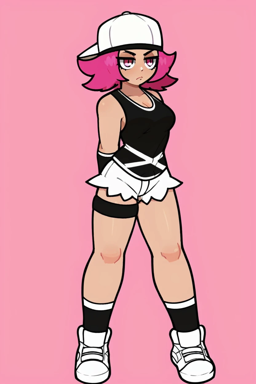 Key word is punkgirlsm also use: baseball cap, black bandana, black tank top, sleeveless, white shorts, pink hair, pink eyes, wristbands, thigh strap