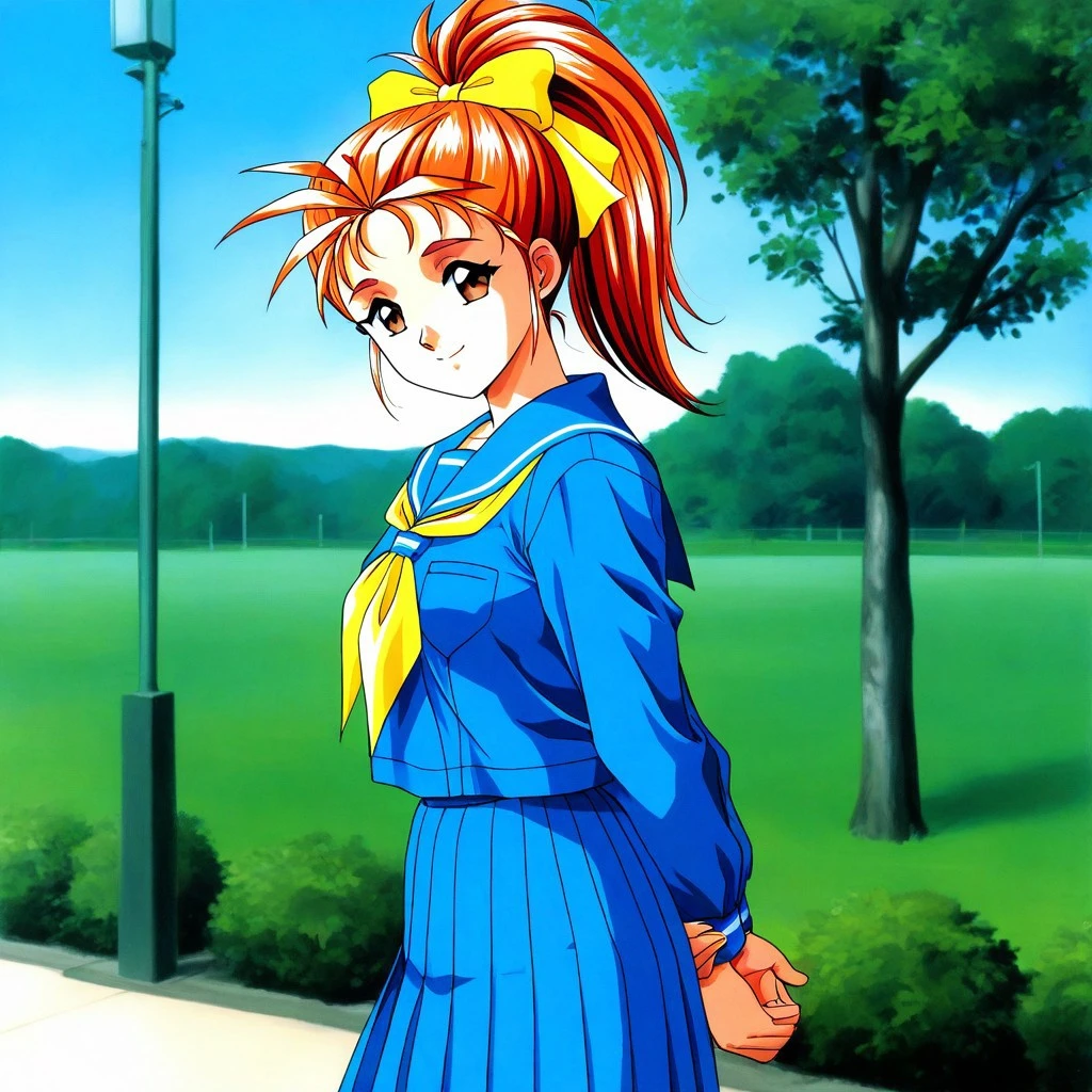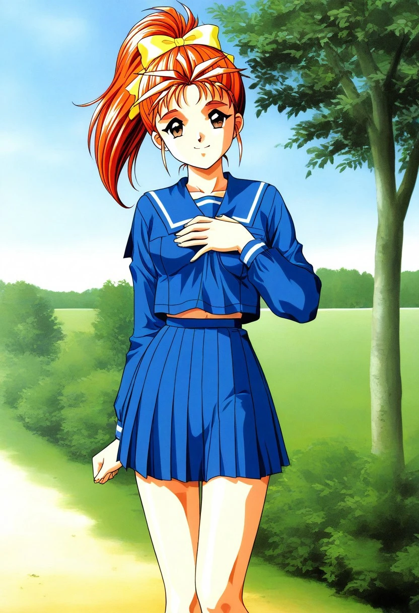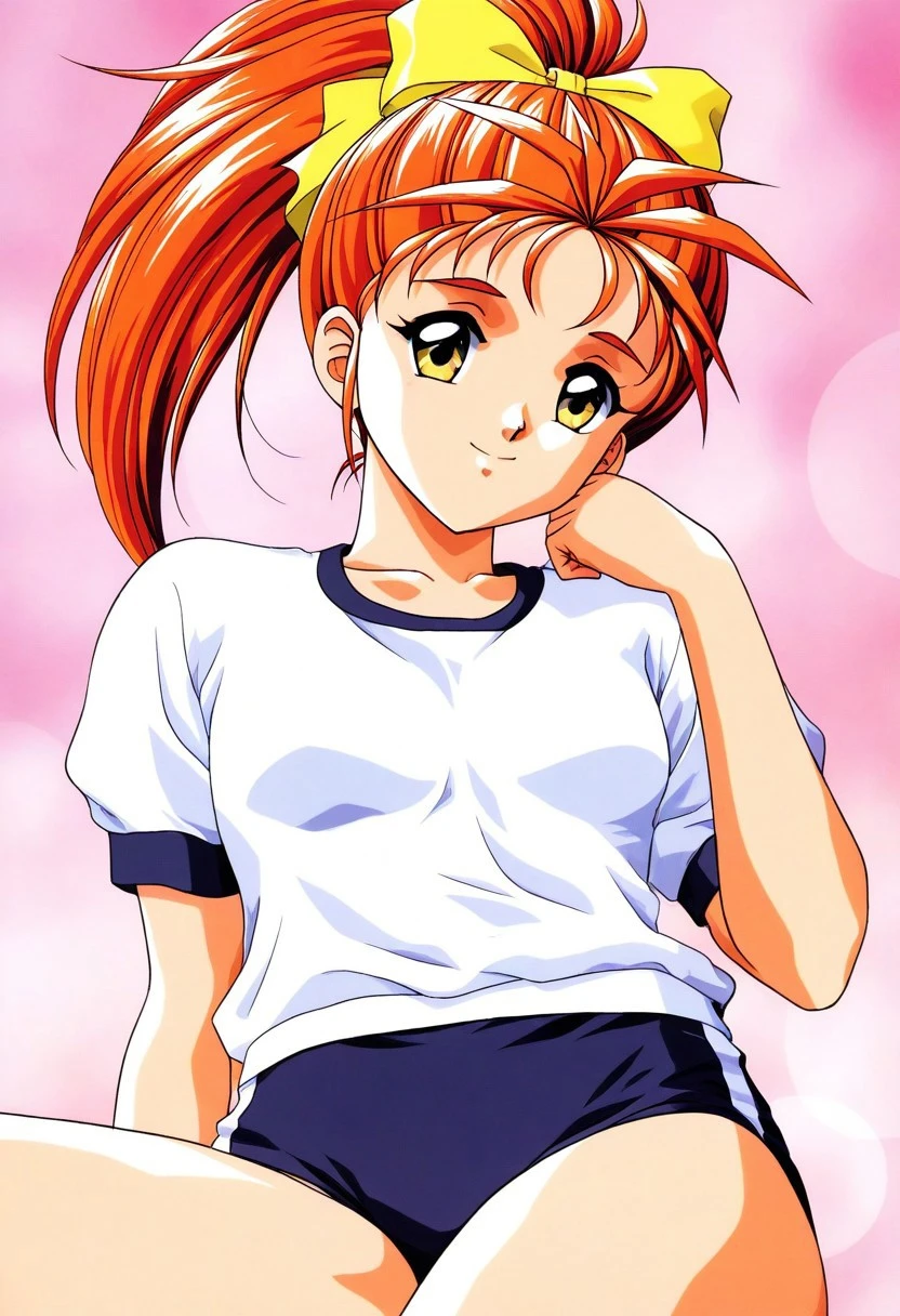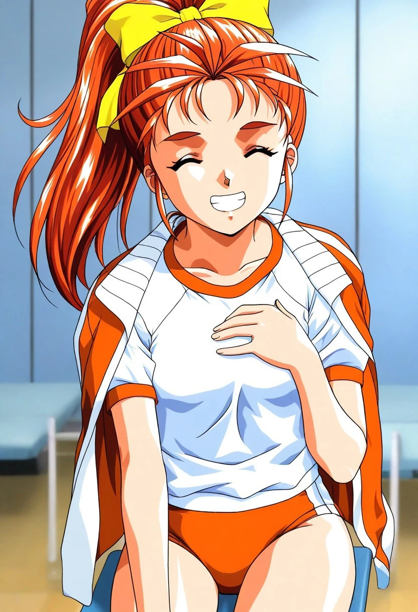 Saotome_Yumi, 1girl, brown eyes, orange hair, hair bow, high ponytail, long hair, small breasts,