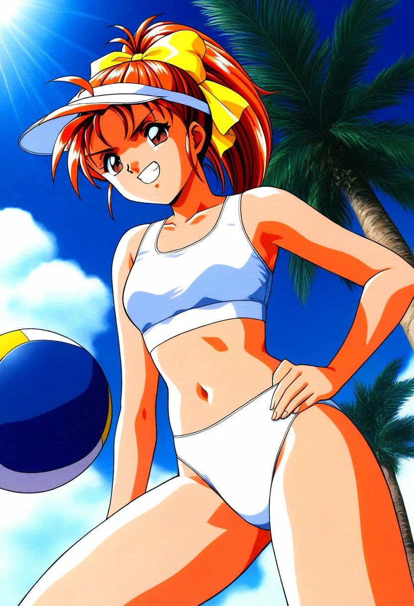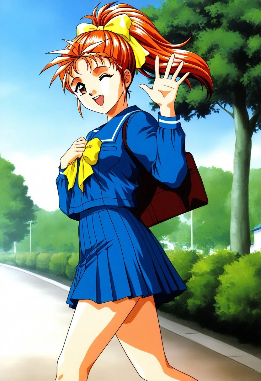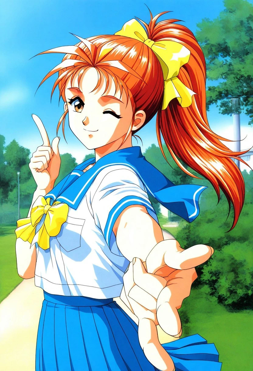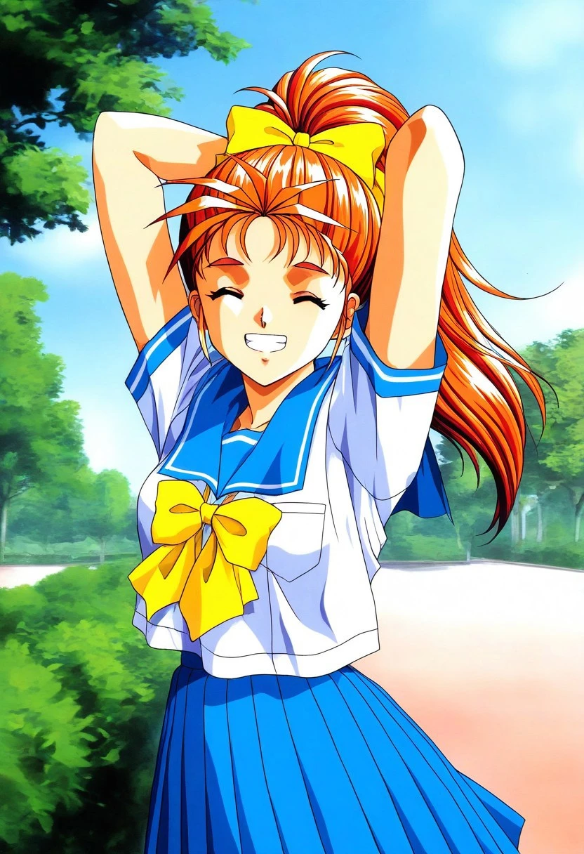 Saotome_Yumi, 1girl, brown eyes, orange hair, hair bow, high ponytail, long hair, small breasts,