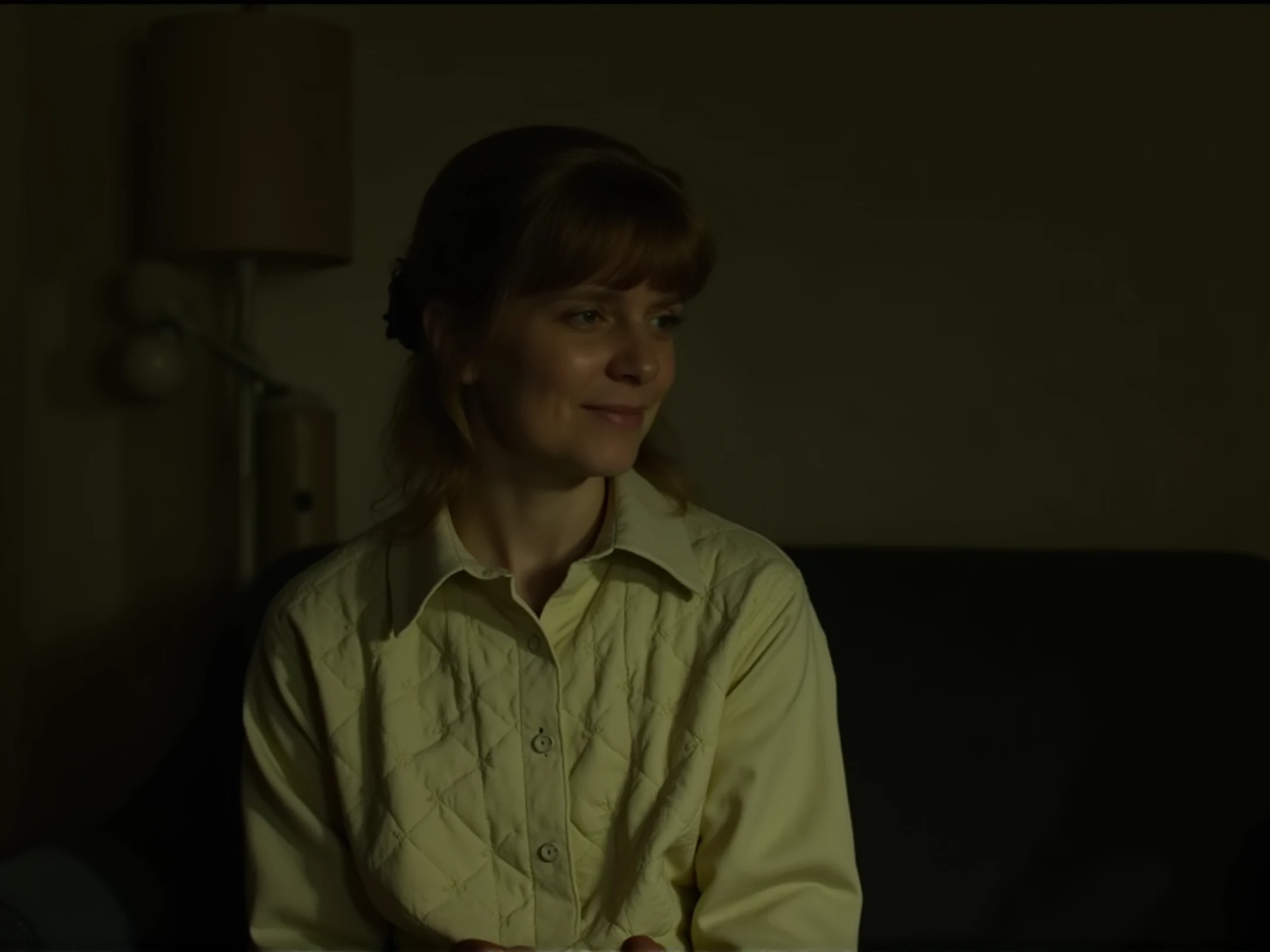 F1nch3r 1970s photo, A redheaded woman sitting on a couch in a dimly lit room, wearing a crown of pale roses and light-colored shirt with a quilted pattern.