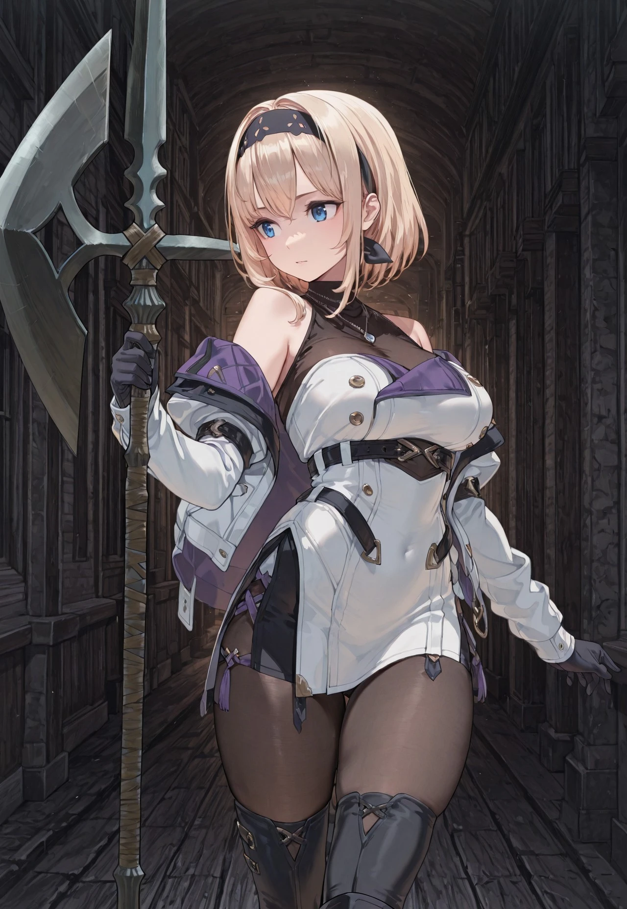 Trigger : 1girl, solo, blonde hair, blue eyes, necklace, short hair, bangs, hairband,