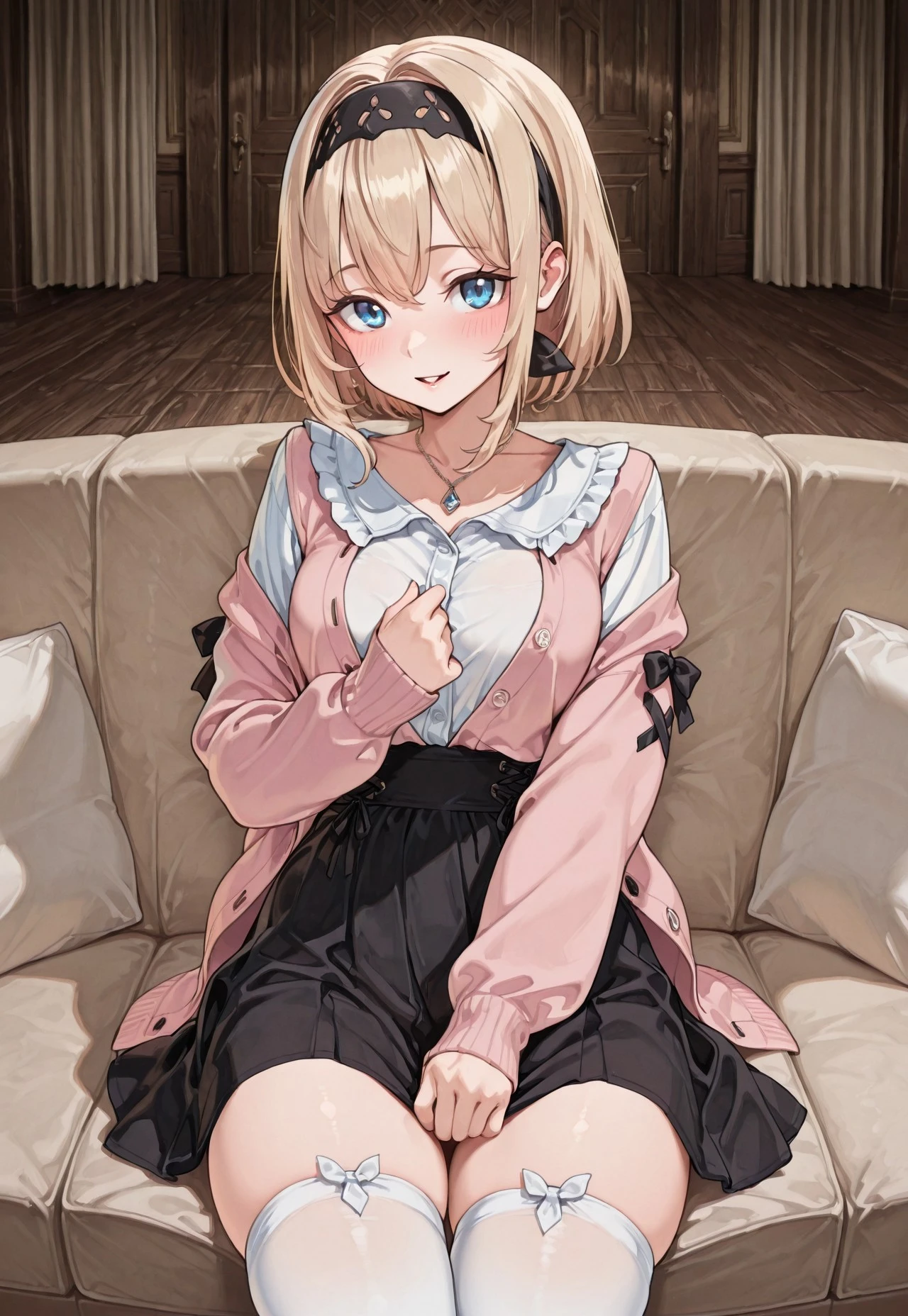 1girl, solo, blonde hair, blue eyes, necklace, short hair, bangs, hairband,