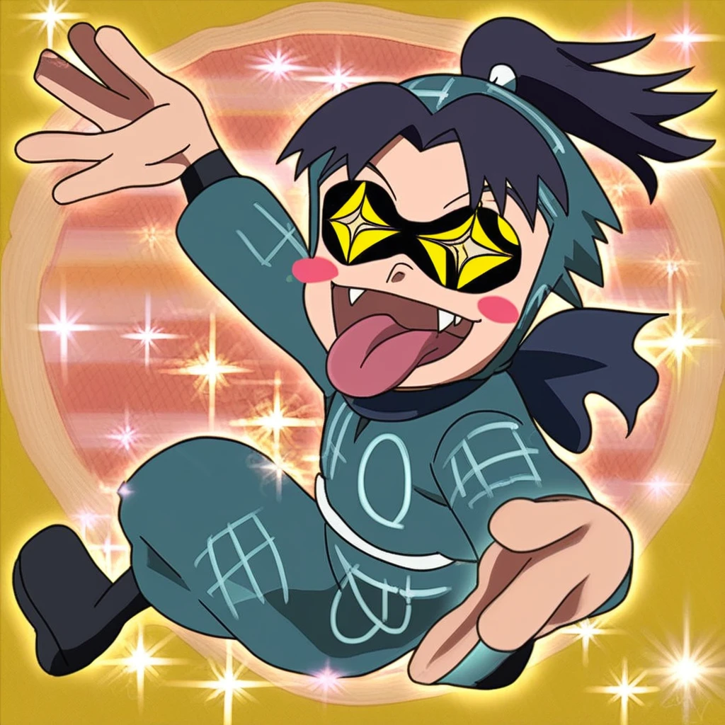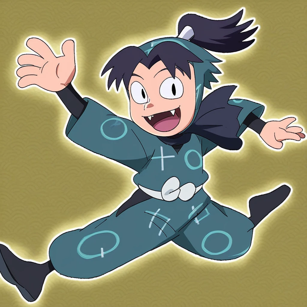 male focus, 1boy, ponytail, solo, black hair, japanese clothes, ninja, open mouth, long sleeves, black footwear, full body, parody, bangs, fang, solo focus, pants, black eyes