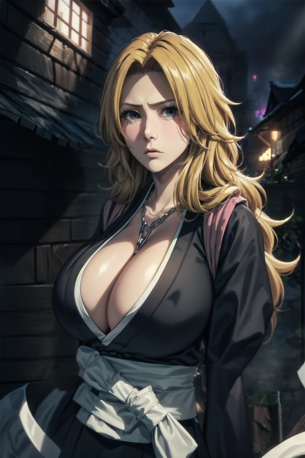 Recommended Tags: blonde hair, orange hair, blue eyes, grey eyes, long hair, cleavage, wavy hair, black kimono, silver chain, pink shawl, black wide sleeves, white sash
