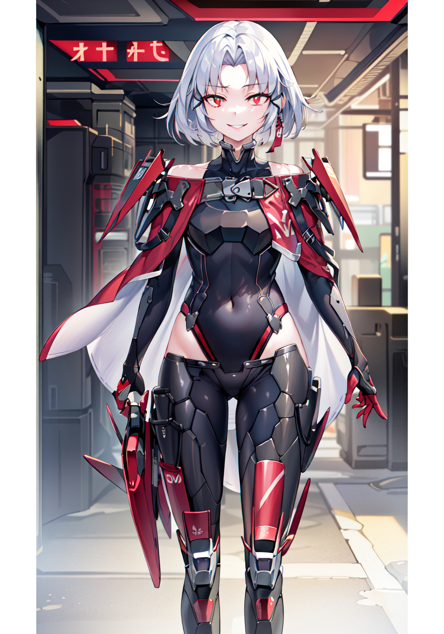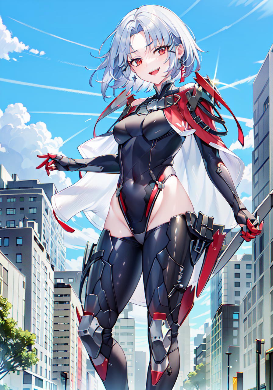 with armor= "OrigFullArm, full armed, cape, mechanical armor"
