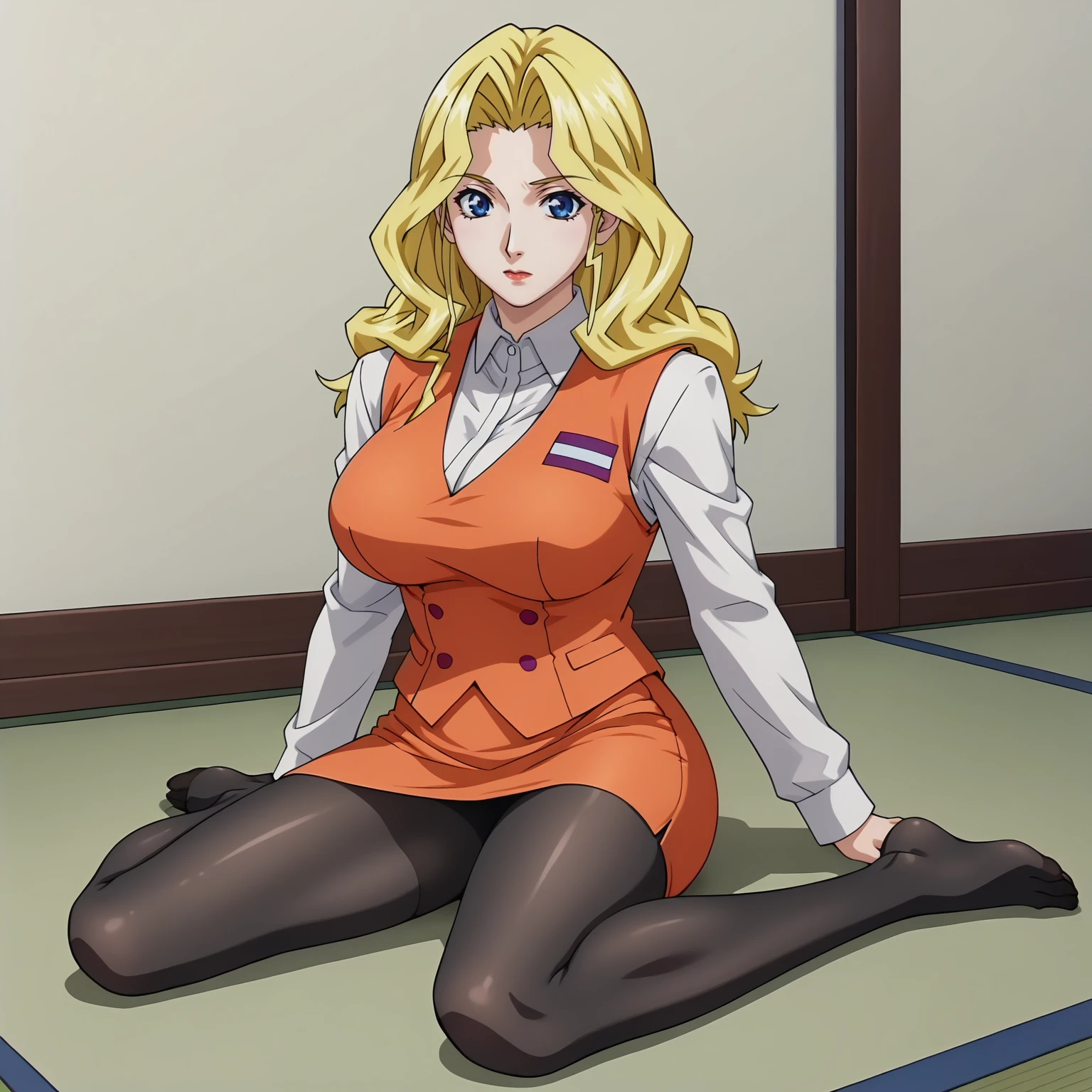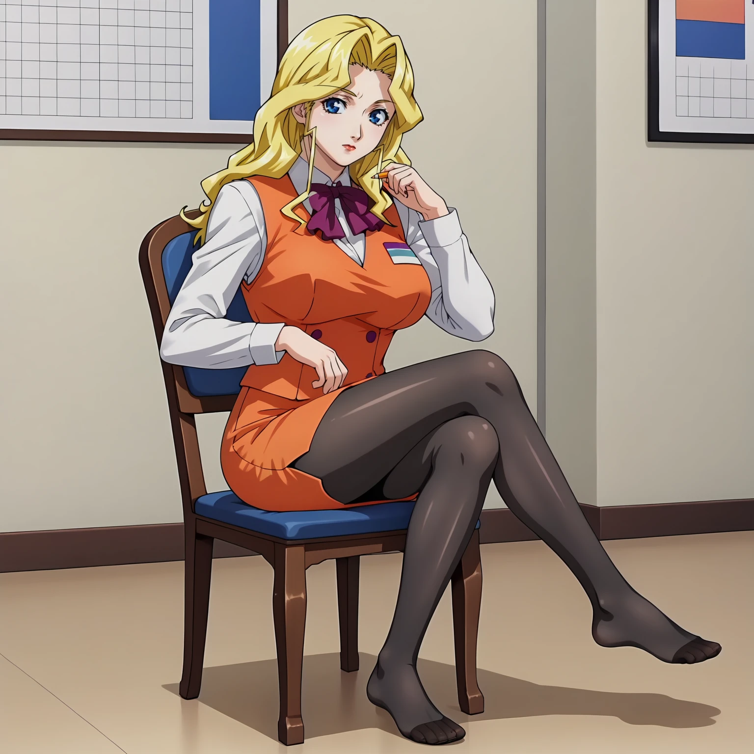 white shirt,long_sleeves,purple bowtie,orange vest, orange pencil_skirt, black pantyhose,