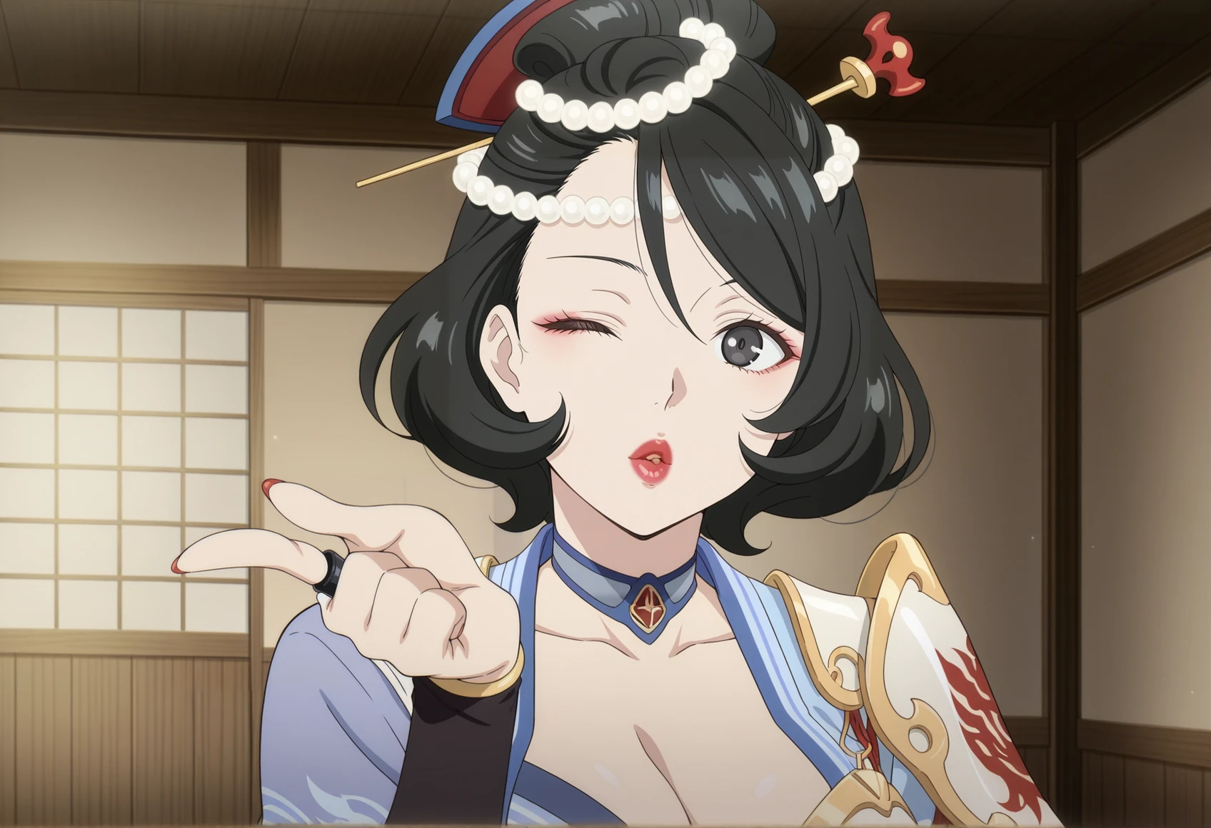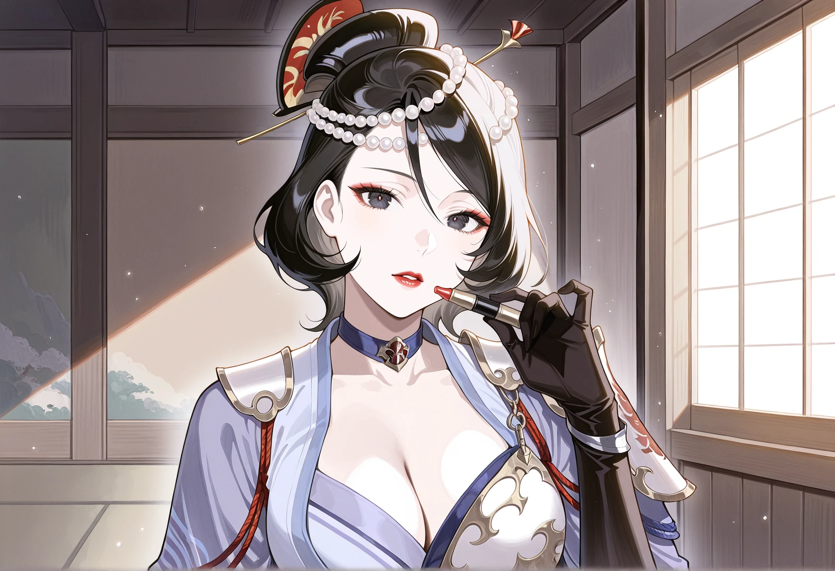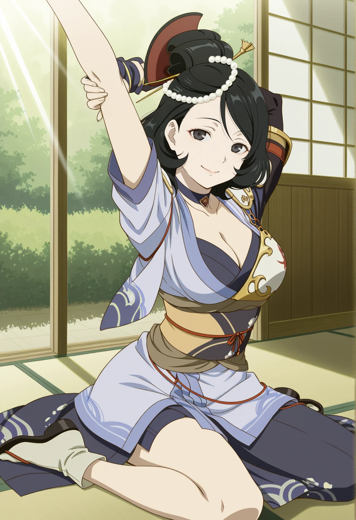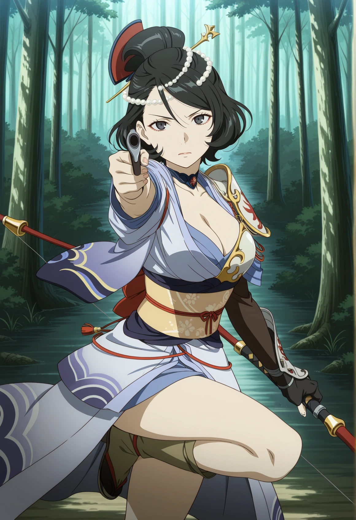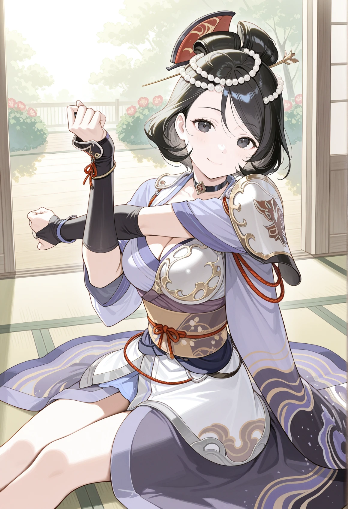 black hair, black eyes, pearl hair ornament, single hairbun, comb, choker, cleavage, japanese clothes, single shoulder pad, asymmetrical clothes, asymmetrical armwear, side slit