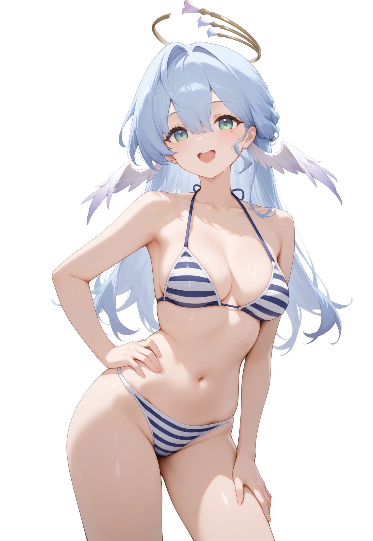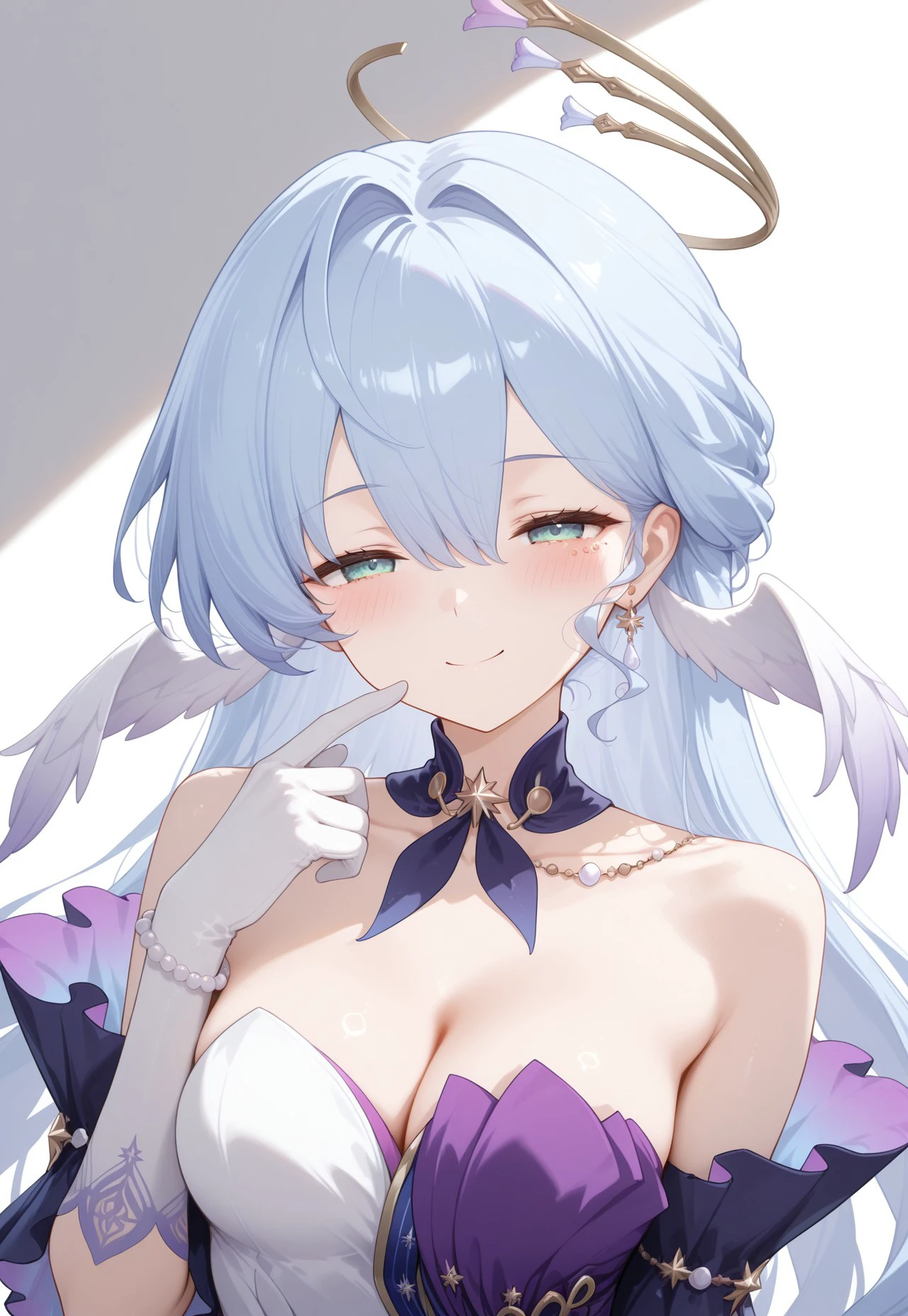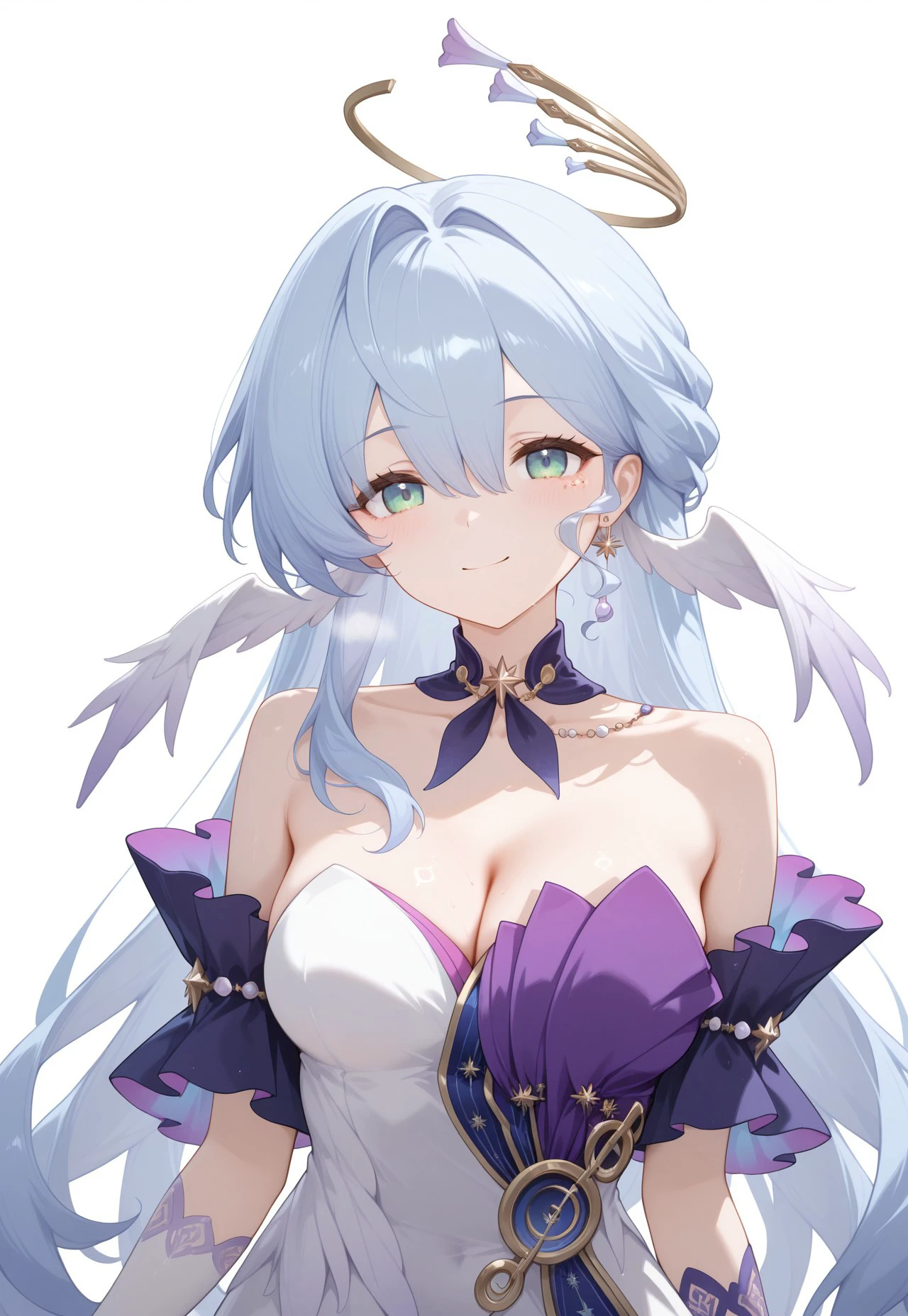 RobinHSR, 1girl, breasts, green eyes, long hair, blue hair, halo, wings, head wings, bangs, hair between eyes, hair intakes