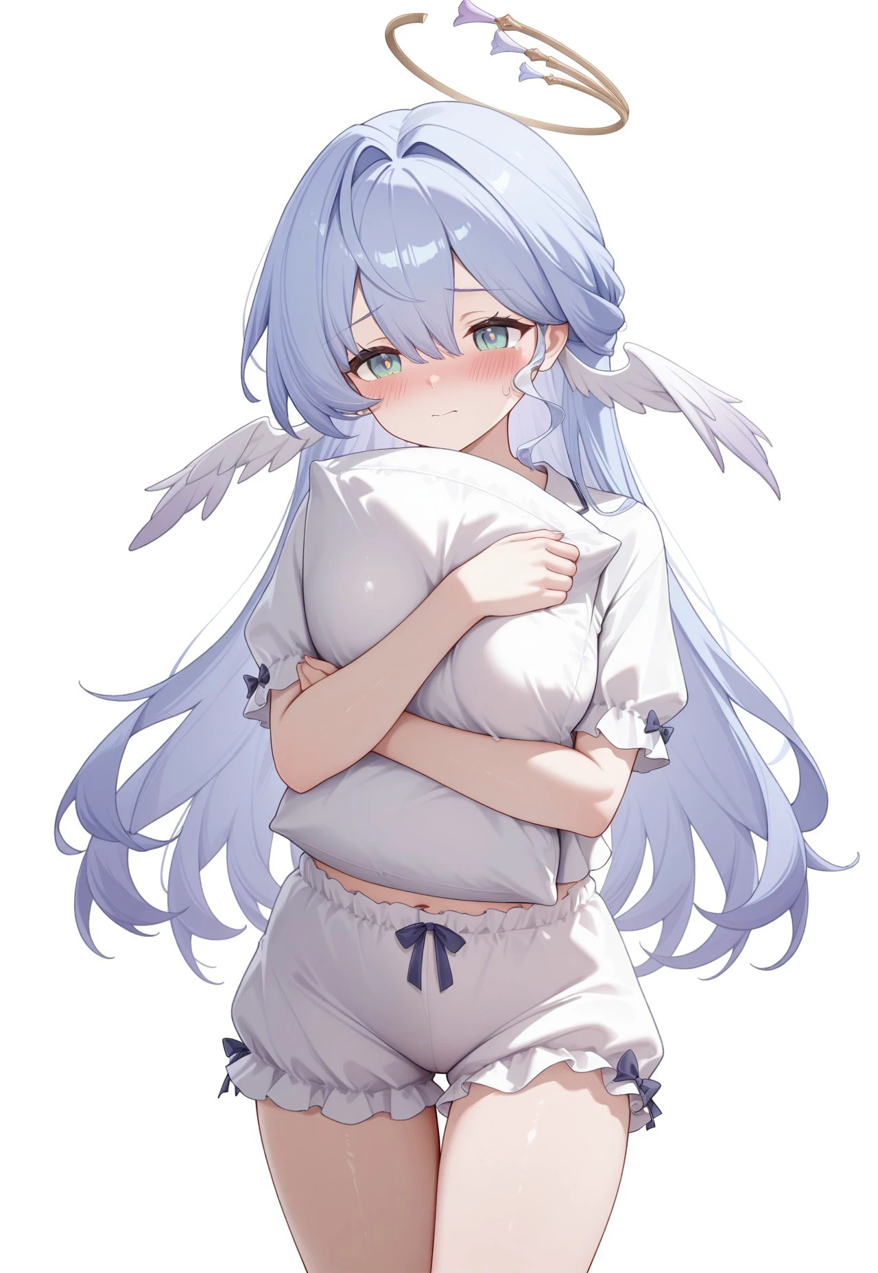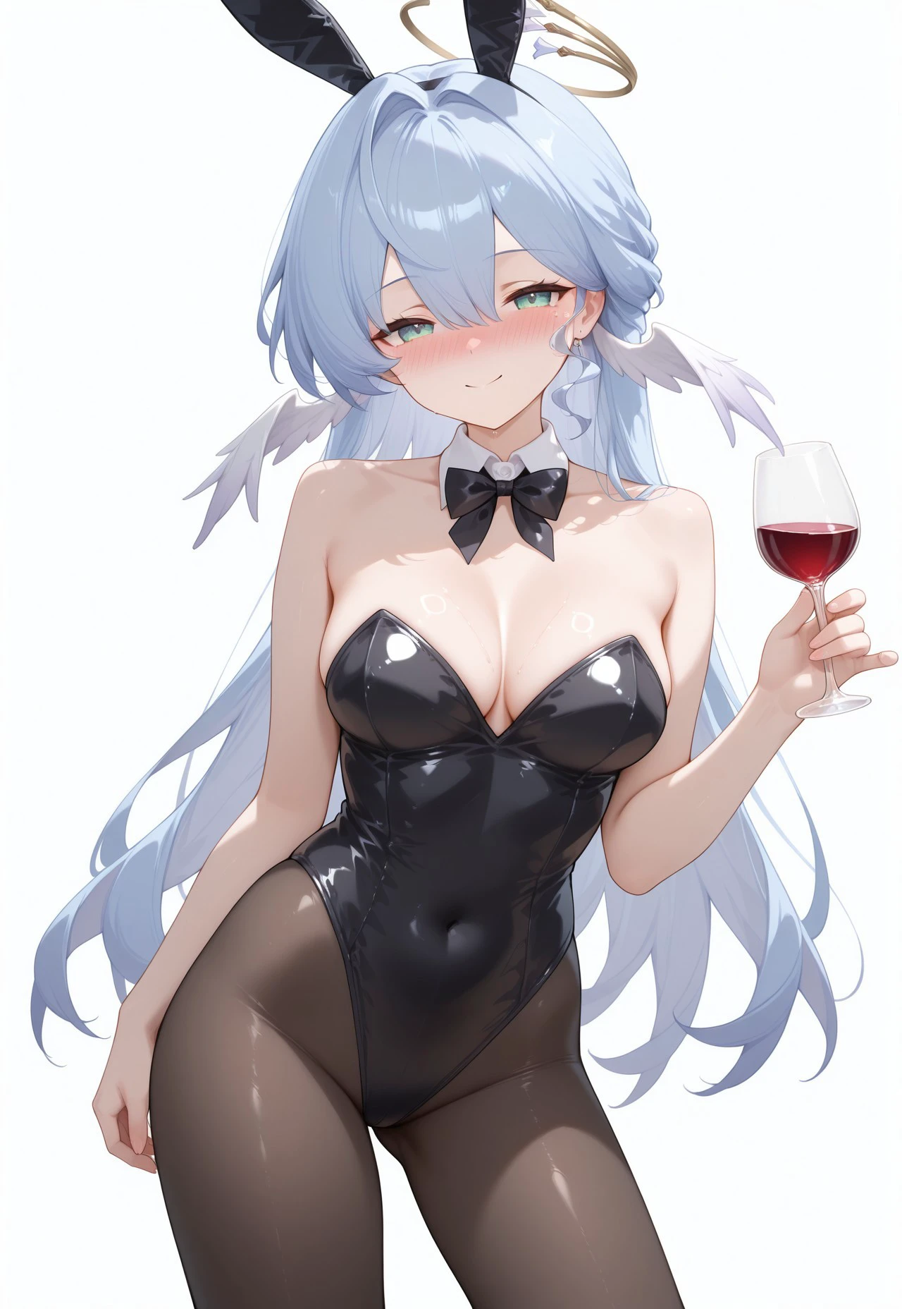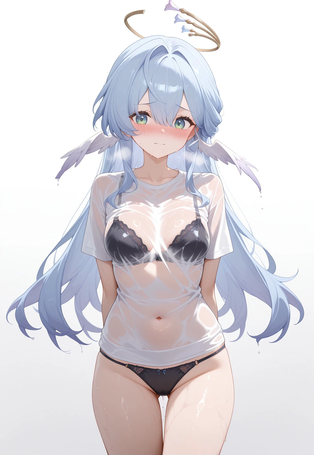 RobinHSR, 1girl, breasts, green eyes, long hair, blue hair, halo, wings, head wings, bangs, hair between eyes, hair intakes