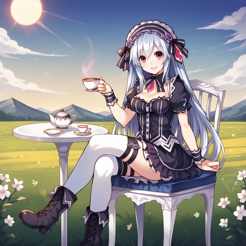 Tia_Def, white thighhighs, purple eyes, blue hair, long hair, jewelry, frilled skirt, layered skirt, frilled dress, white skirt, black dress, black skirt, buttons, cleavage, detached collar, black ribbon, neck ribbon, gem, lolita hairband, puffy short sleeves, wrist cuffs, frills, thigh strap, purple gemstone,Alt Outfit: